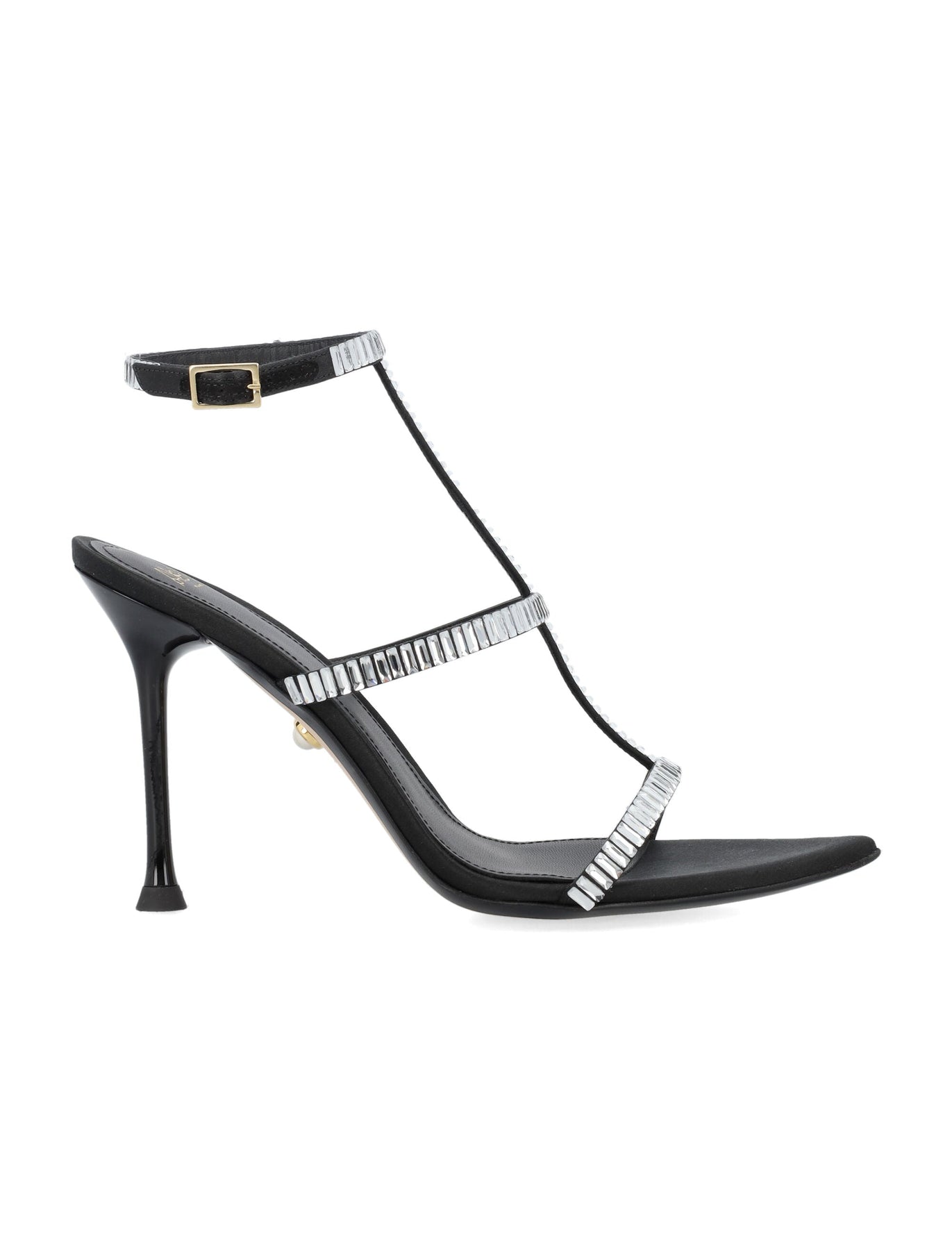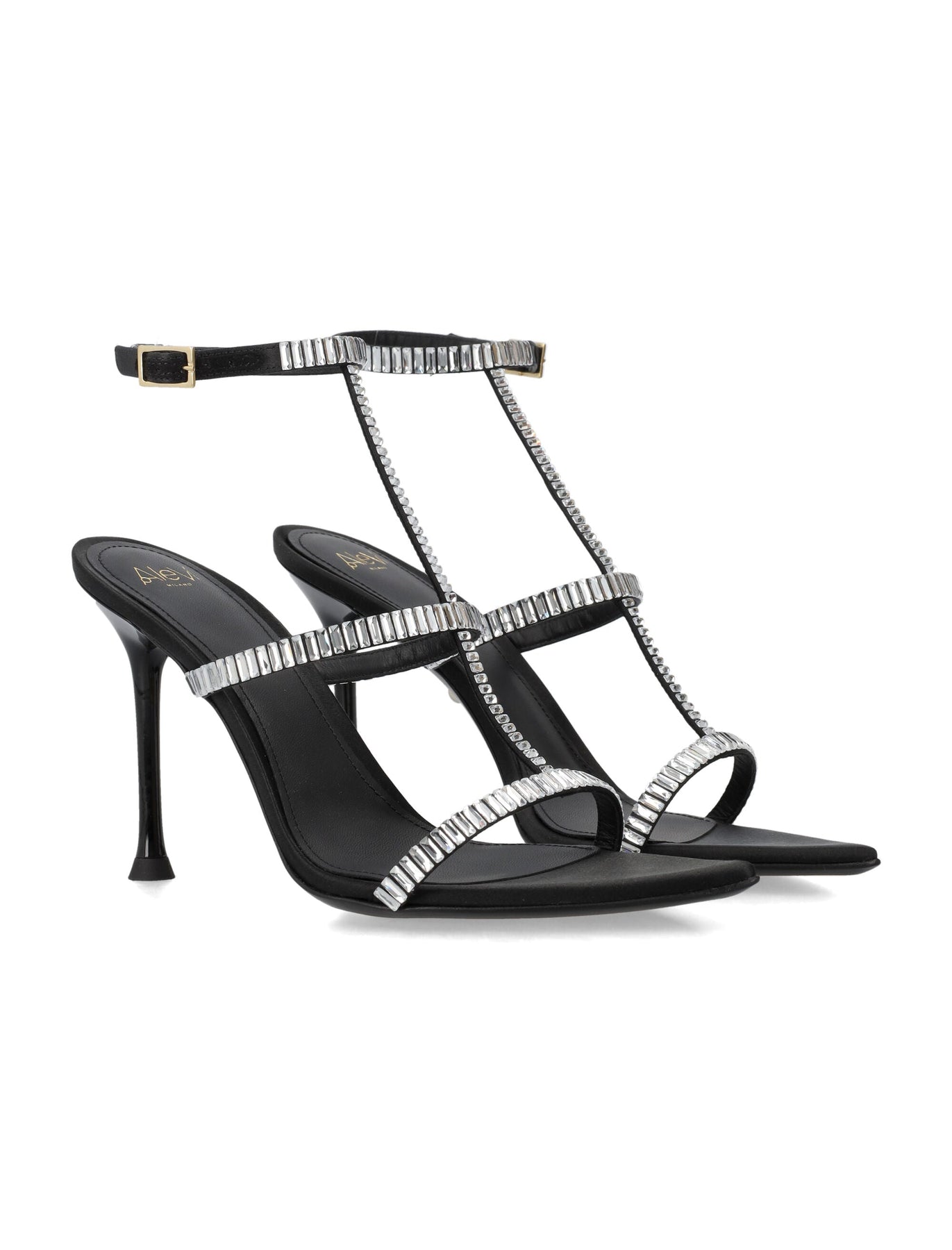 Indulge in the epitome of elegance and luxury with these exquisite sandals by AlevÃ. The Lisa Sandals are a timeless masterpiece, featuring a sleek slip-on style and a stunning gloss ankle strap with an adjustable buckle for the perfect fit. The pointed open toe and decorative rhinestones add a touch of glamour, while the stiletto heel elevates your look to new heights. Crafted with a viscoce upper, leather insole, and sole, these sandals are as comfortable as they are stylish.