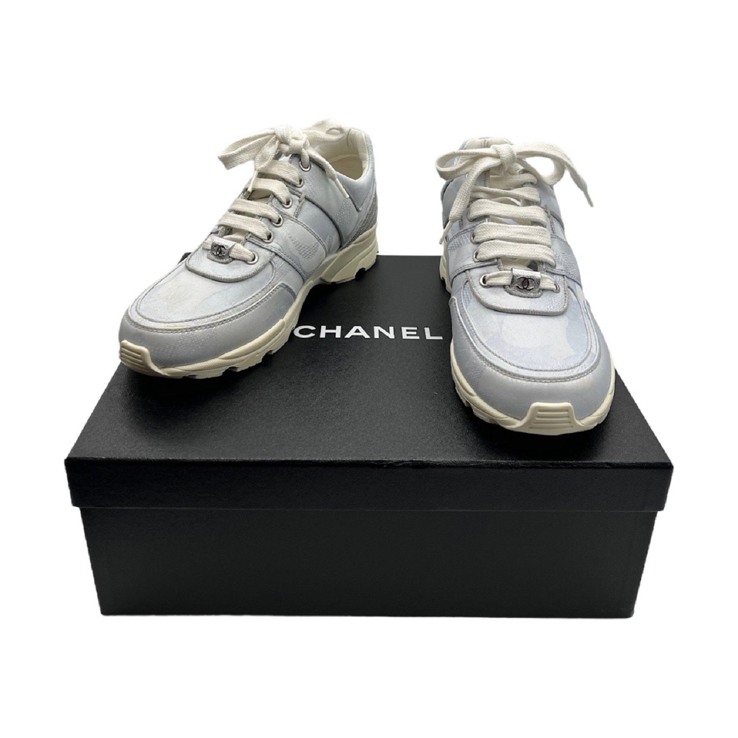 Sky blue canvas Chanel Shoes round-toe low-top sneakers with tonal stitching, silver-tone interlocking CC accents at vamps, rubber soles and lace-up closures at uppers. The shoes have never been worn but have small stains on the interior and exterior. Very minute that can be cleaned. NOTE: This style typically runs narrow and a half size small.