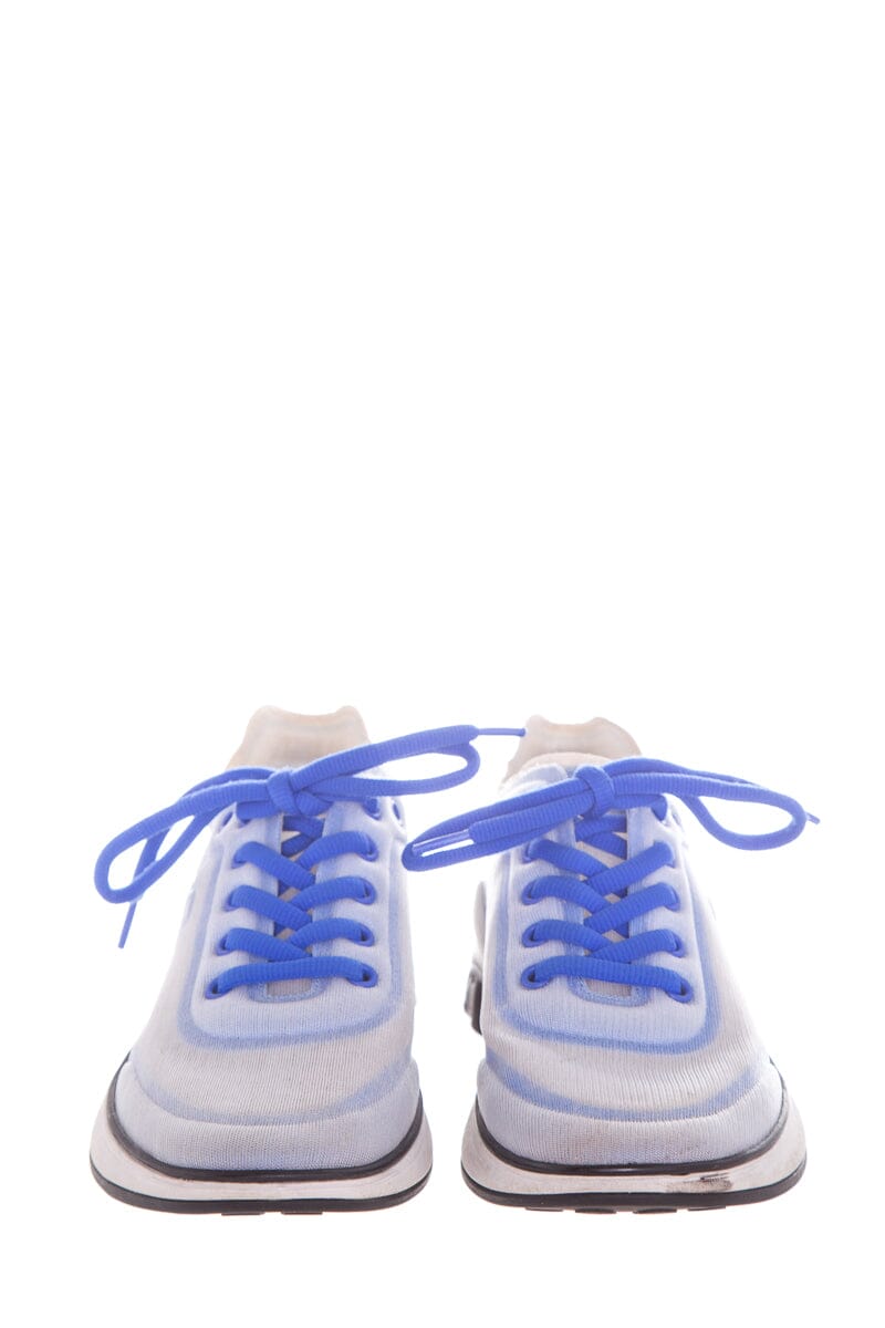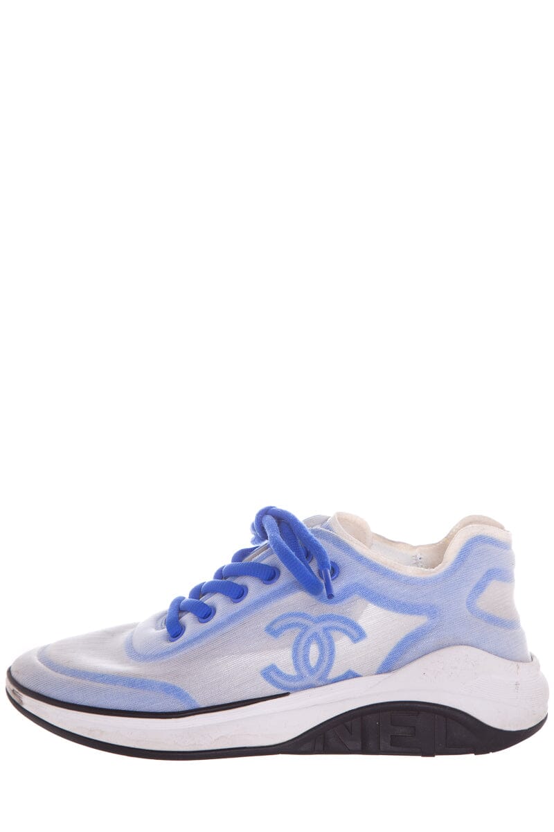 Chanel Grey & Blue Mesh Trainer Sneakers. This item is in good condition; some scuffs on exterior.