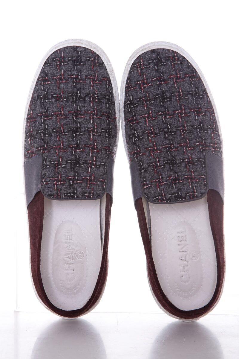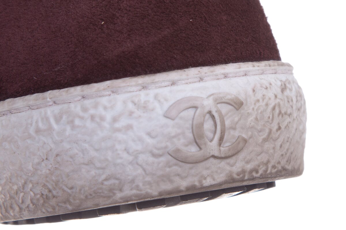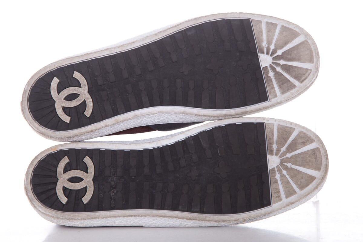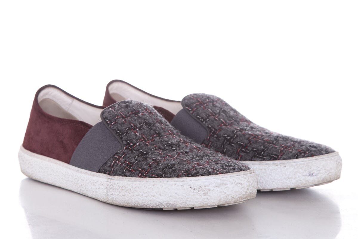 Chanel Grey Tweed & Burgundy Suede Sneakers. This item is gently loved with some wear to soles, and outsoles.