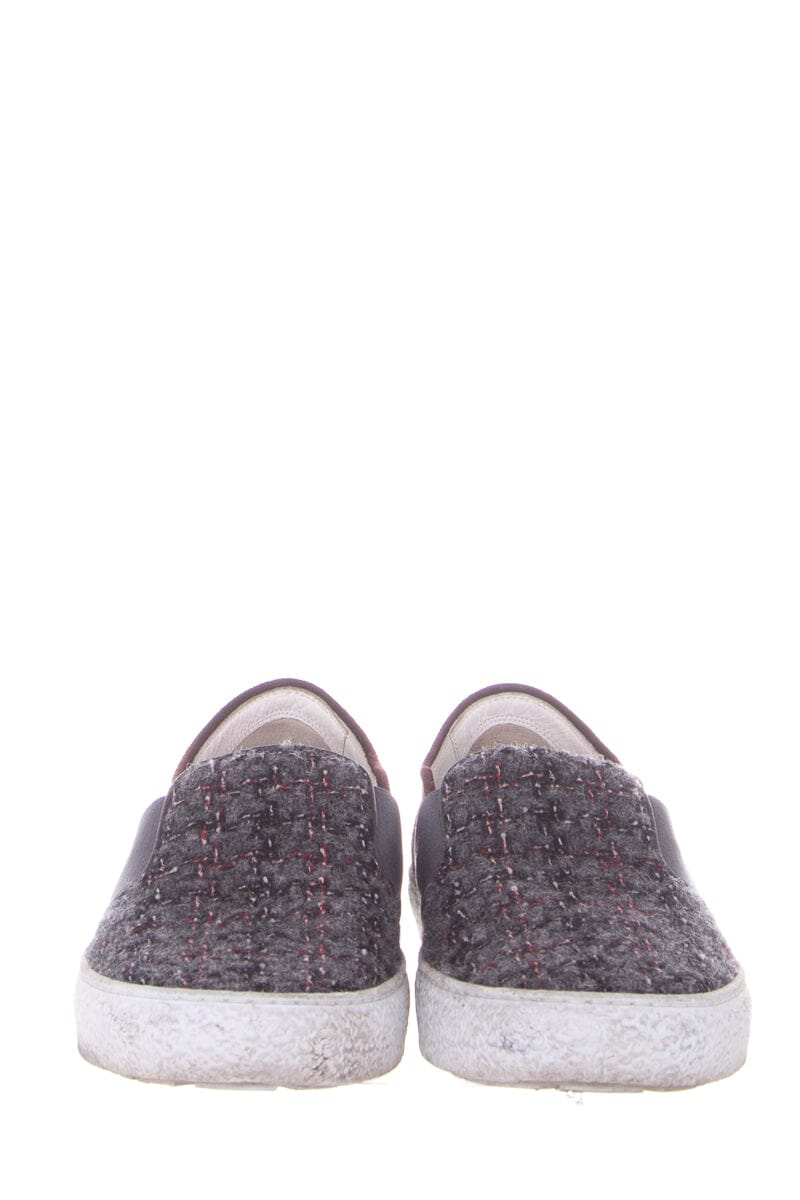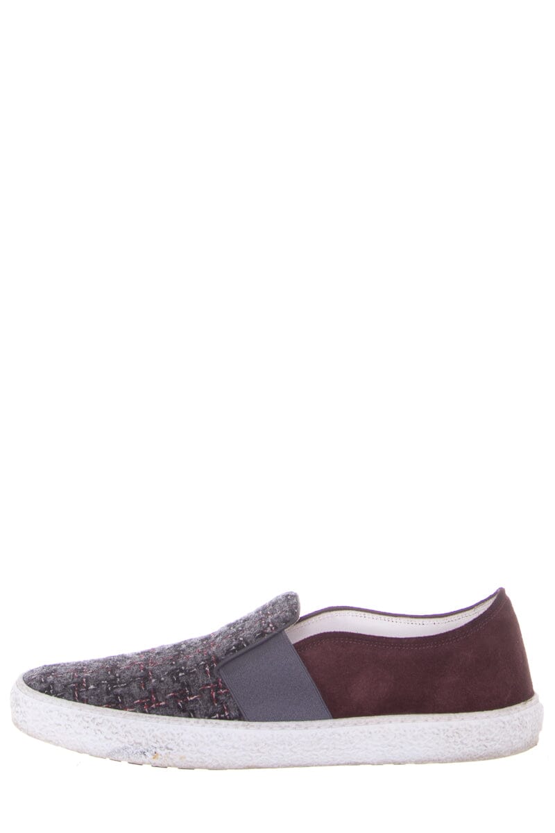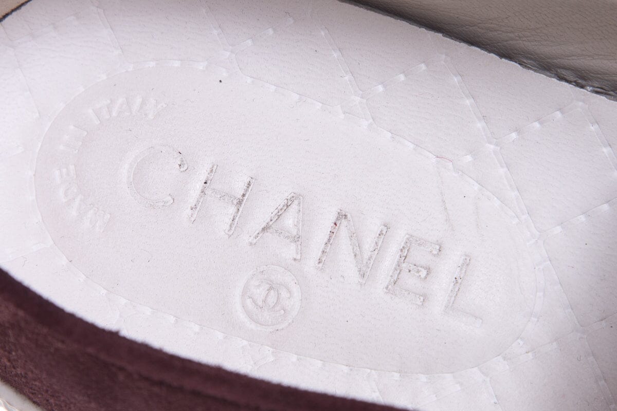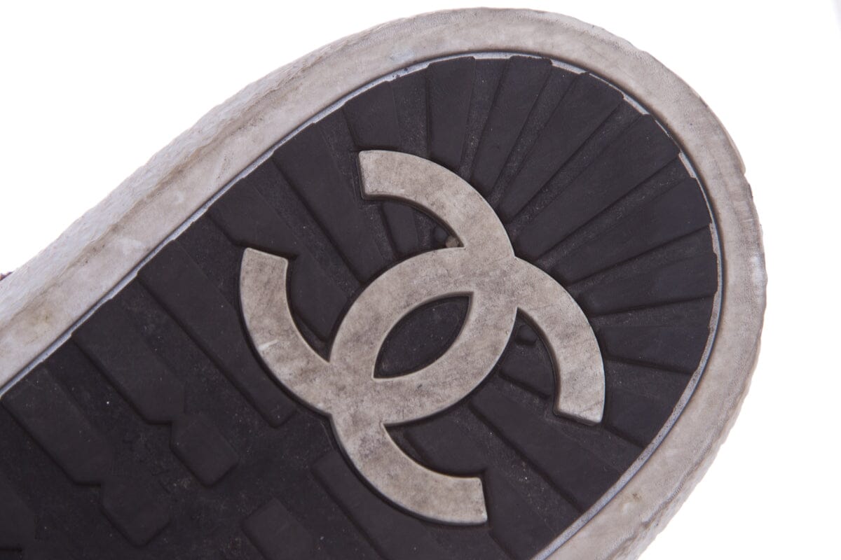 Chanel Grey Tweed & Burgundy Suede Sneakers. This item is gently loved with some wear to soles, and outsoles.