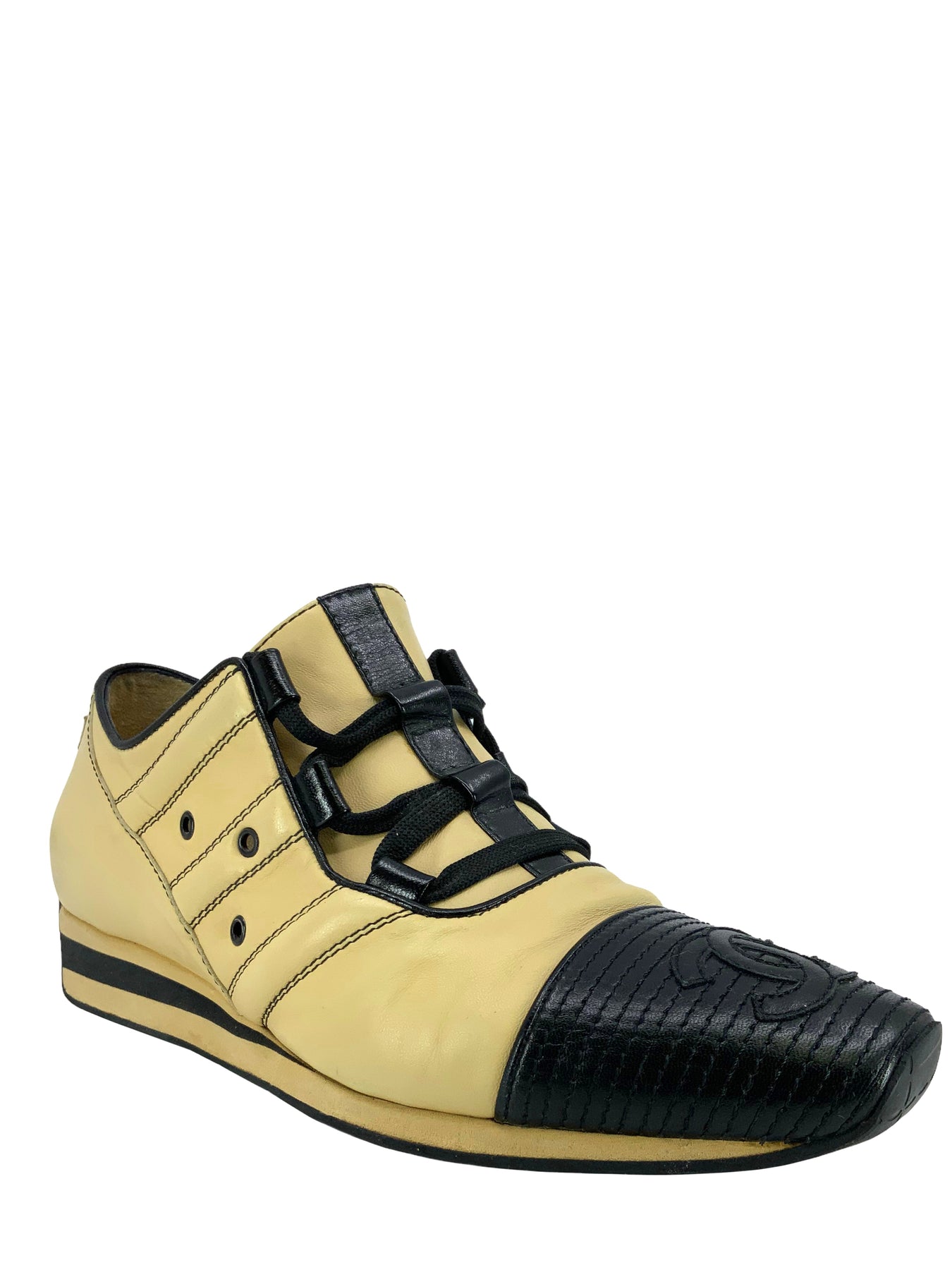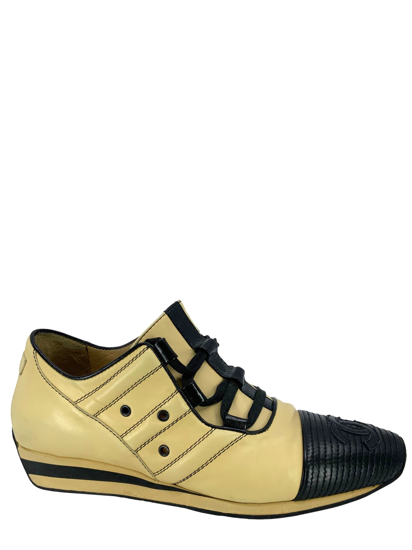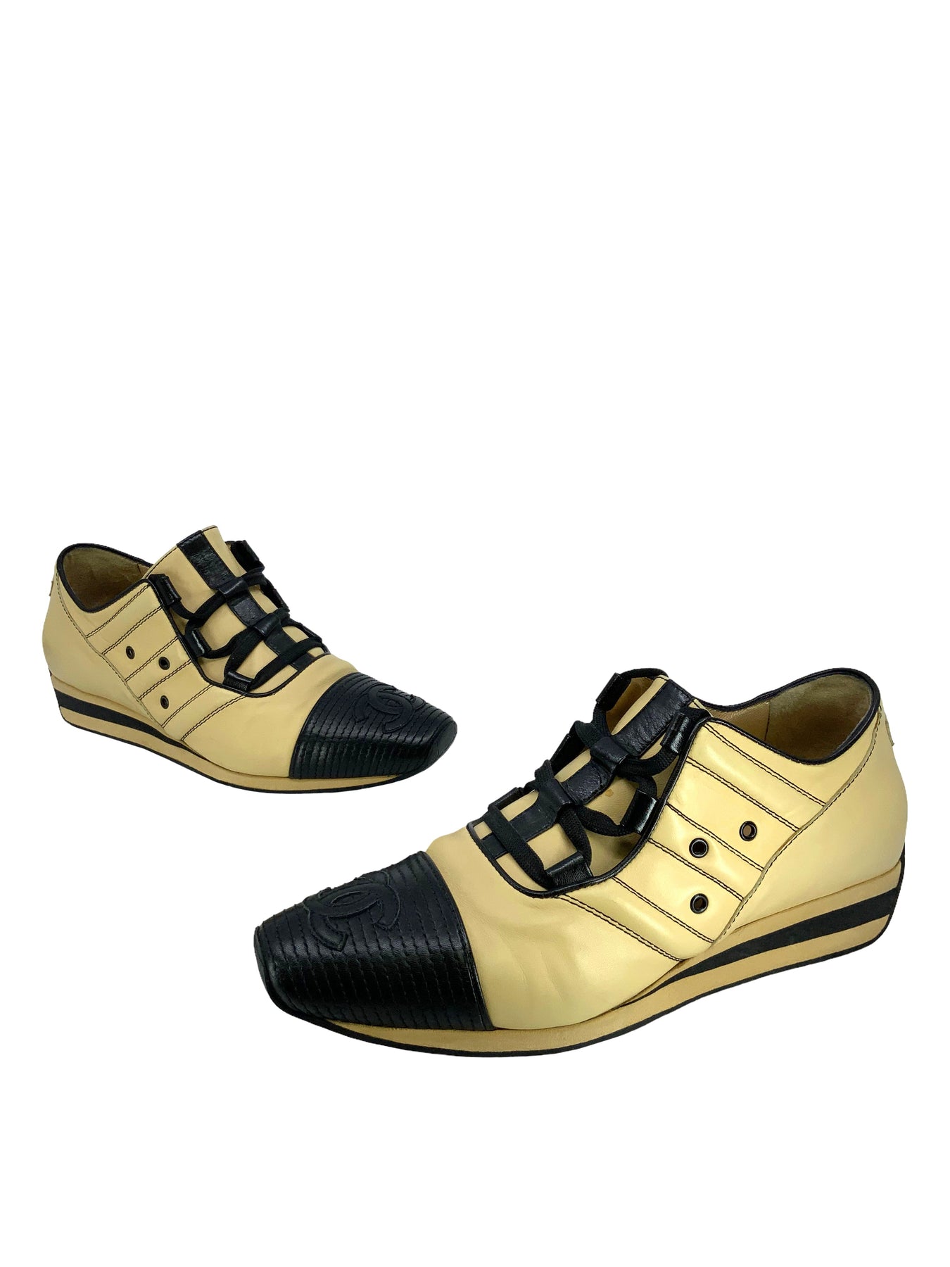 We the ity of these CHANEL CC Logo Cap Toe Leather Low Top Sneaker Size 9 | 39 crafted from supple beige leather with a black leather signature CC logo quilted cap toe. Featuring self-tie lace-up closures and a slight wedge heel.