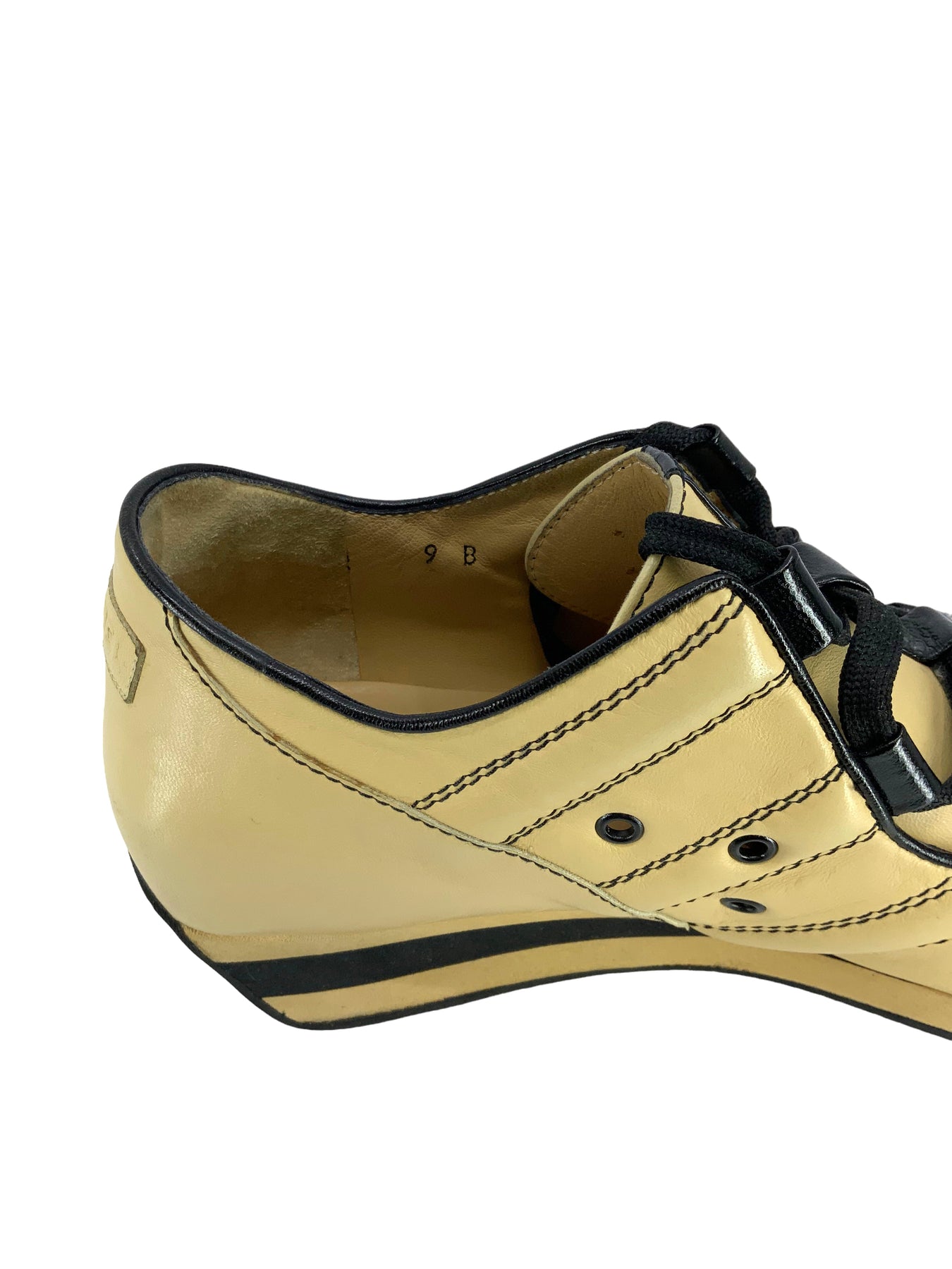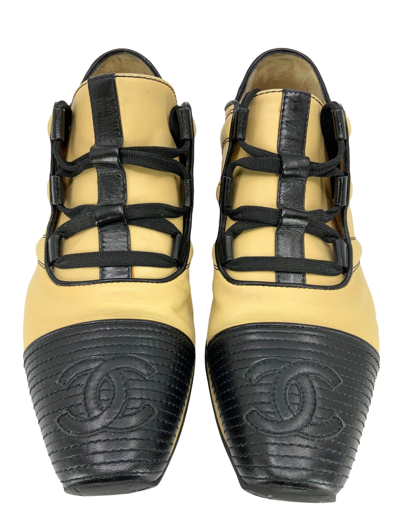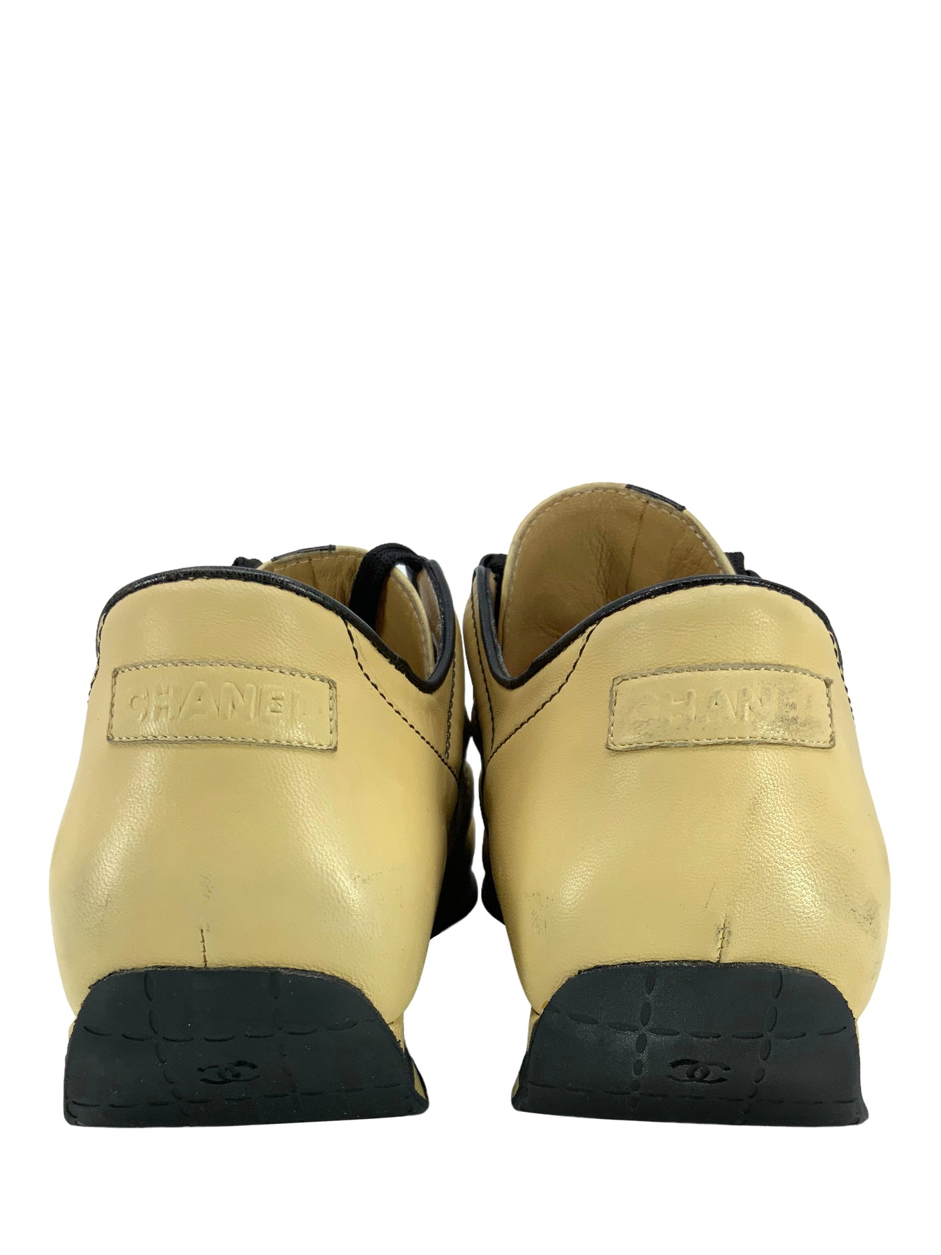 We the ity of these CHANEL CC Logo Cap Toe Leather Low Top Sneaker Size 9 | 39 crafted from supple beige leather with a black leather signature CC logo quilted cap toe. Featuring self-tie lace-up closures and a slight wedge heel.