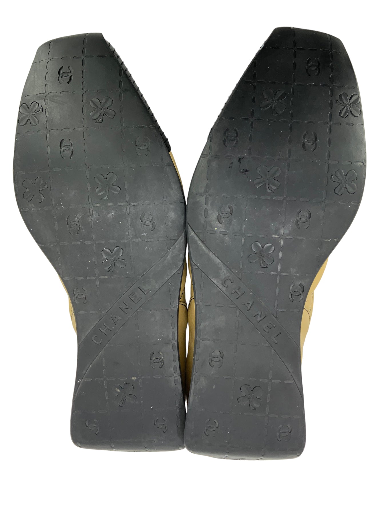 Condition: Very Good. The leather is clean but has developed minor wear. The backs of the heels have rubbing/wear. The CHANEL logos have started to developed fading. The bottom soles have scuffing.