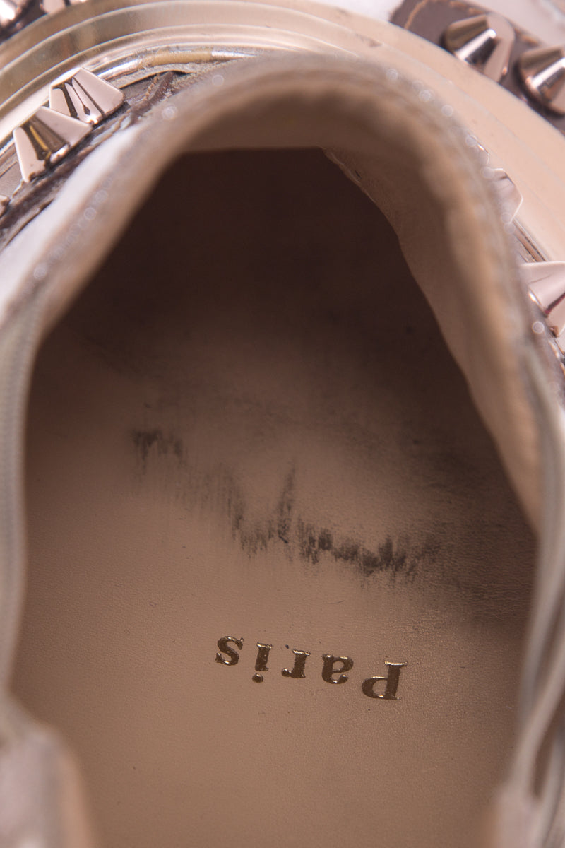 Christian Louboutin Rose Gold Run Flat Glitter/ Studded Cortis Sneakers. This item is in good condition but has wear to insoles and soles and slight creasing to leather on back of heel.