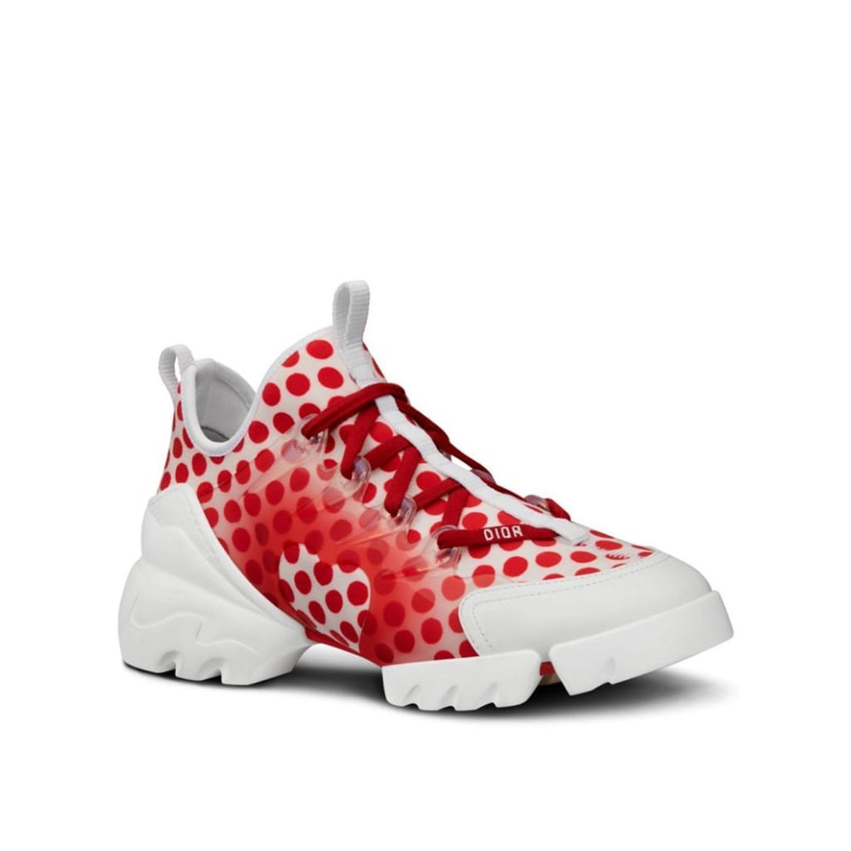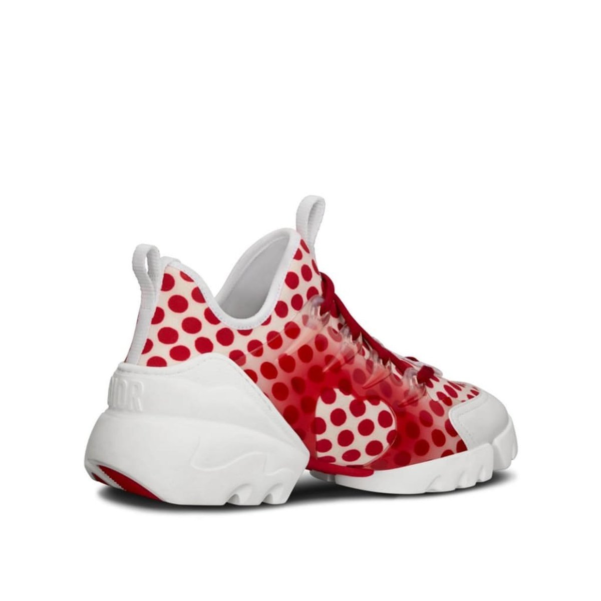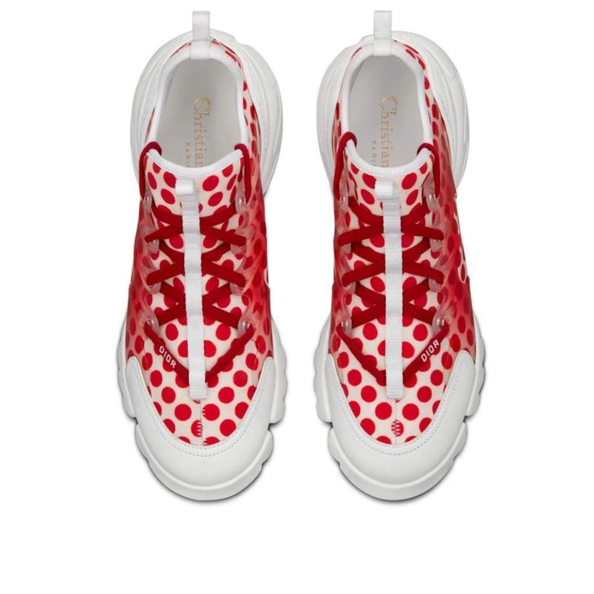 These lace-up sneakers in Dioramour Dots printed neoprene, feature a grosgrain ribbon stitched onto the front, transparent rubber insets, and contrast laces with the D.I.O.R. signature. The wrap-around rubber sole is finished with the D.I.O.R. signature.