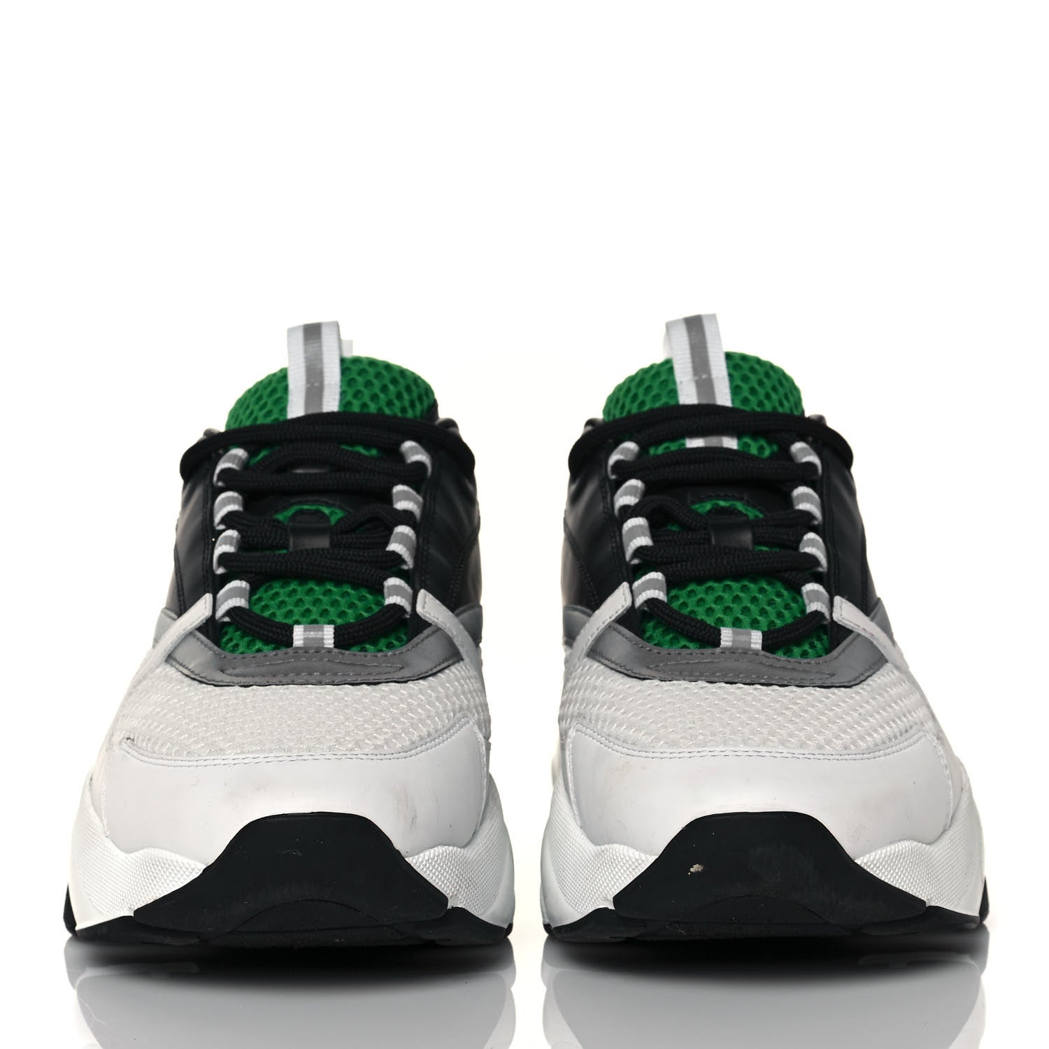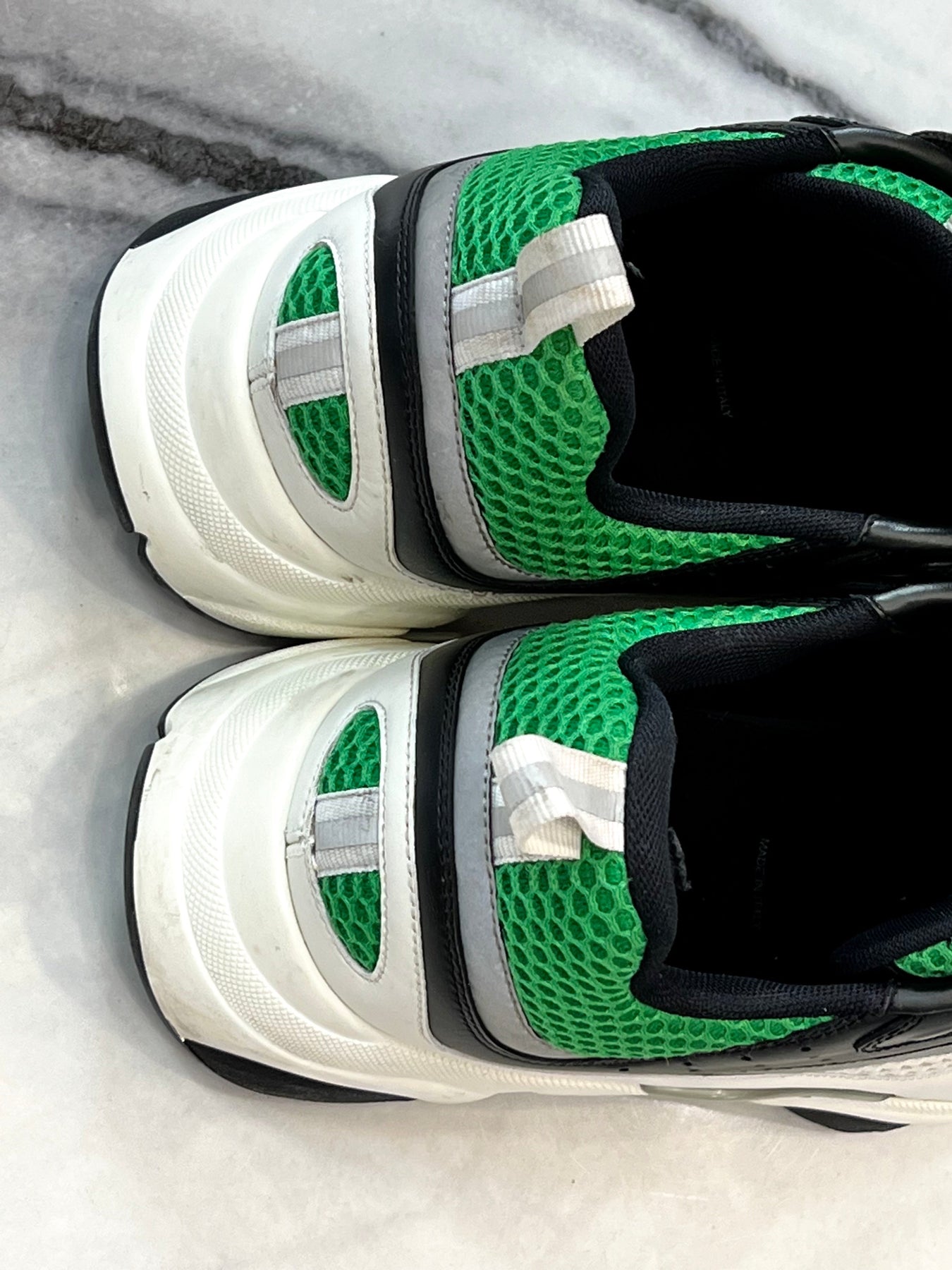 These stylish sneakers are crafted of white and green mesh with black leather accents.