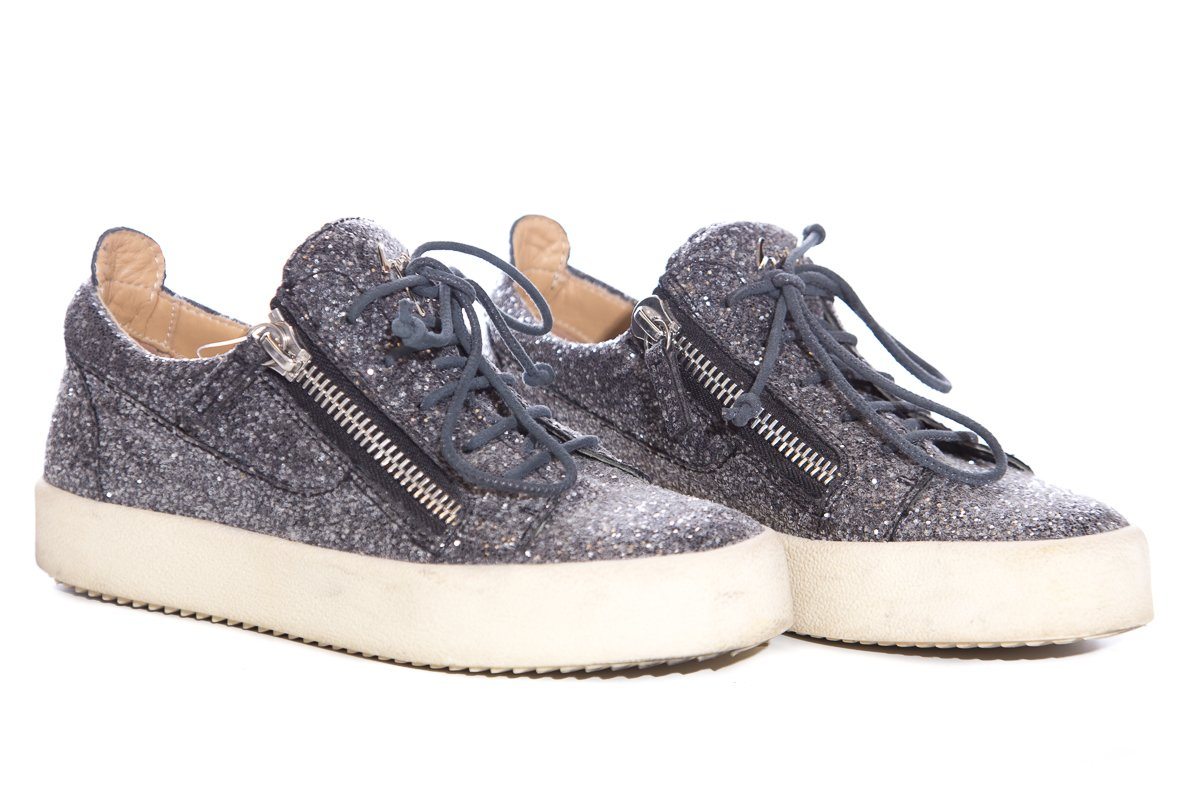 Giuseppe Zanotti grey glitter sneaker, two side zipper on each side, leather in sole , and lowtop. This item is in good condition.