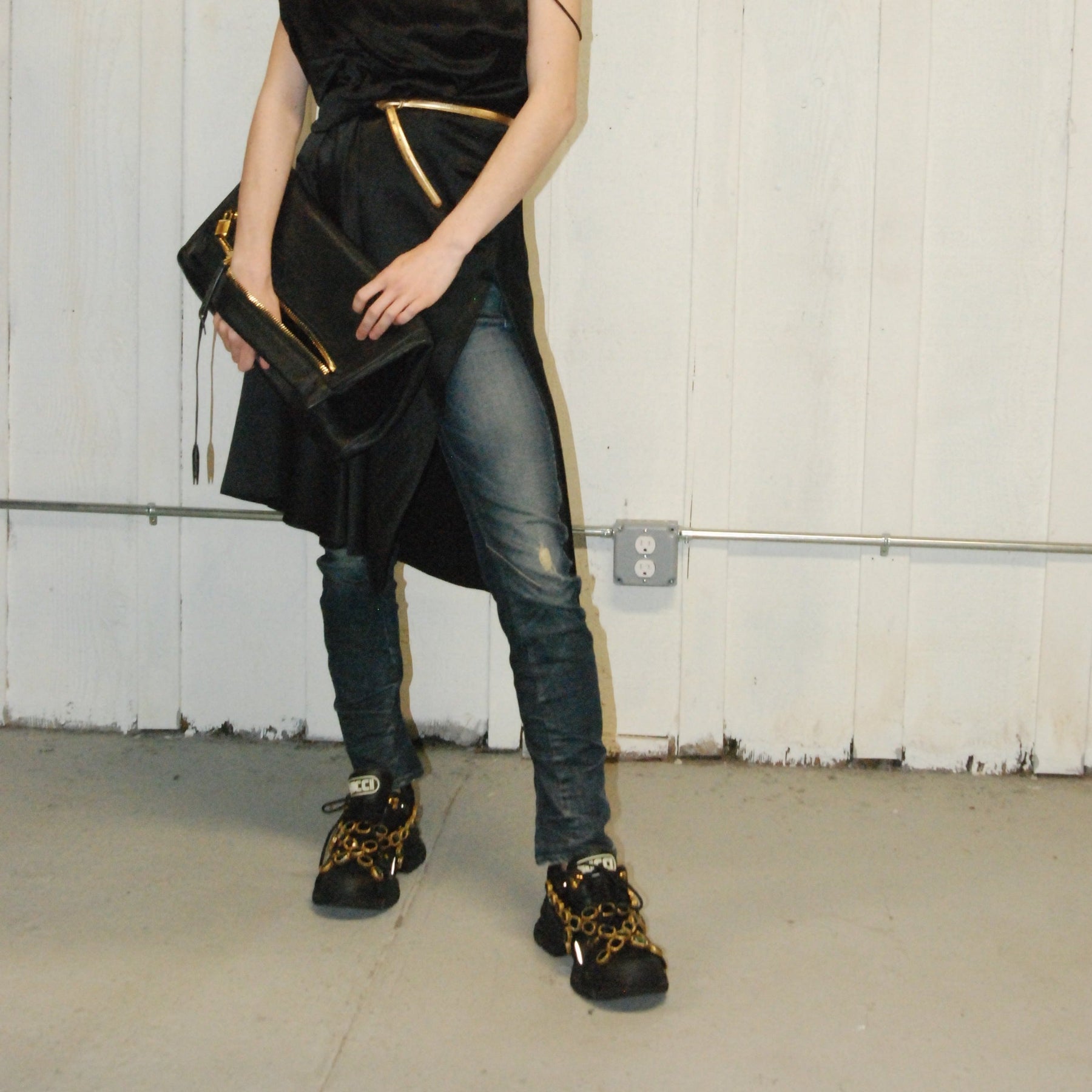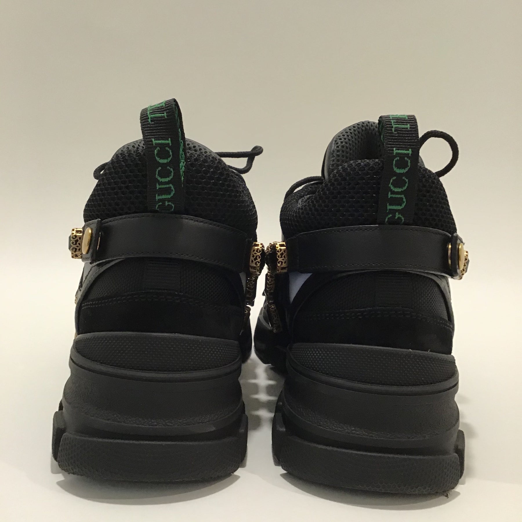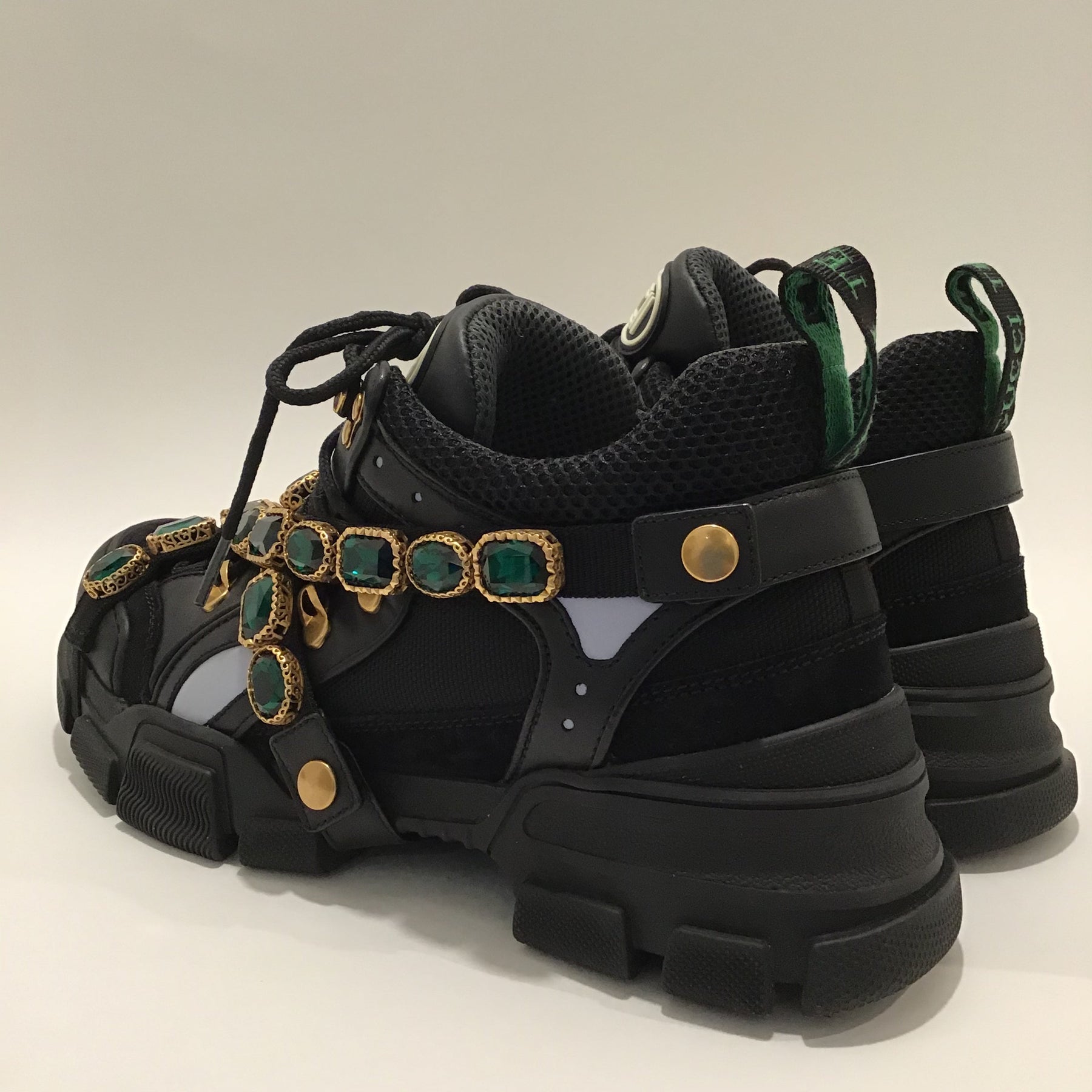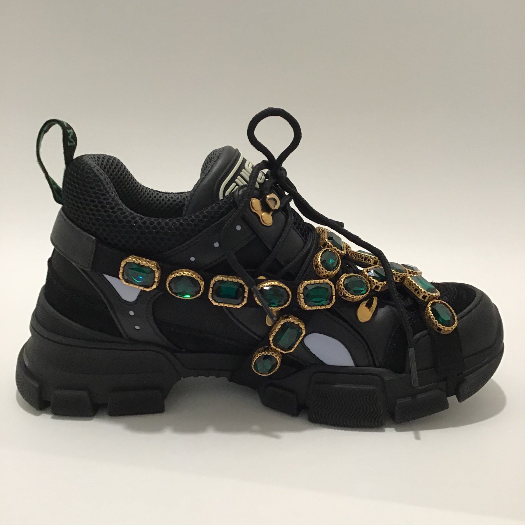 - Gucci black sneakers with chunky soles and jade-tone gems in gold mountings