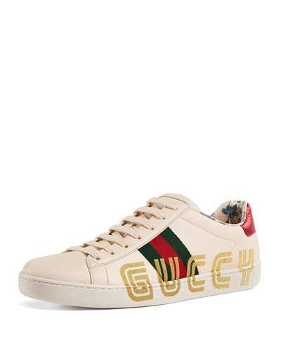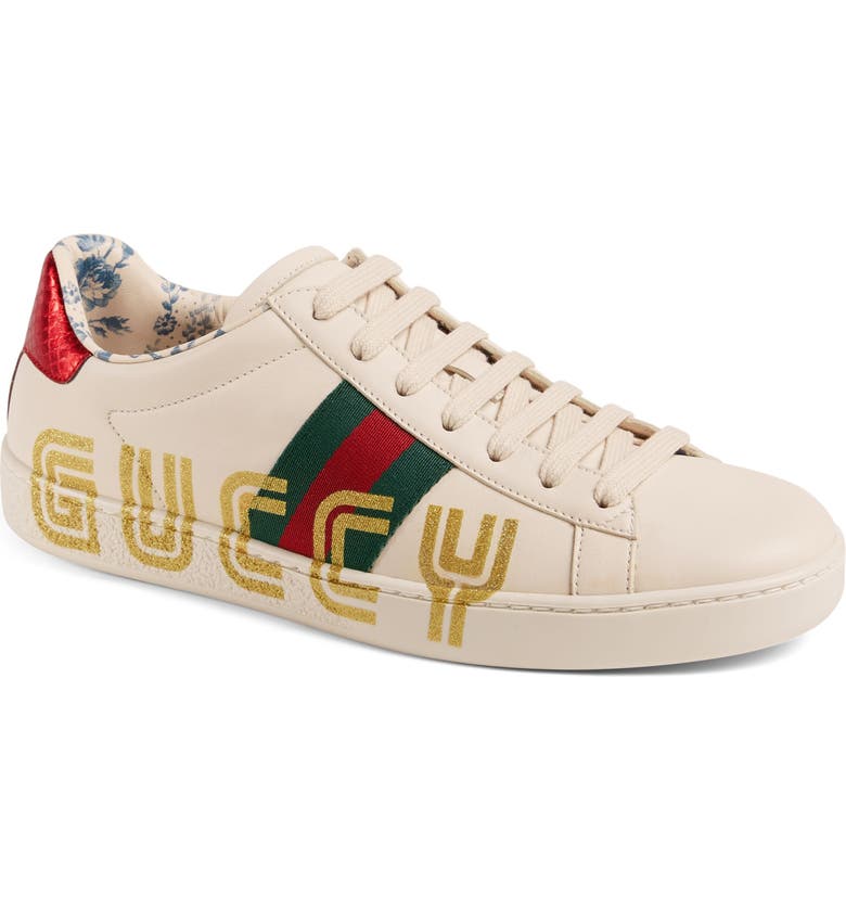 A bold logo glitters against the white leather and House colors of a low-top sneaker with snakeskin trim at the heel counter.