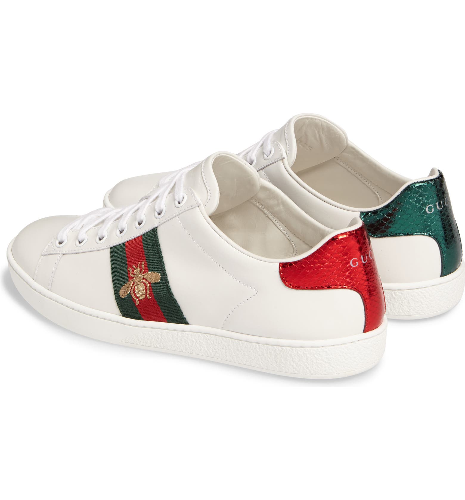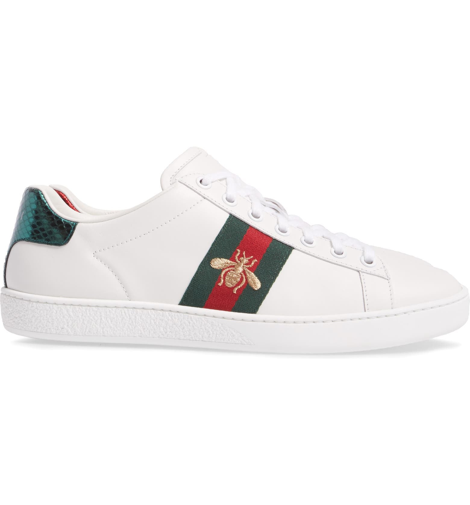 Golden bee embroidery and striped webbing bring iconic Gucci house codes to this sneaker while contrasting heel tabs reference the brand's official colors.