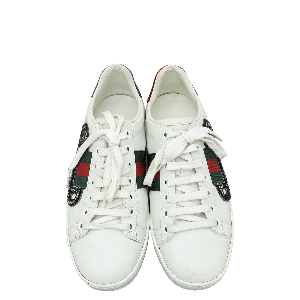 - Material: White Leather with Red/Green Web Stripe and Pin Crystal Embroidered with Red Ayers Leather Detail on The Heel of One Shoe and Green on The Other