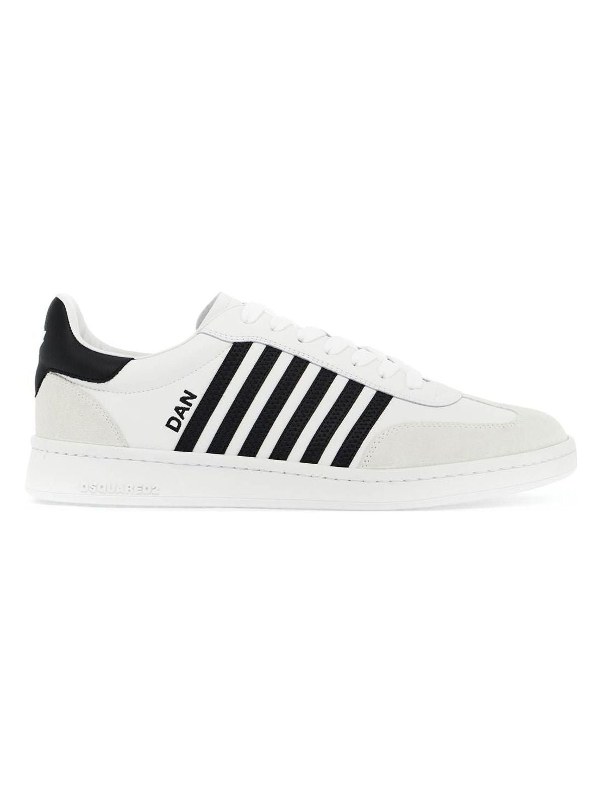 BOXER SNEAKERS BY DSQUARED2 MADE OF SMOOTH LEATHER WITH SUEDE DETAILS AND CHARACTERIZED BY CONTRASTING STRIPES STITCHED TO THE SIDES. CANADIAN LEAF PRINTED ON THE HEEL TAB, LETTERING LOGO PRINT ON TONGUE, NAME OF ONE OF THE TWO DESIGNERS EMBROIDERED ON THE OUTER SIDE, TERRY-LINED INTERIOR WITH REMOVABLE LEATHER INSOLE. THE THICK MIDSOLE CREATES A PLATFORM LOOK, WHILE THE RUBBER OUTSOLE FEATURES A SLIP-RESISTANT TREAD.