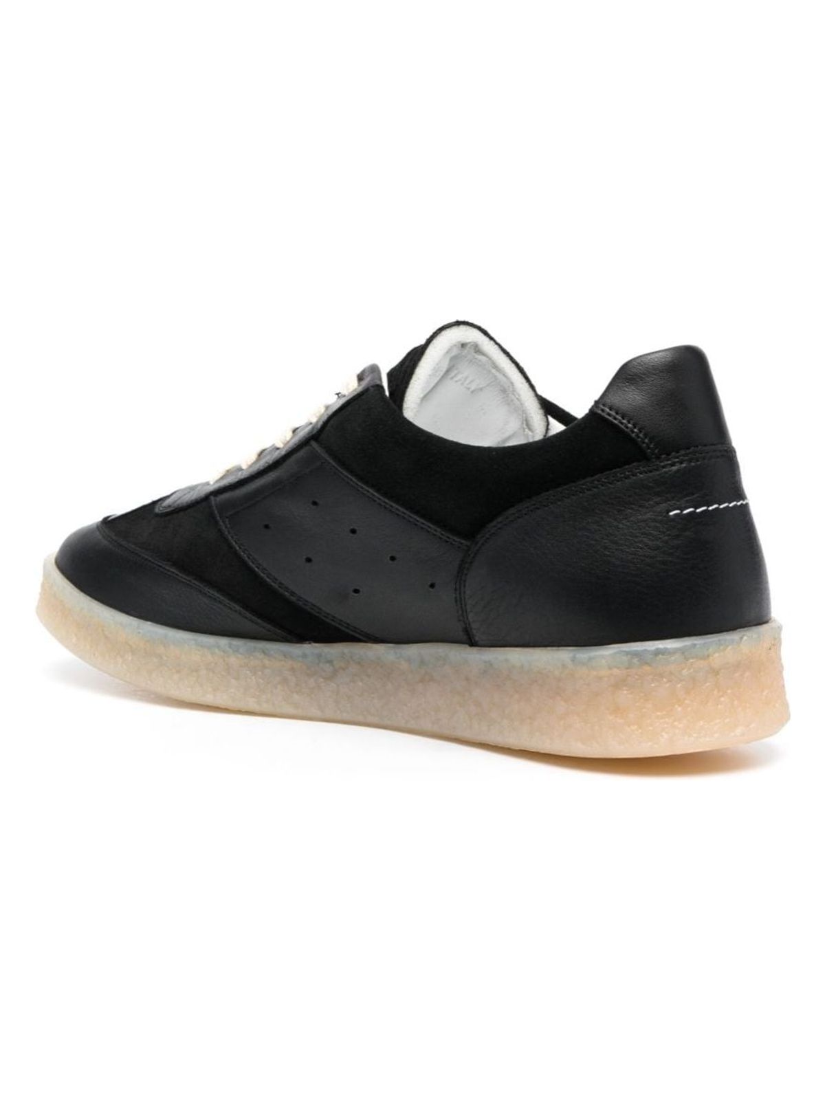 Step up your sneaker game with these panelled low-top sneakers from MM6 Maison Margiela. Crafted from black calf leather with perforated detailing, these sneakers boast a branded insole, a round toe, front lace-up fastening, and a flat rubber sole for all-day comfort and style.