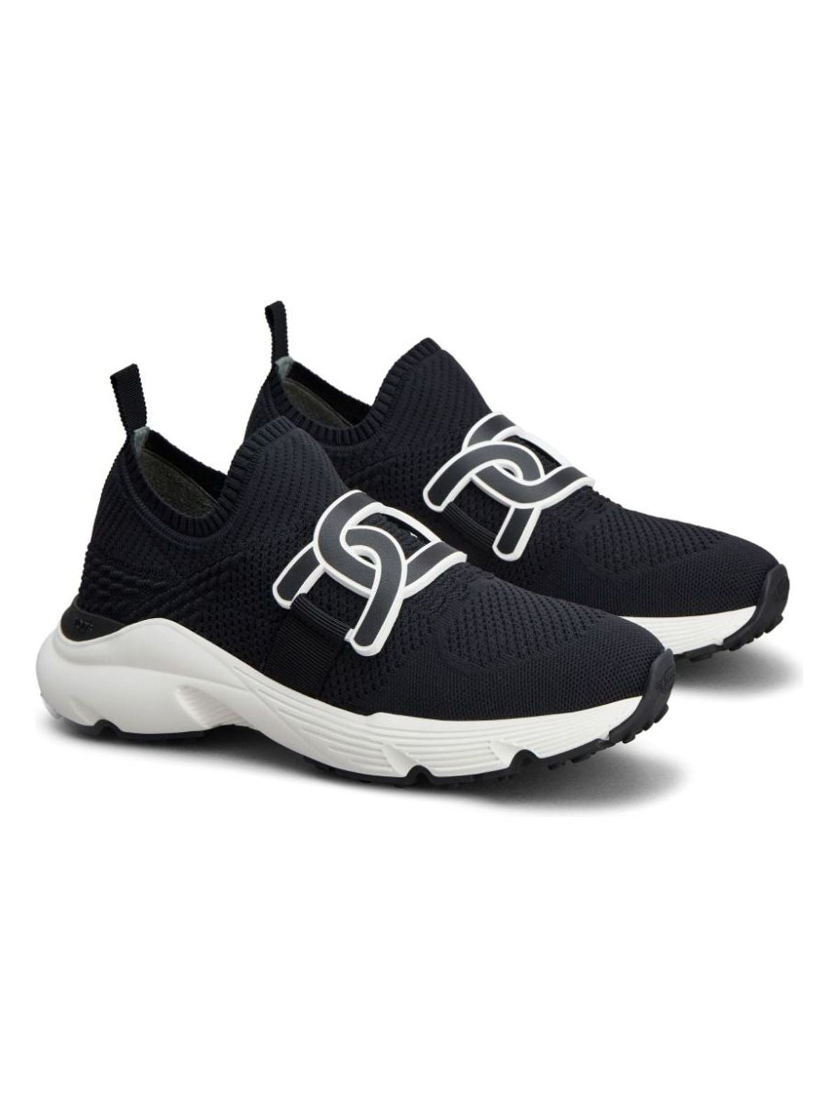 Step up your casual shoe game with these effortlessly stylish slip-on sneakers. The black knitted upper with appliqué logo and almond toe design gives them a sleek and modern look, while the pull-tab at the heel and branded insole ensure comfort and easy wearability. Complete with a chunky rubber sole, these sneakers are the perfect combination of fashion and function.