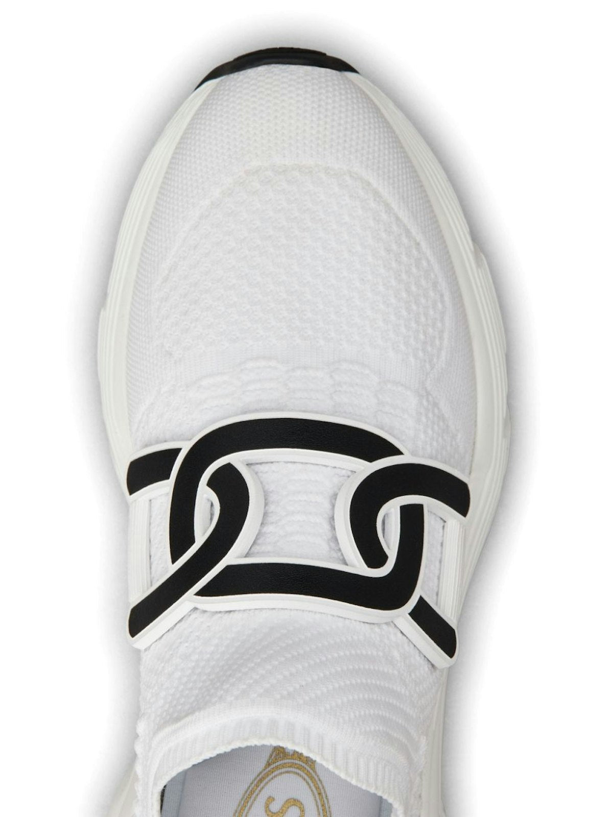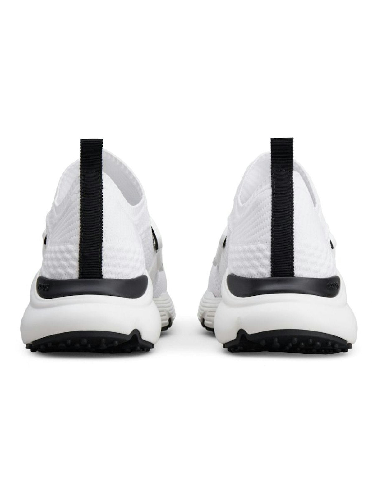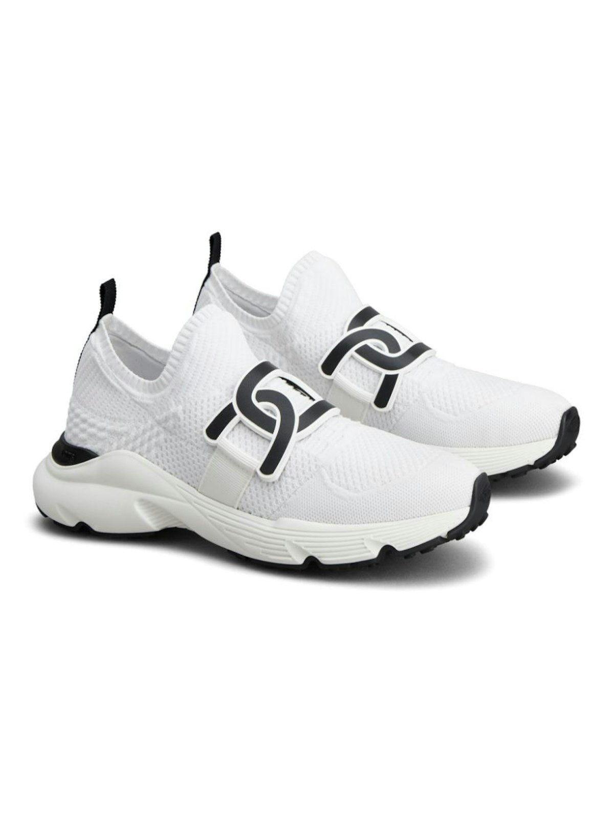 WHITE/BLACK KNITTED UPPER APPLIQUÉ LOGO ALMOND TOE SLIP-ON STYLE PULL-TAB AT THE HEEL BRANDED INSOLE CHUNKY RUBBER SOLE