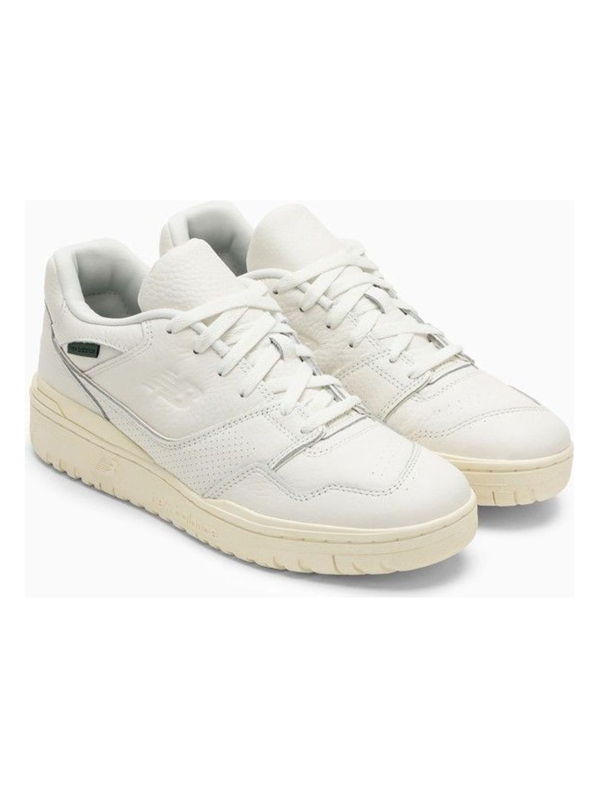 LOW TOP SNEAKER BY FEATURING A WHITE LEATHER UPPER, PERFORATED PANELS, A ROUND TOE, A LACE-UP FASTENING, AN EMBOSSED LOGO ON THE SIDE, A GREEN LOGO SIDE LABEL AND A RUBBER SOLE.