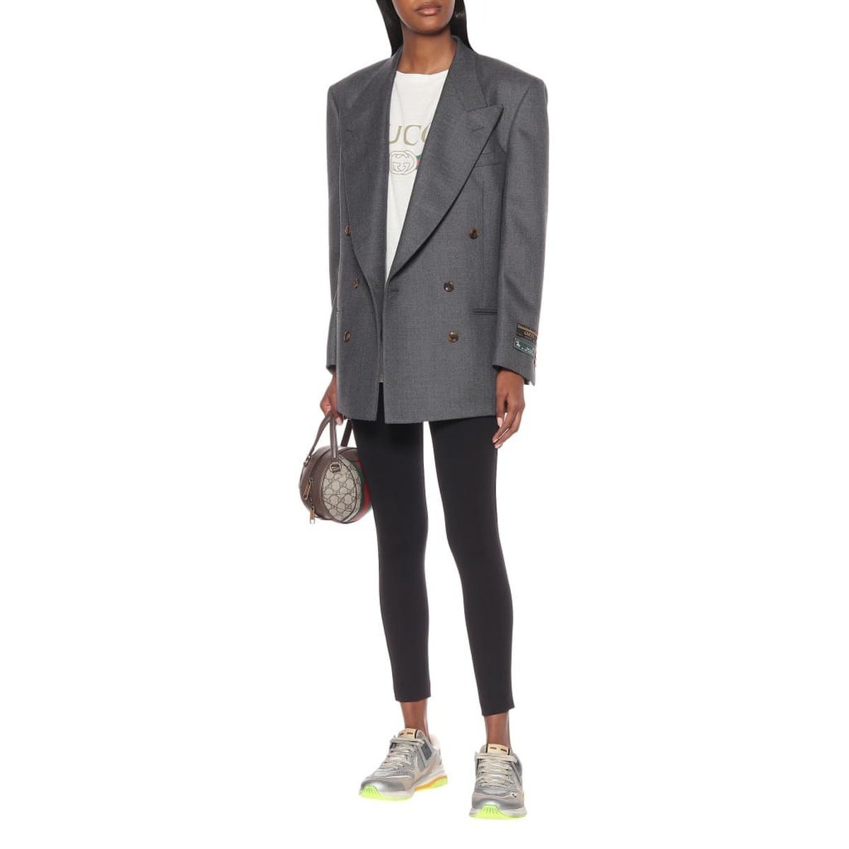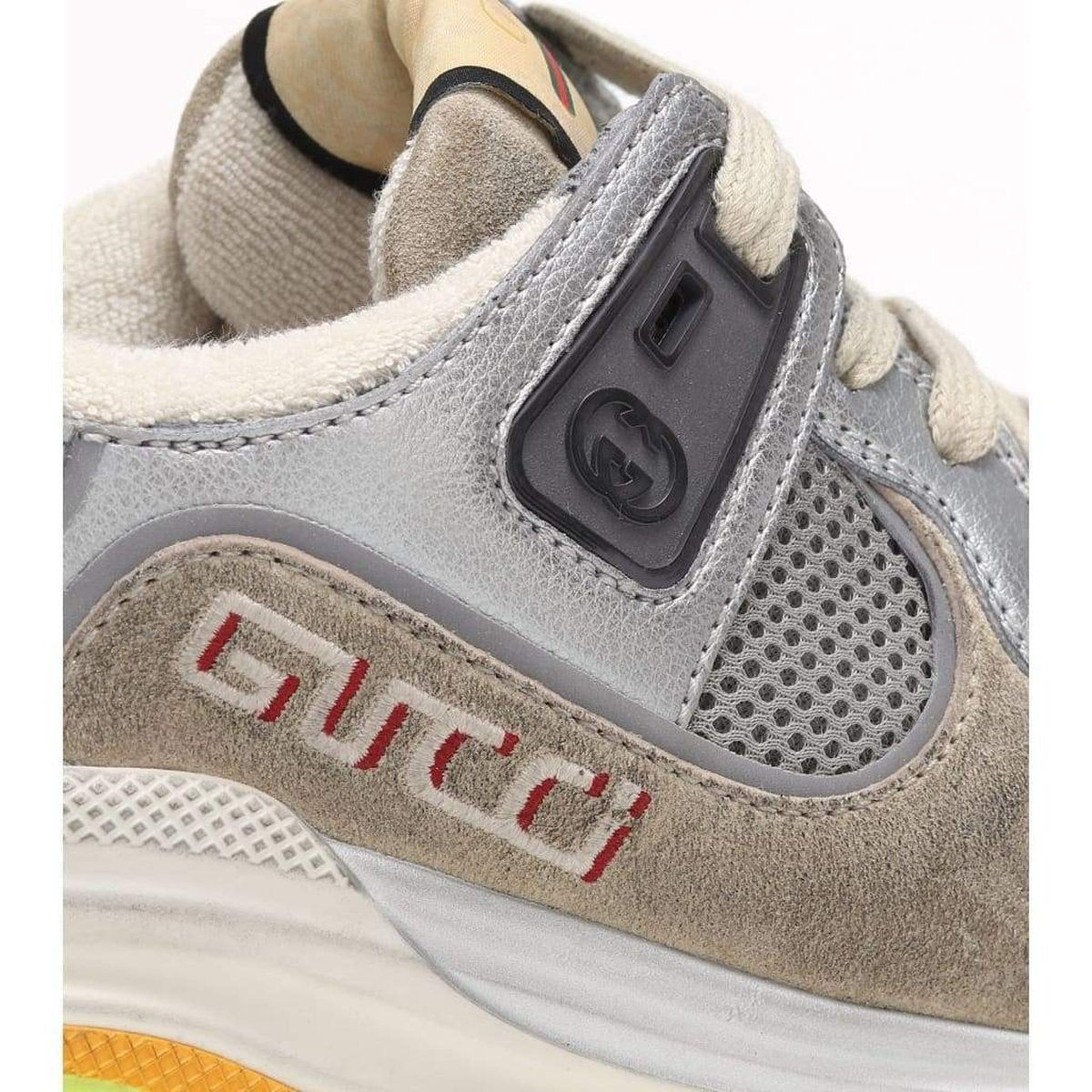Made from silver leather and gray mesh, they're topped with suede panels that are slightly distressed and feature four different iterations of the brand's logo