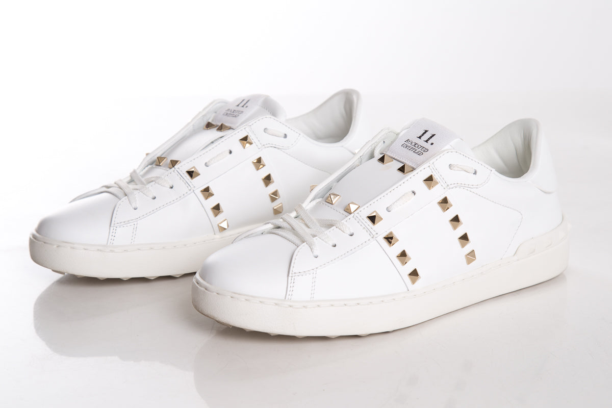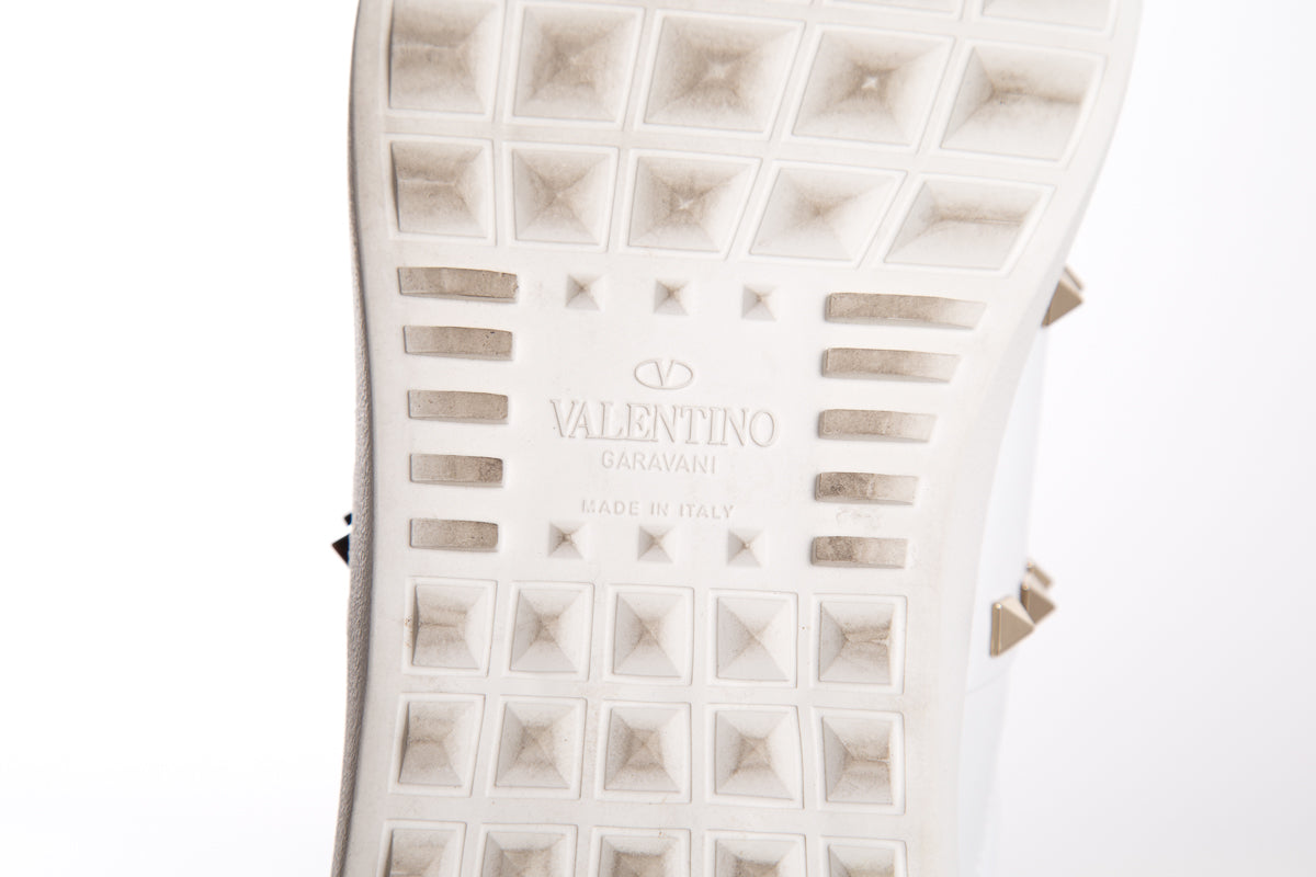 Valentino White Leather Rockstud Sneakers with rubber sole and lace up closure. This item is in very good condition.