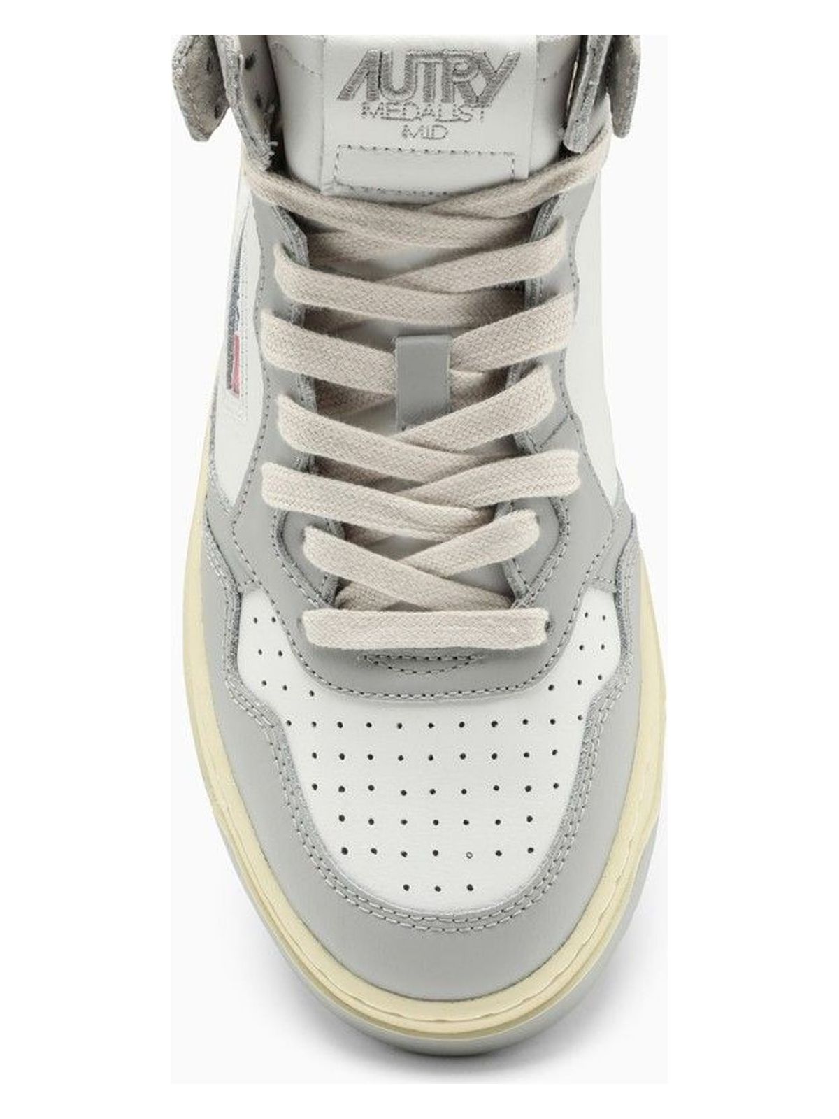 MEDALIST MID SNEAKER BY IN WHITE AND LIGHT GREY LEATHER, FEATURING PERFORATED ROUNDED TOE, LACE CLOSURE, LOGO PATCH ON THE TAB AND ON THE SIDE AND RUBBER SOLE.
