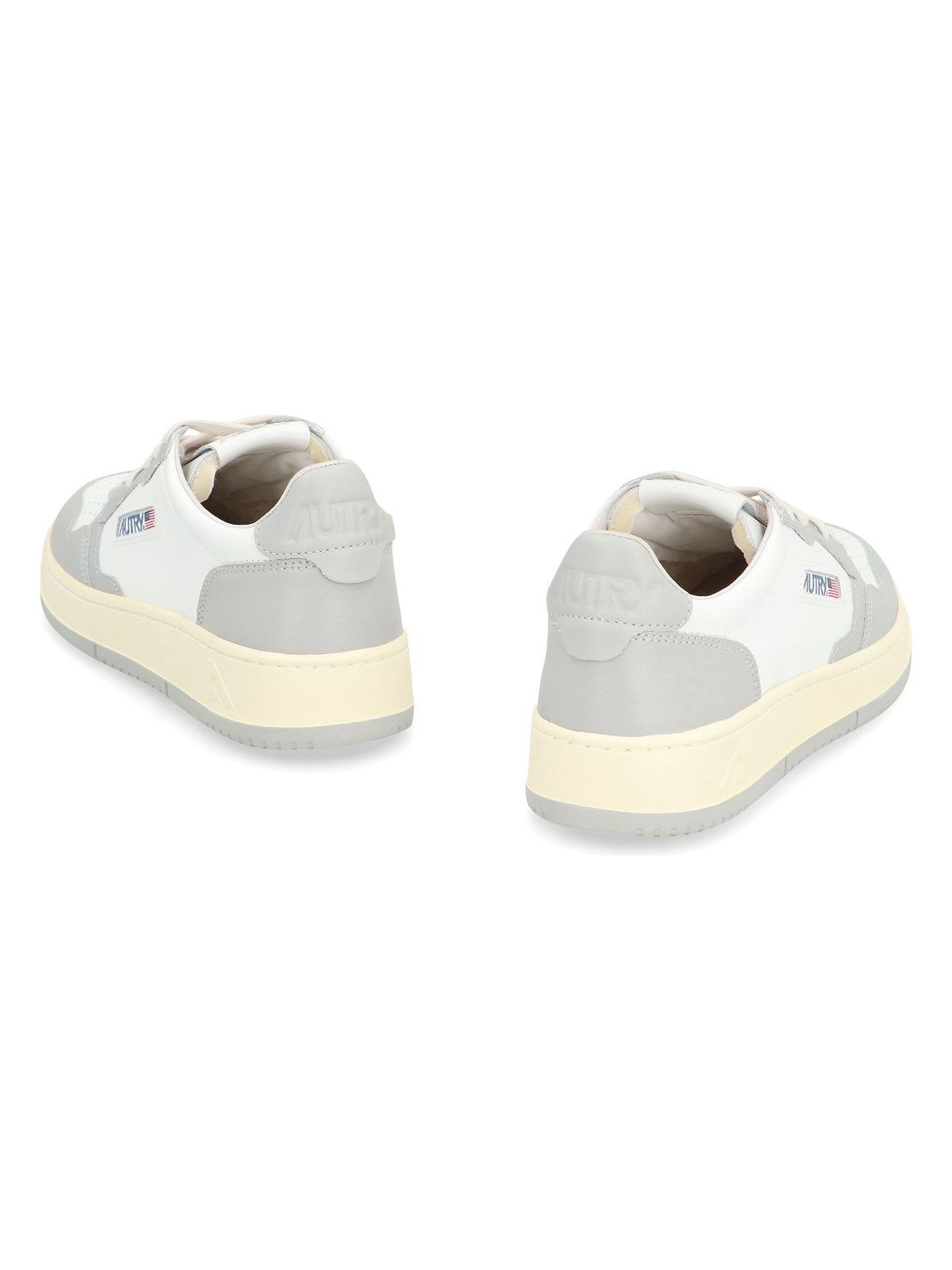 WHITE AND GREY LEATHER LOW TOP TRAINER FROM FEATURING SUEDE INSERTS, PERFORATED ROUND TOE, CONTRASTING HEEL DETAIL, LACE-UP FASTENING, LOGO PATCH ON TONGUE AND SIDE AND RUBBER SOLE.
