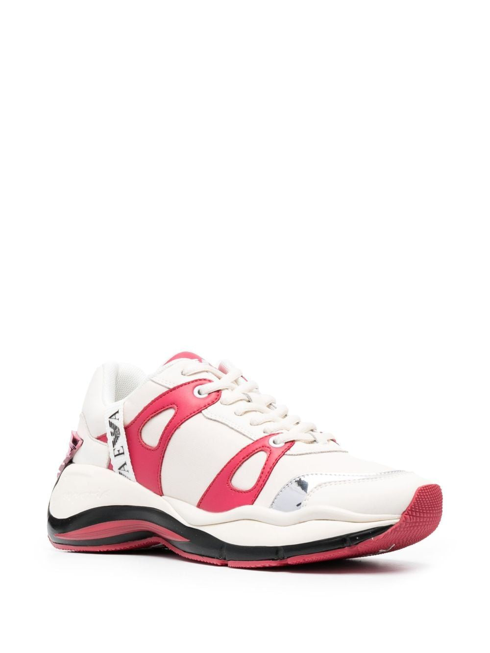 Indulge in the ultimate luxury with these Emporio Armani panelled low-top sneakers. Crafted from premium calf leather and canvas, these sneakers feature a striking white and flamingo pink panelled design that exudes sophistication and style. The iconic logo patch at the tongue and front lace-up fastening add a touch of elegance, while the round toe and chunky rubber sole provide comfort and durability. Elevate your footwear collection with these designer sneakers that effortlessly combine fashion and function.