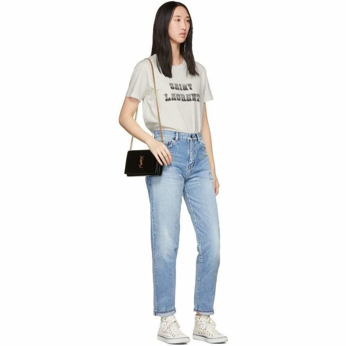 Antiqued silver-tone hardware.