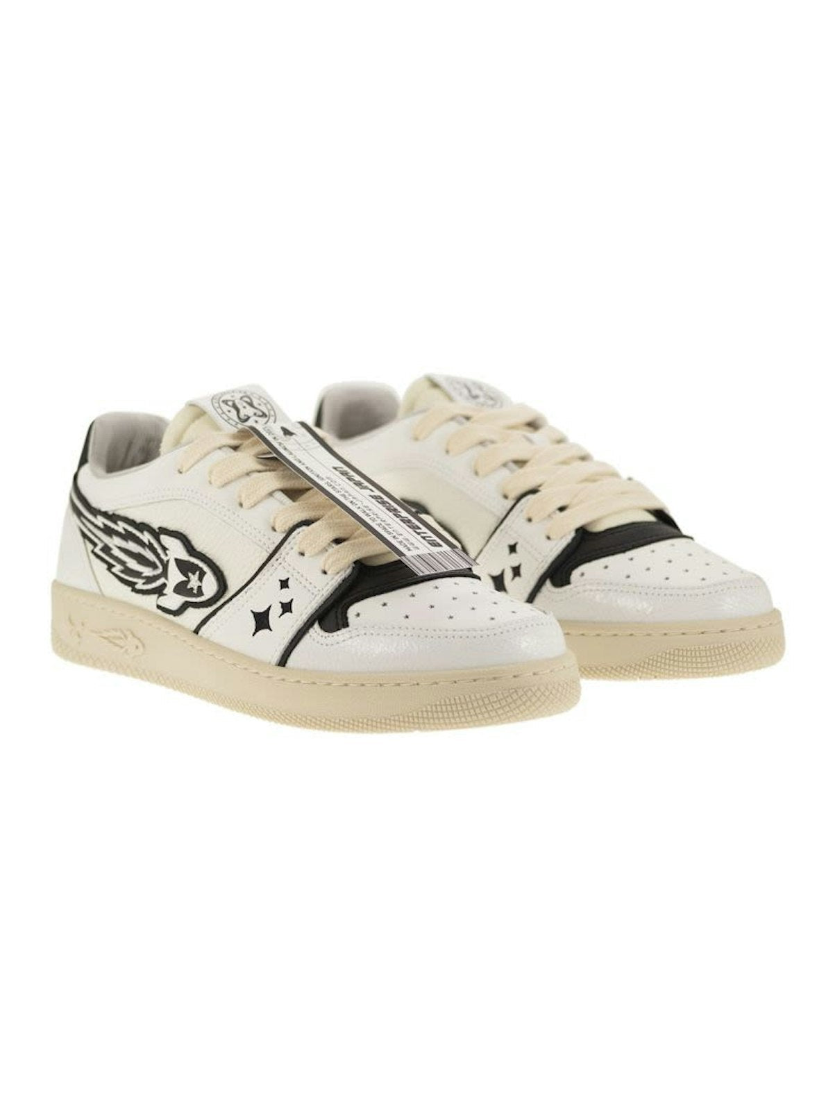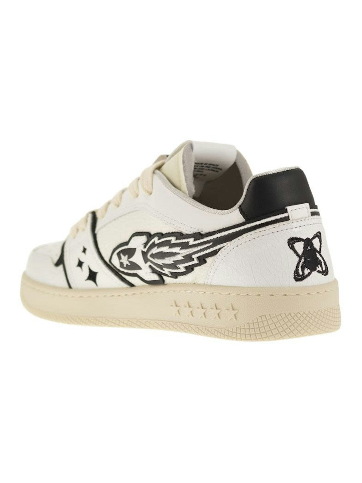 THE URBAN-INSPIRED EJ ROCKET TRAINERS ARE DESIGNED TO ENSURE UNIQUE STYLE AND COMFORT. MADE OF LEATHER, IT IS ENRICHED BY THE UNMISTAKABLE EJ ROCKET LOGO, EMBROIDERED ON THE UPPER WITH OVER 2,700 MACHINE STITCHES AND ON THREE DIFFERENT LAYERS OF LEATHER. THE LIGHTWEIGHT THERMOPLASTIC SOLE IS CUSTOMISED LATERALLY WITH EMBOSSED GRAPHICS AND IS ENGRAVED WITH THE ICONIC EJ ROCKET ON THE TWO-TONE BOTTOM. - COTTON LACES - MADE IN ITALY DESIGNER ID: BB4001PX408S1005 SOLE HEIGHT: 3.5 CM