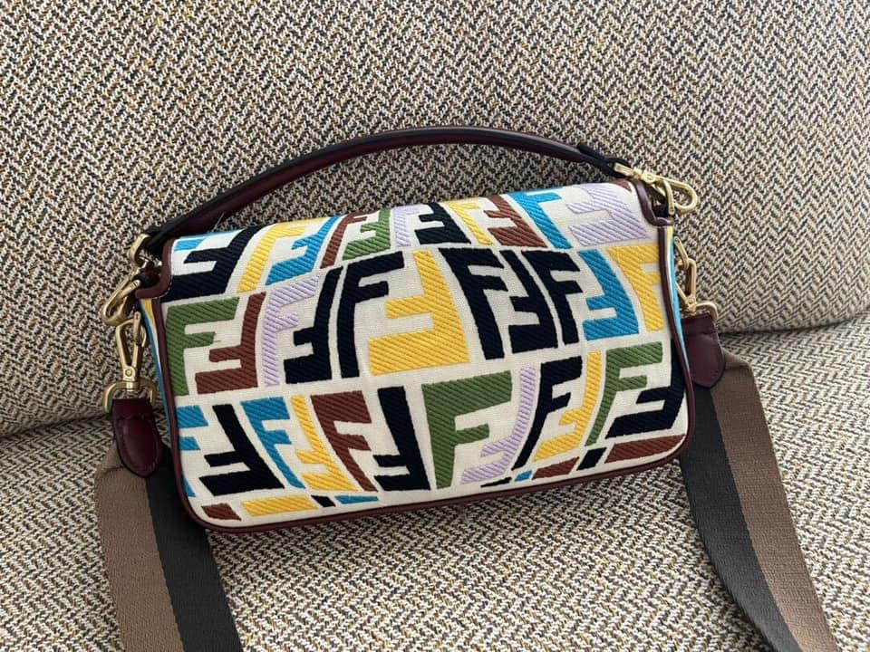 Iconic medium Baguette bag, made of canvas with an embossed embroidered multicolor FF Fish-Eye motif and decorated with an FF clasp.
