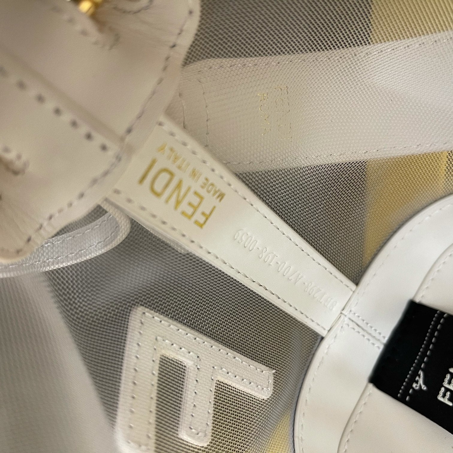 Mini Mon Tresor bucket bag made of beige mesh and featuring Fendi lettering and a white leather trim.