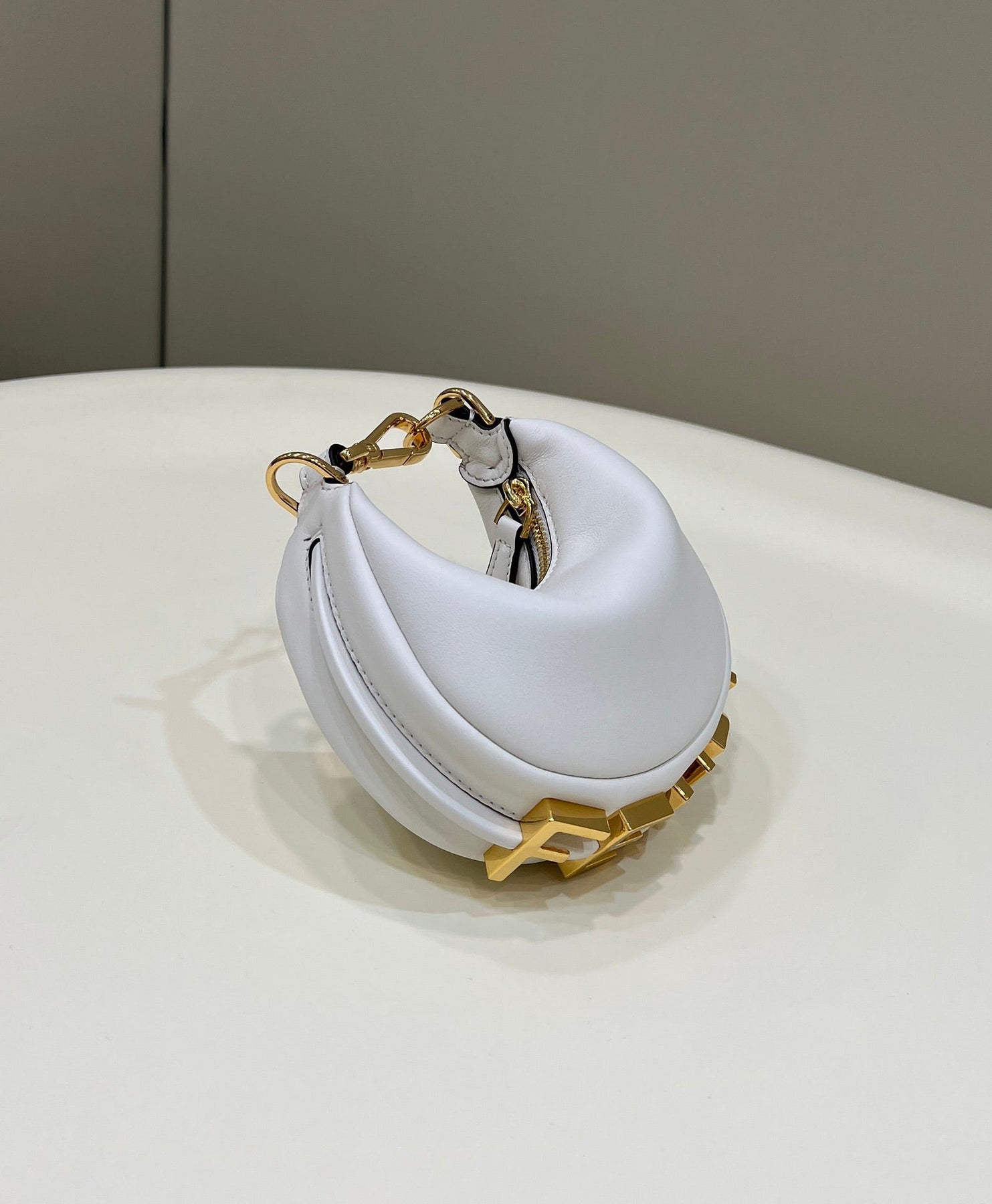 Nano Fendigraphy Hobo bag with zip fastening, embellished with vintage gold metal FENDI lettering. The adjustable strap with a clip allows it to be attached to larger bags or worn on the wrist. Comes with hooks for the shoulder strap. Made of white leather. Gold-finish metalware.