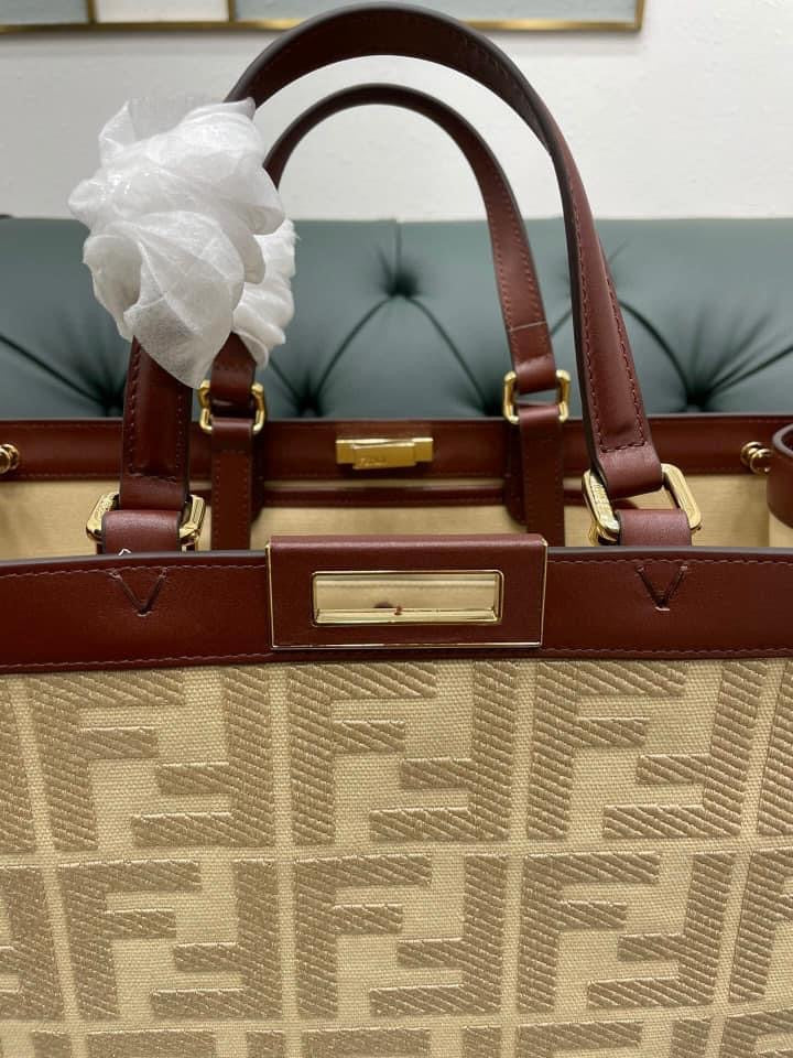 Medium Peekaboo X-Tote bag made of beige canvas with an embossed FF motif created in tone on tone embroidery. Trimmed in dark brown leather and decorated with the classic twist lock.