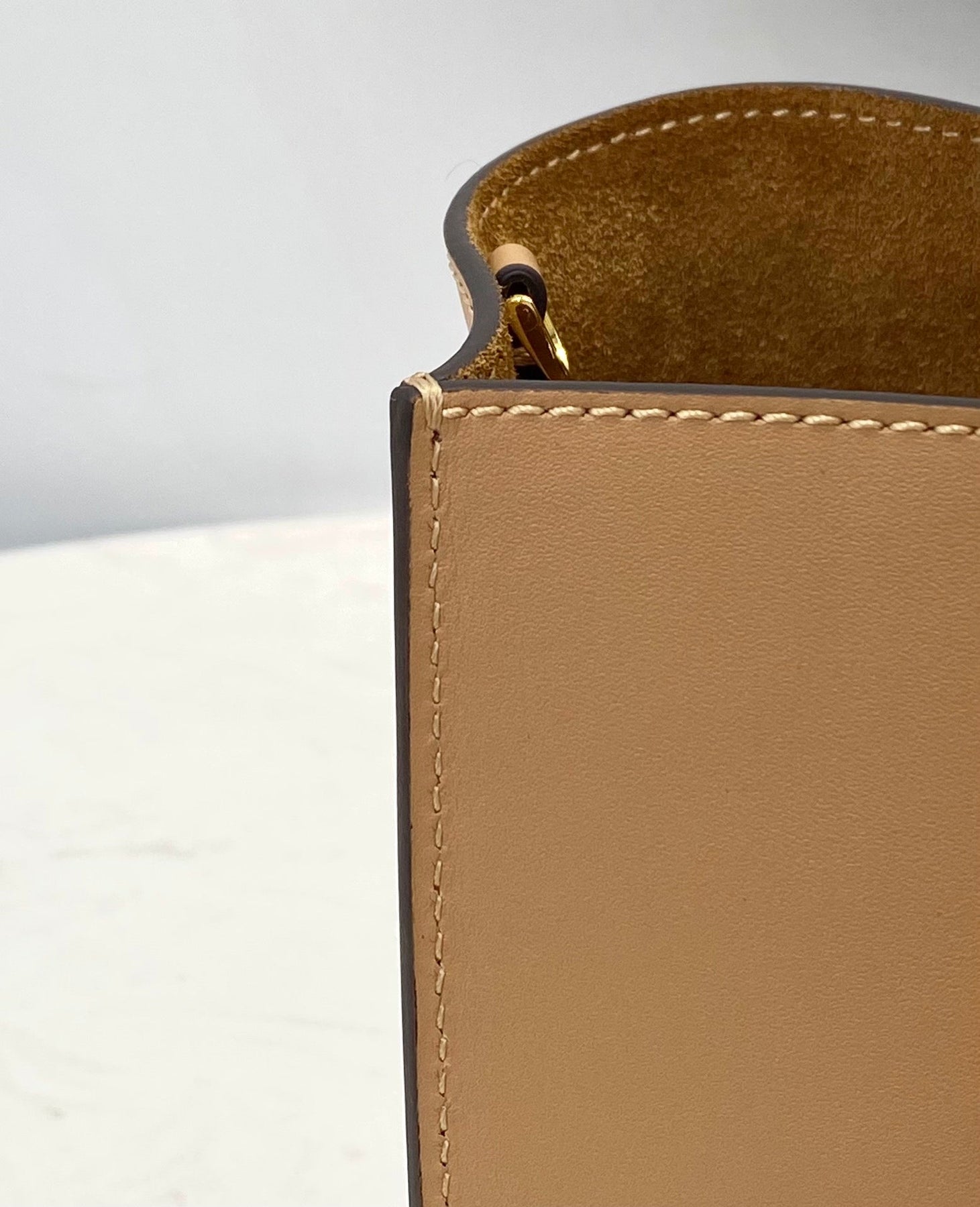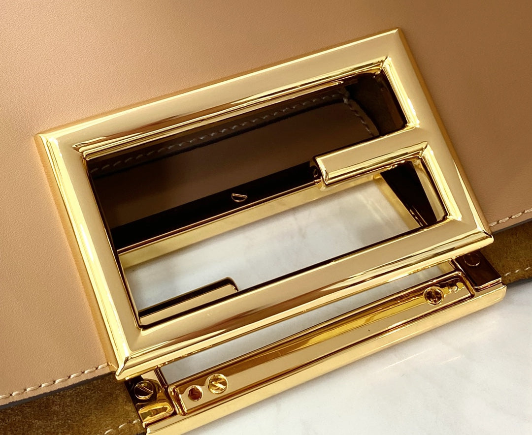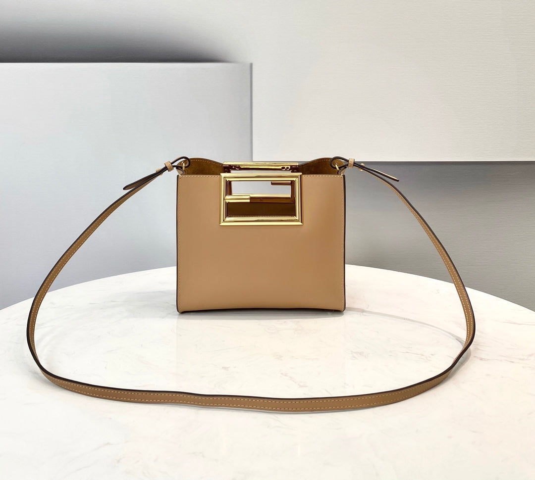 Small Fendi Way bag made of honey-colored leather with metal handles with oversized FF logo.