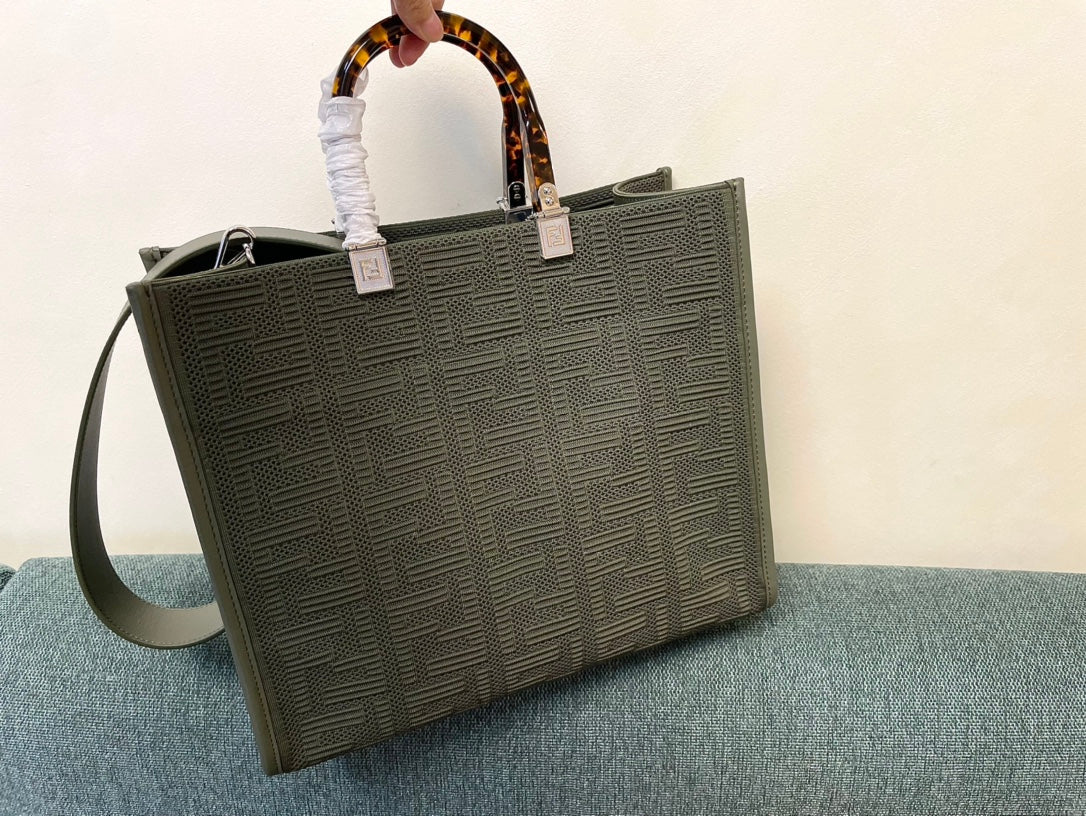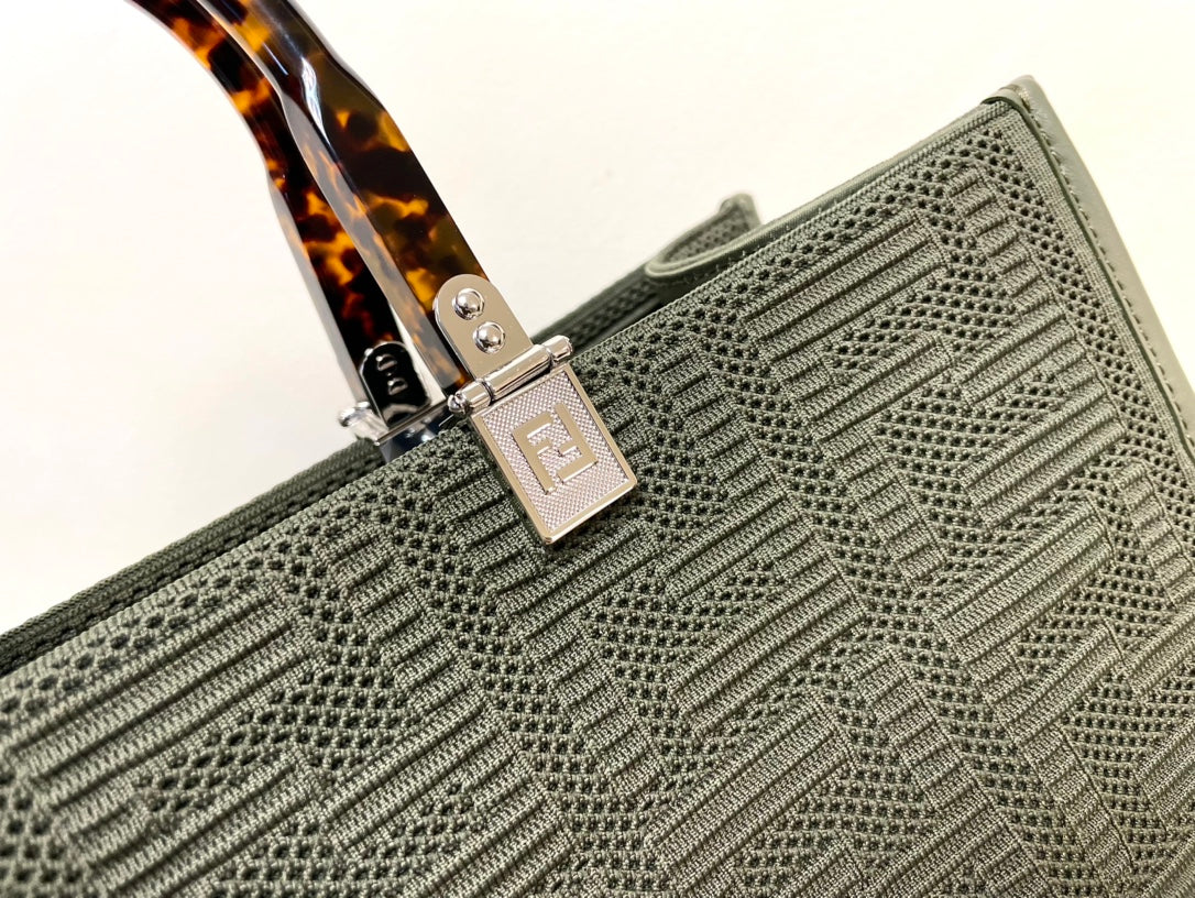 Medium Sunshine Shopper bag made of green technical mesh with 3D-texture FF motif and stiff tortoiseshell-effect plexiglass handles.