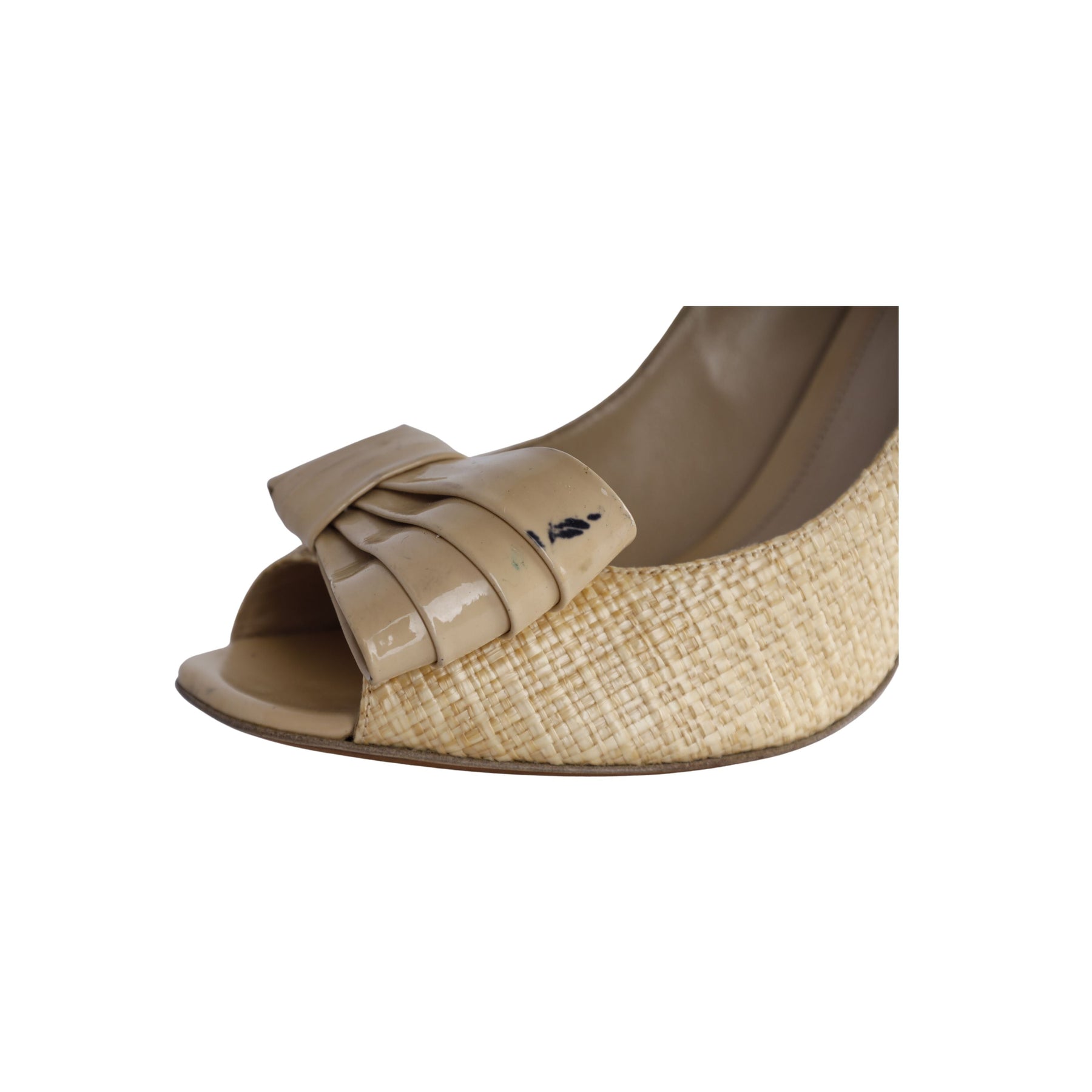 Add a touch of contemporary style to your look with these Fendi Asymmetric Bow Peep-toe Pumps. Featuring a peep toe design, the shoes boast a wicker and woven textured body and an asymmetric bow on the upper.