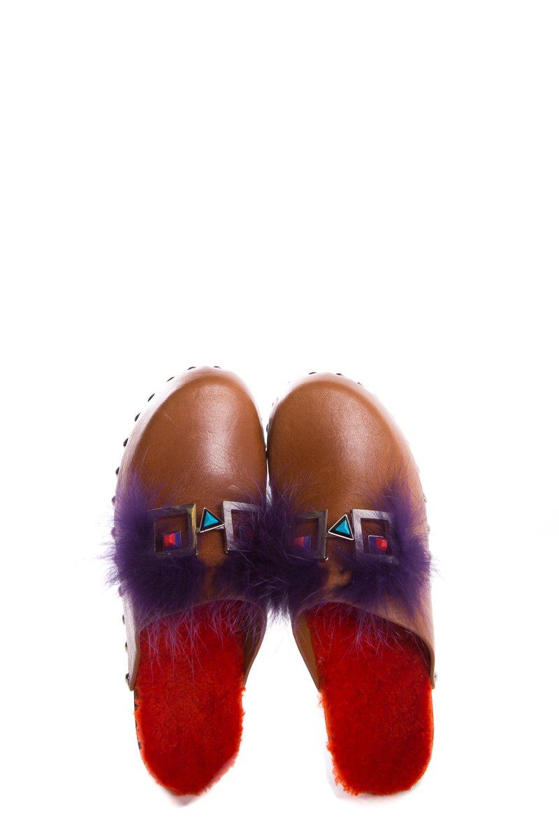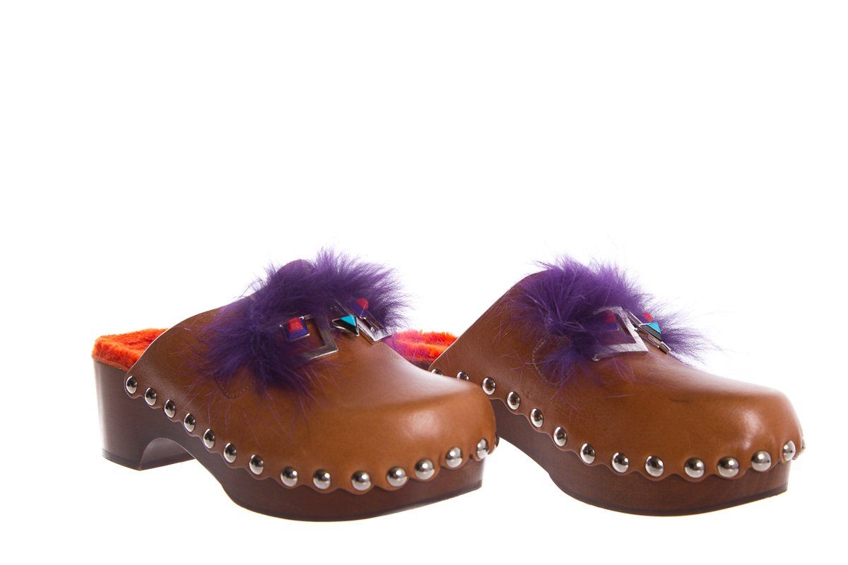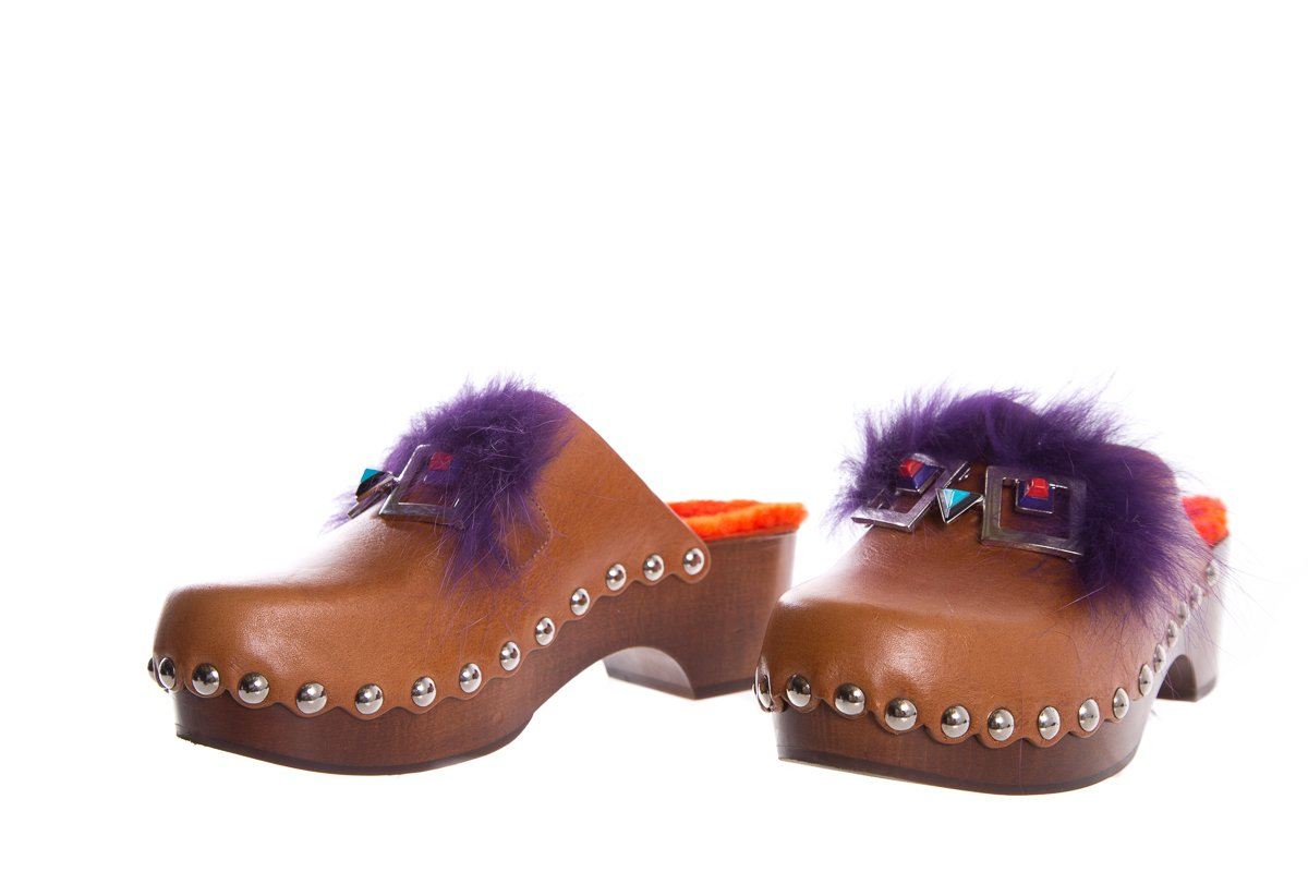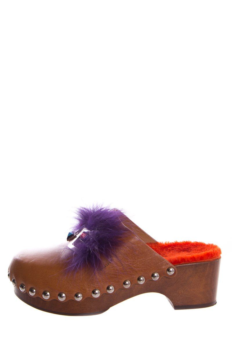 Brown leather Square Eye Fendi clogs featuring a round toe, two-tone pyramid studs & a metal square frame which create the signature Square Eye motif, a purple fur detail, a red shearling insole & a studded wooden sole.