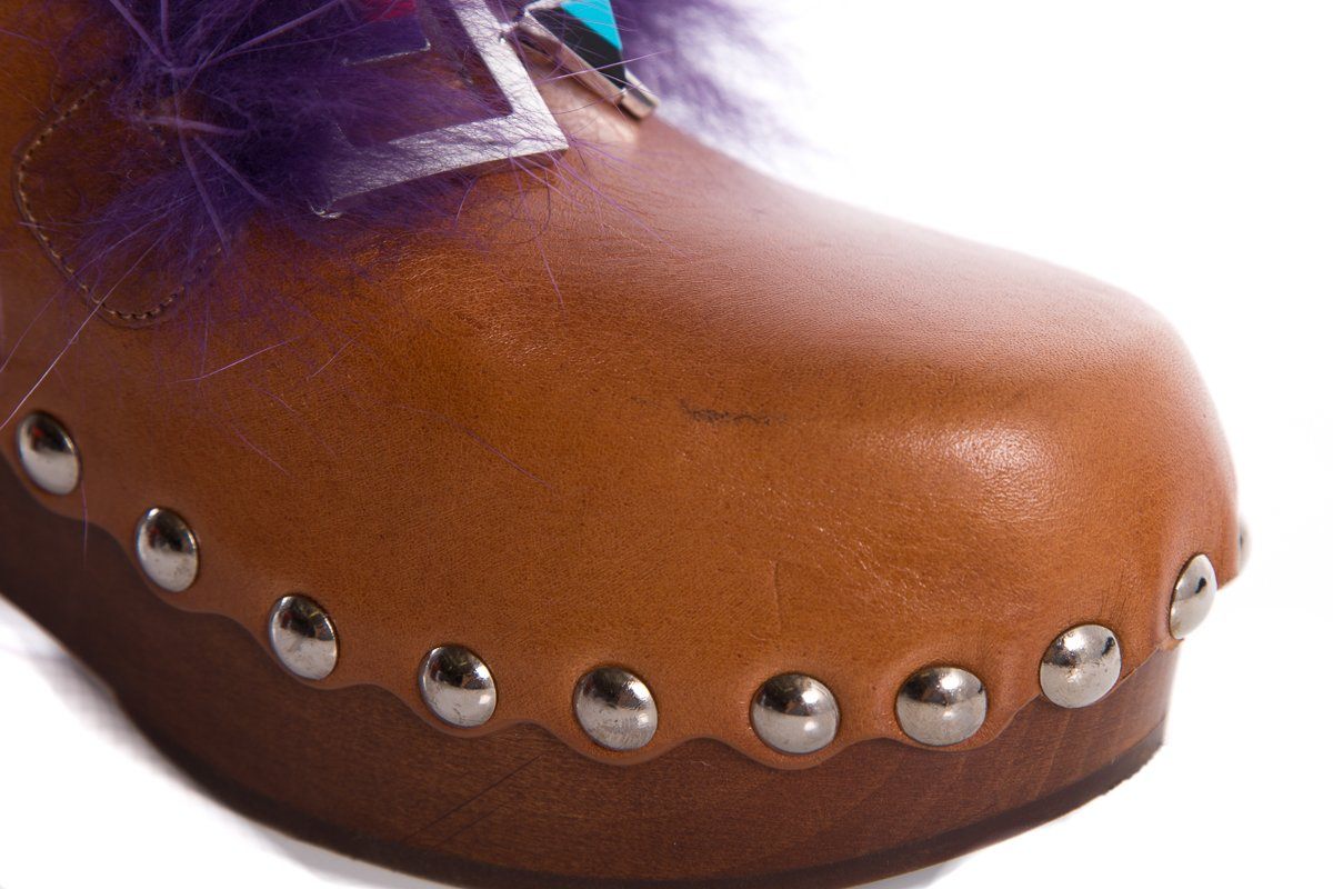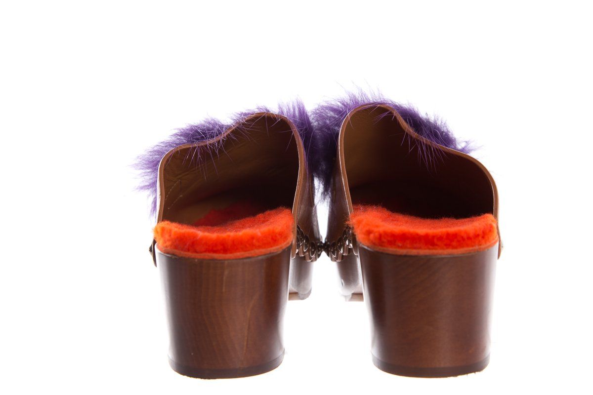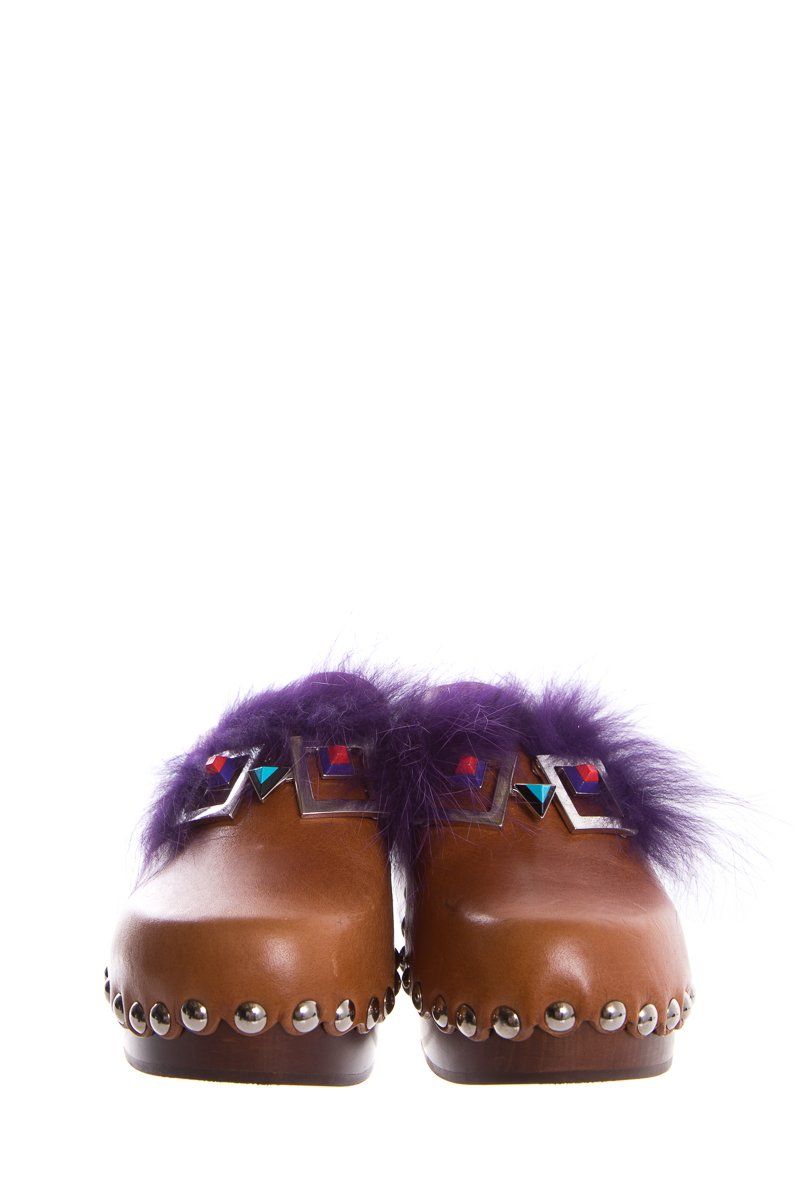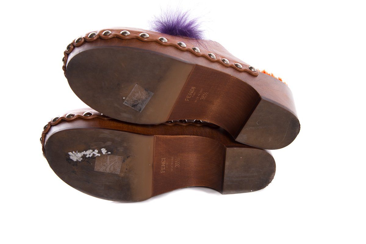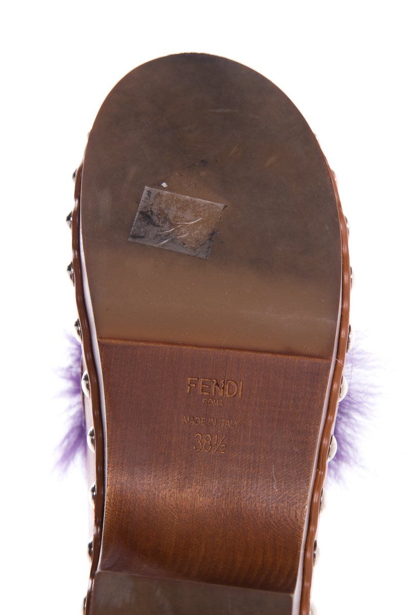 Brown leather Square Eye Fendi clogs featuring a round toe, two-tone pyramid studs & a metal square frame which create the signature Square Eye motif, a purple fur detail, a red shearling insole & a studded wooden sole.