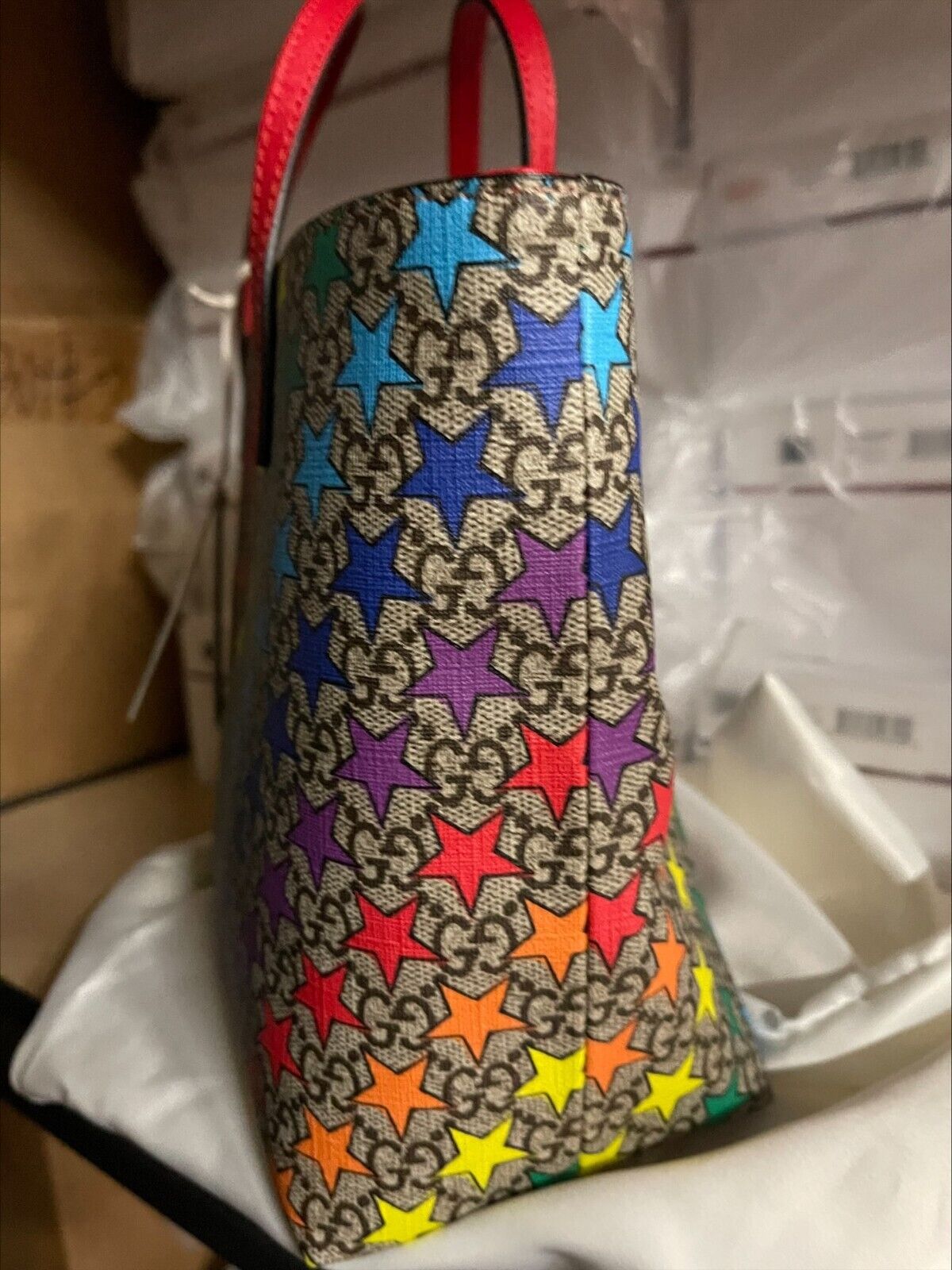 COLORFUL rainbow star prints GG SUPREME with all over print Red leather strap