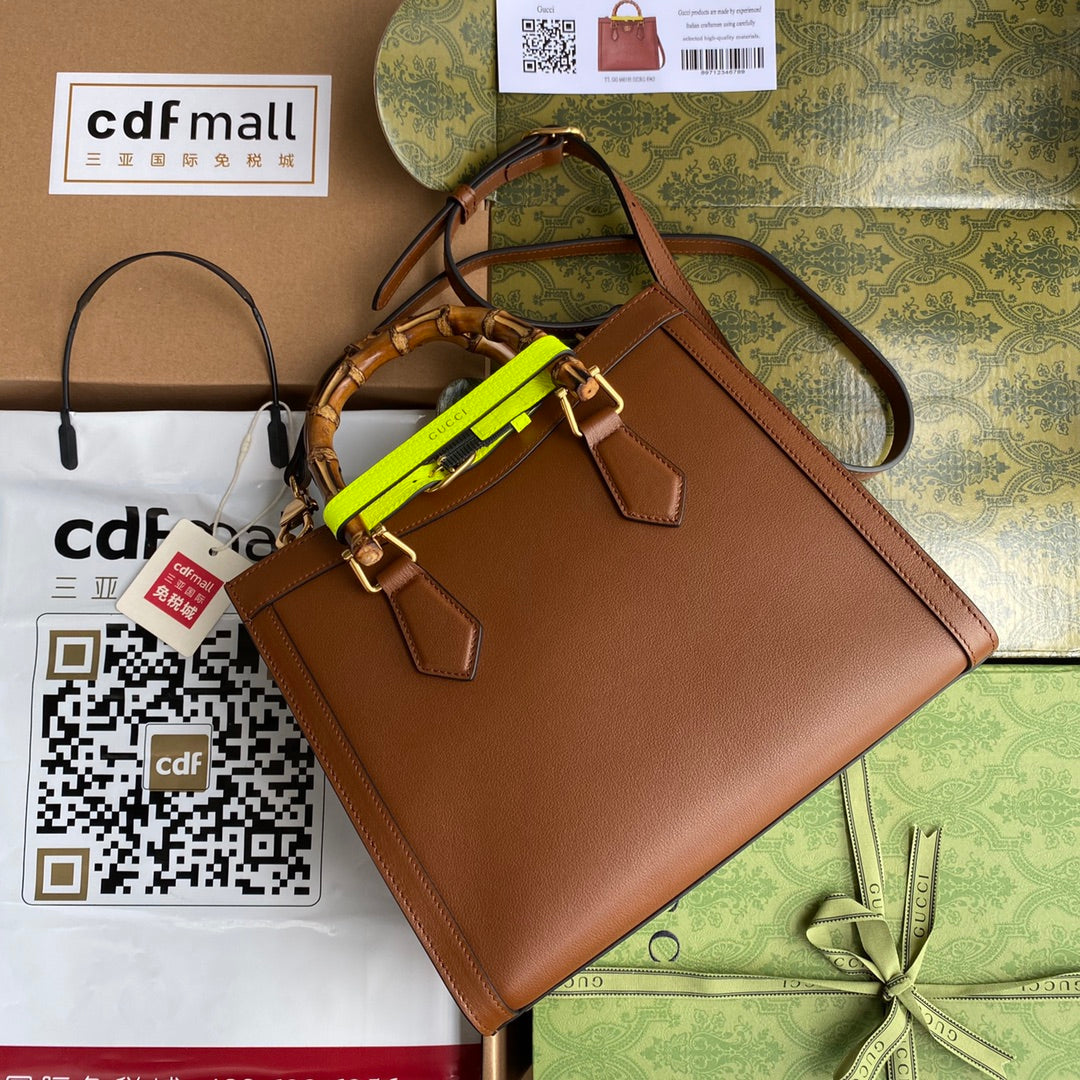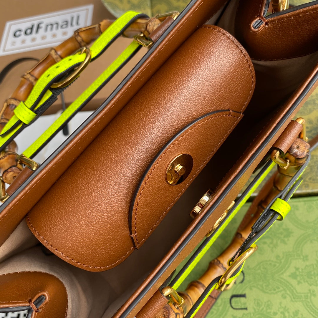 Combining recognizable elements of the House, the medium-sized tote bag is defined by its bamboo handles and Double G hardware. Crafted from brown leather, the accessory is further accentuated by two neon bands, a playful reference to the bands used to keep handles in shape.