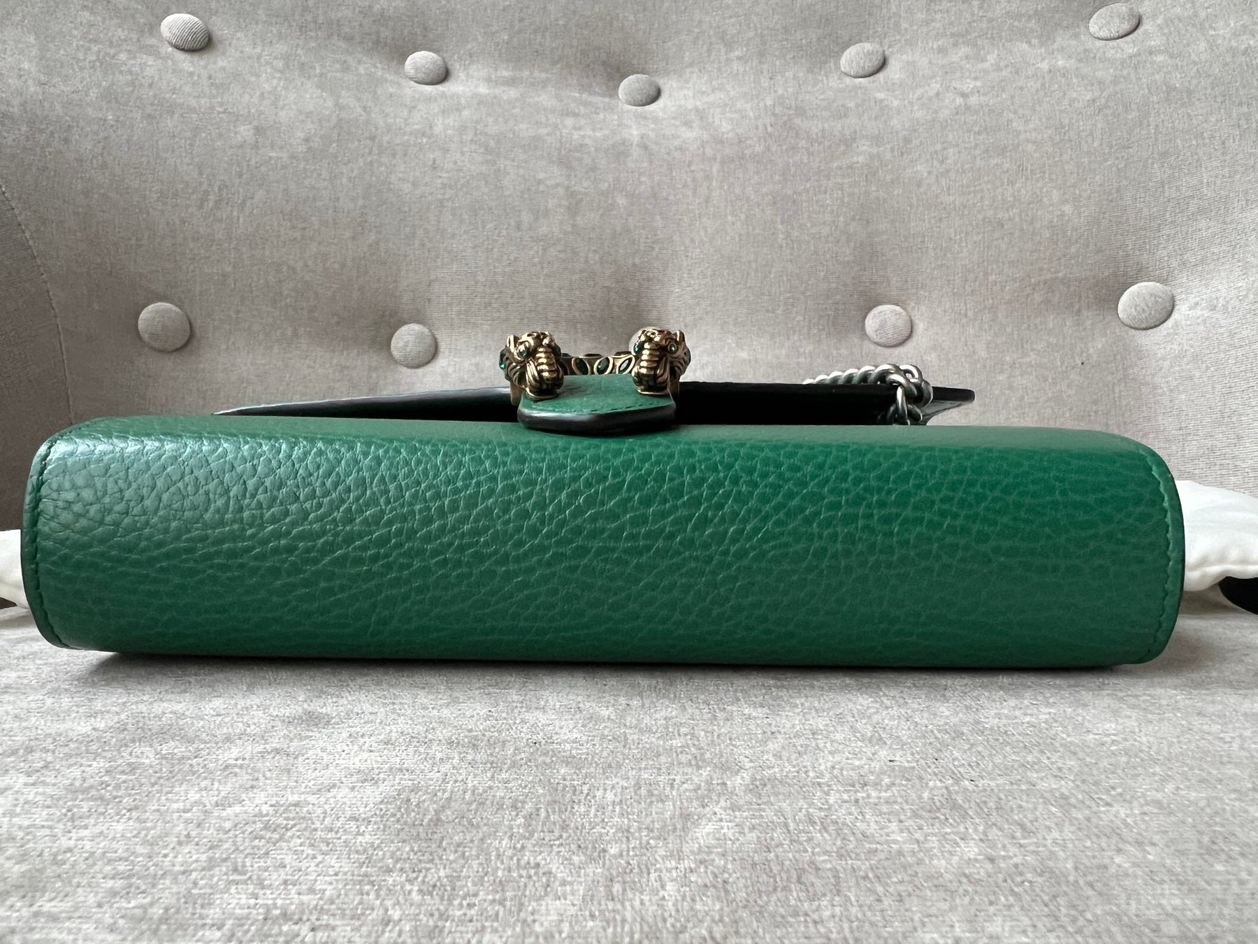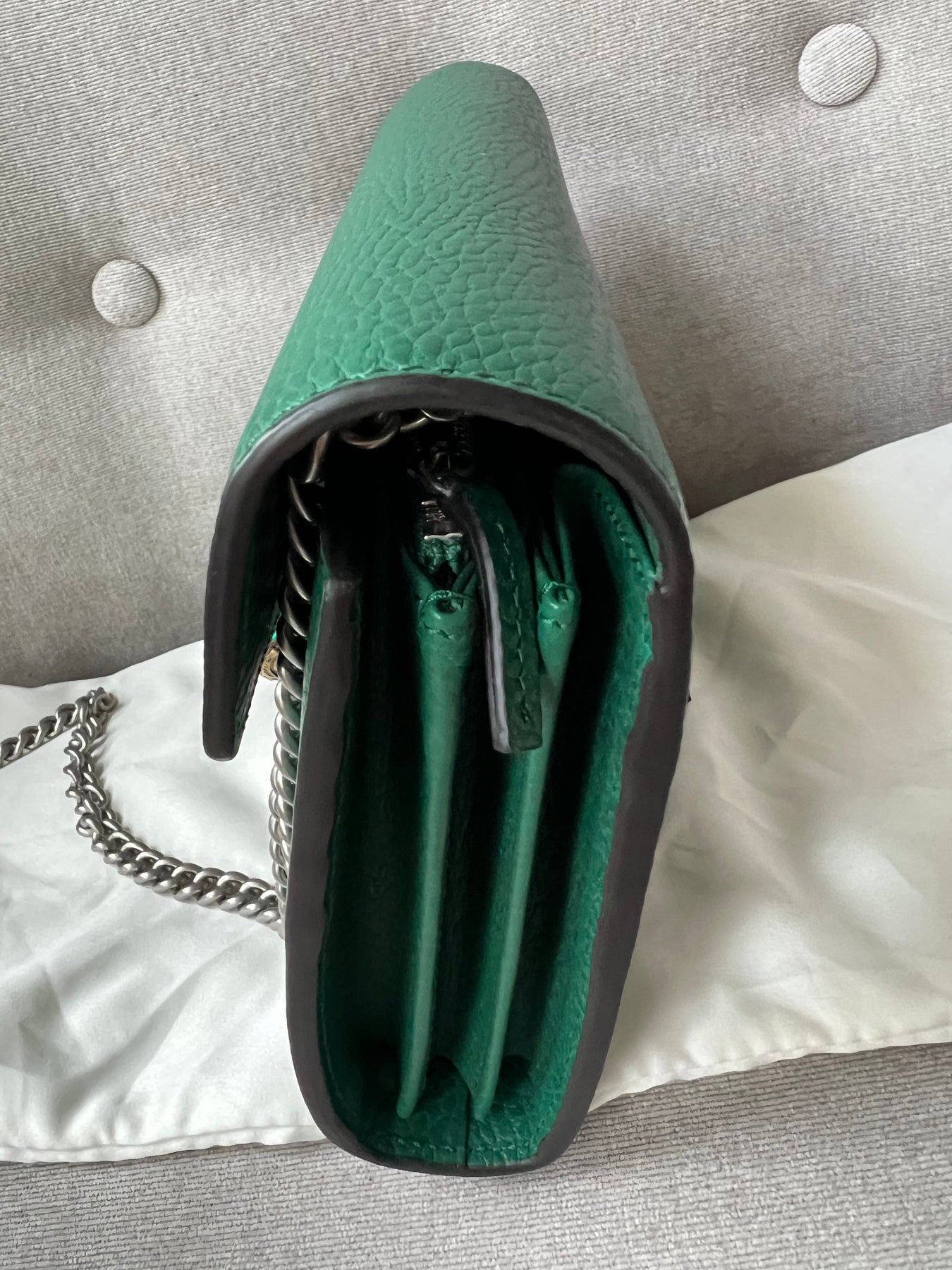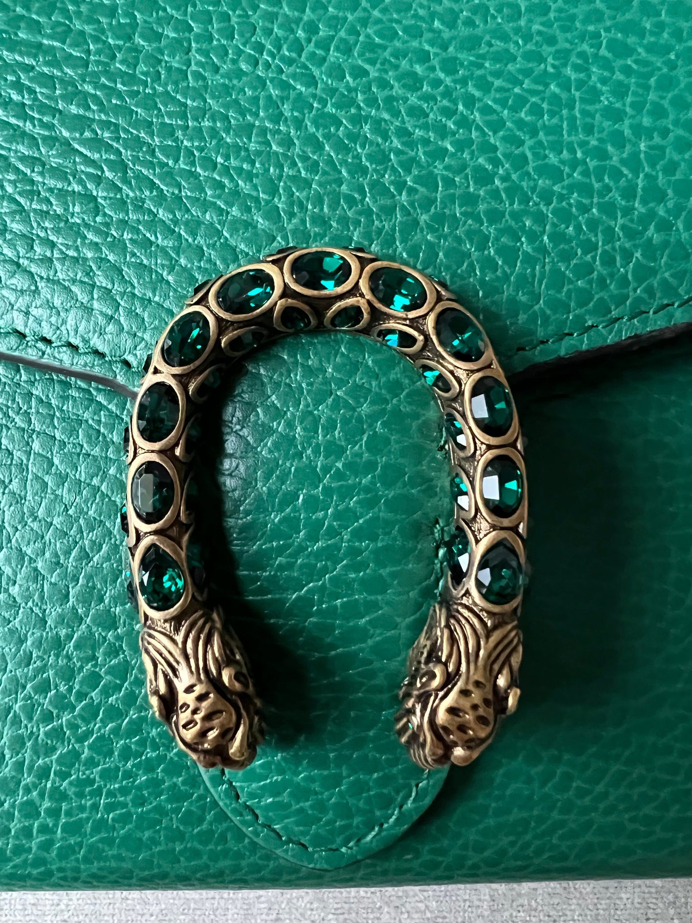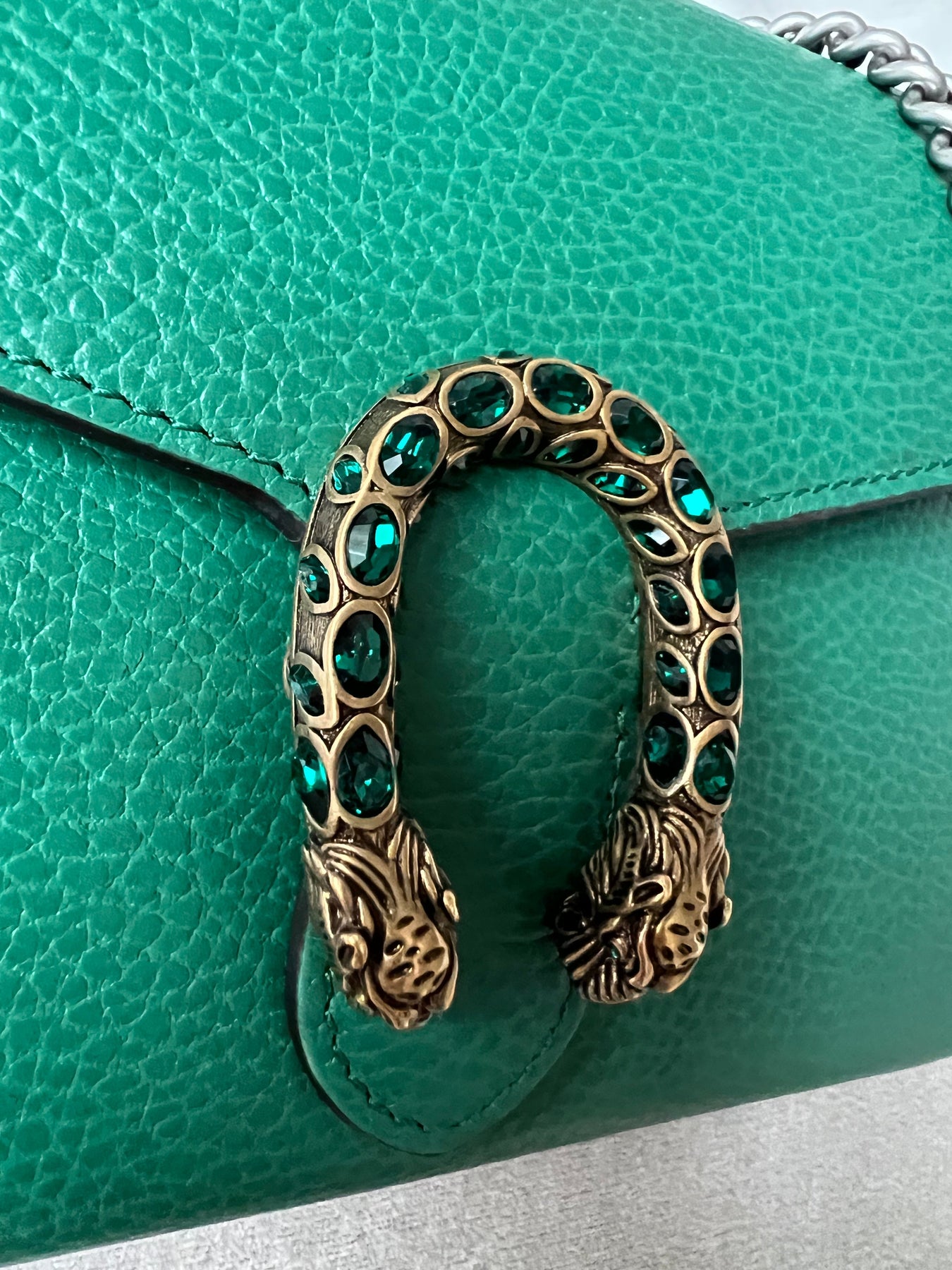 Gucci Dionysus Mini Chain bag in emerald green grained calf leather with antique silver hardware.  This chain wallet style features the textured tiger head press stud closure.  The tiger head is enriched with Swarovski crystal stones.  Ideal for evening or event wear.  Can be carried over the shoulder or cross body, or carried as a handheld clutch with the detachable strap removed.