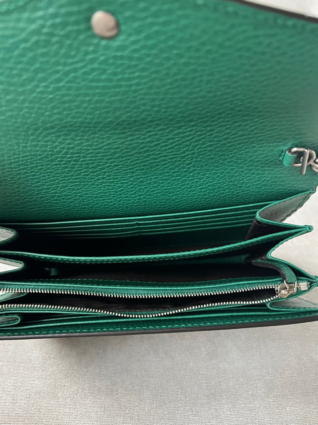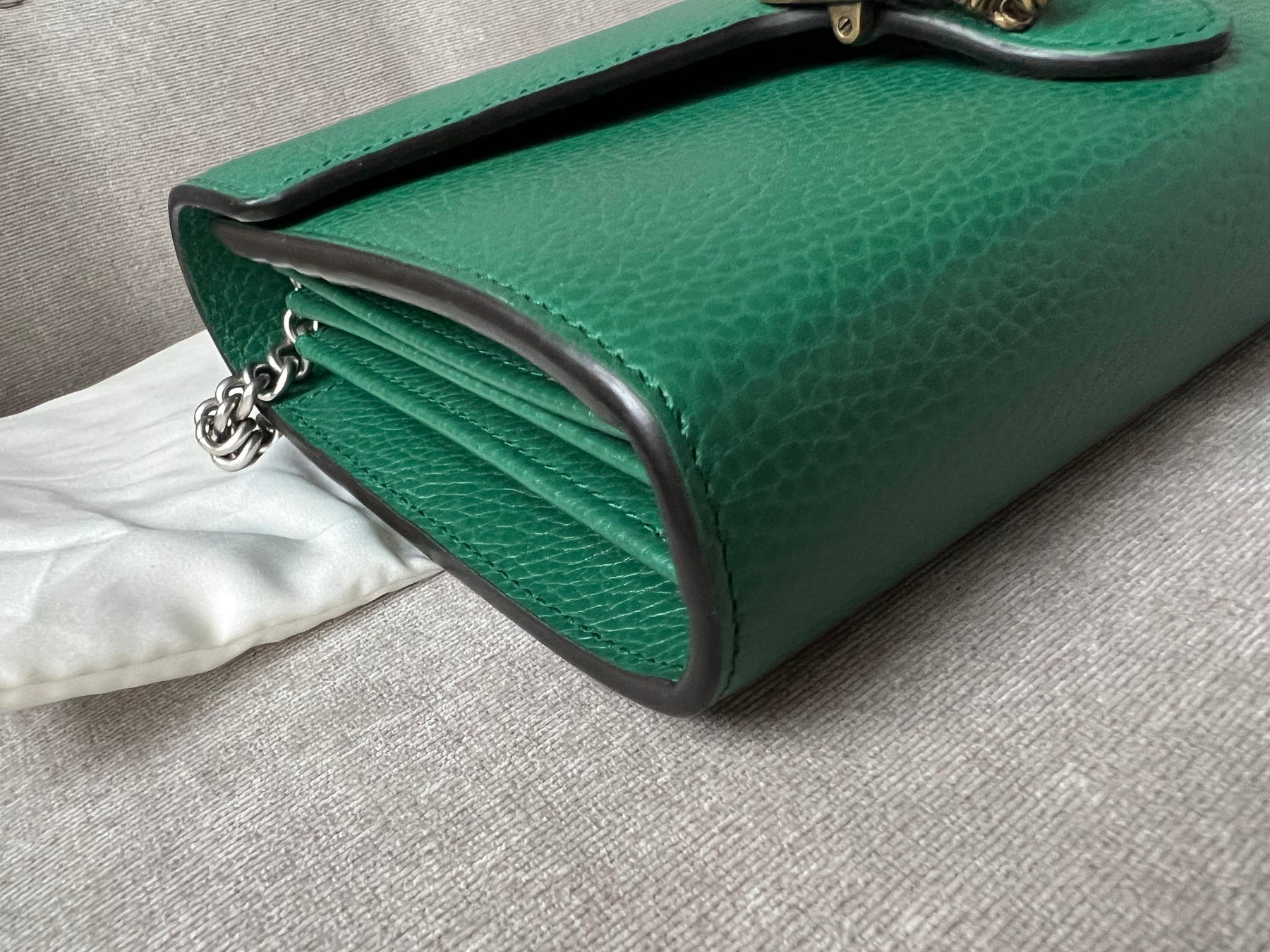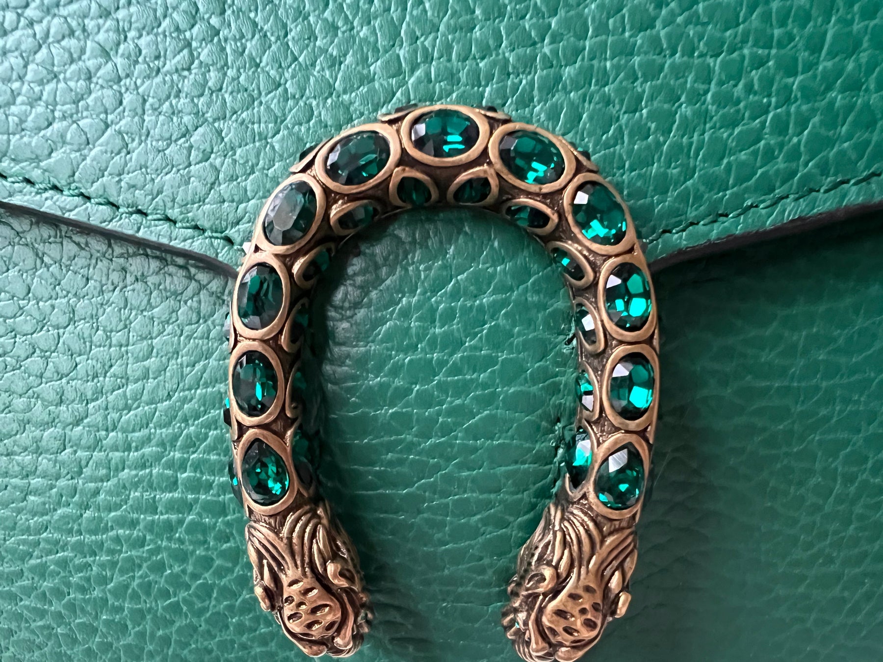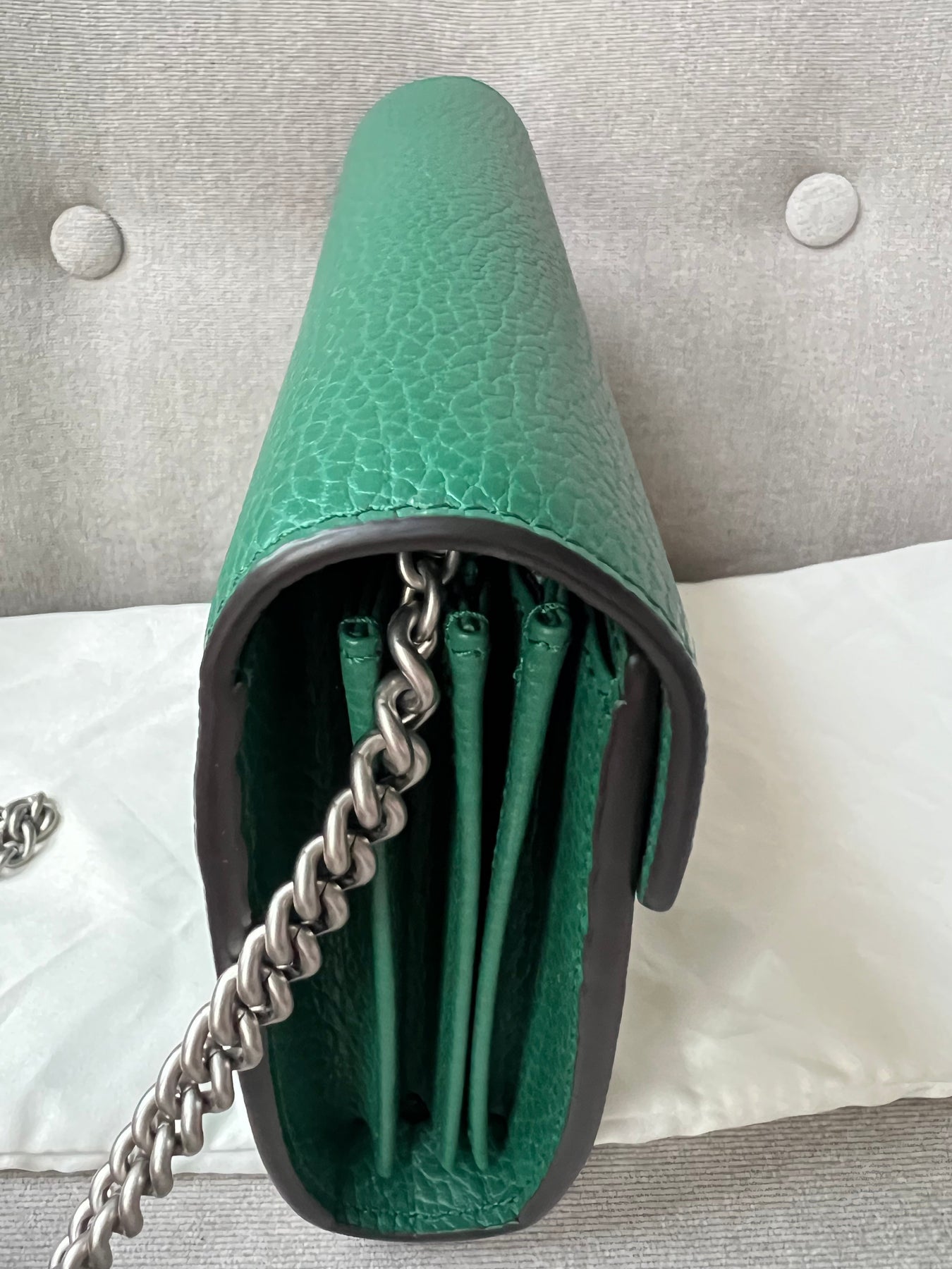 Gucci Dionysus Mini Chain bag in emerald green grained calf leather with antique silver hardware.  This chain wallet style features the textured tiger head press stud closure.  The tiger head is enriched with Swarovski crystal stones.  Ideal for evening or event wear.  Can be carried over the shoulder or cross body, or carried as a handheld clutch with the detachable strap removed.