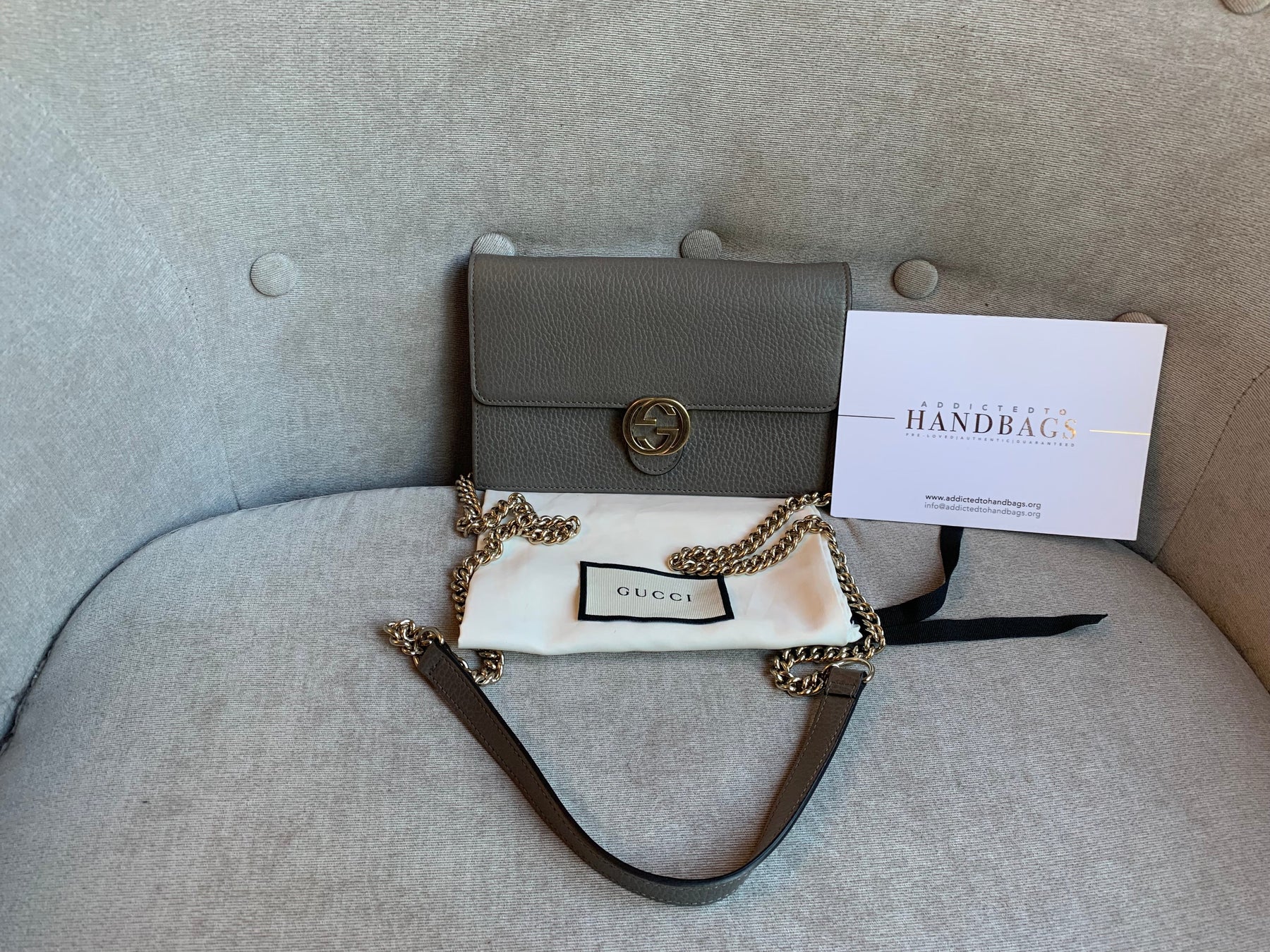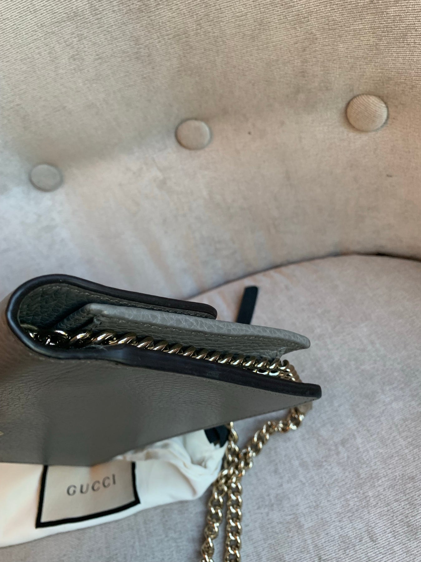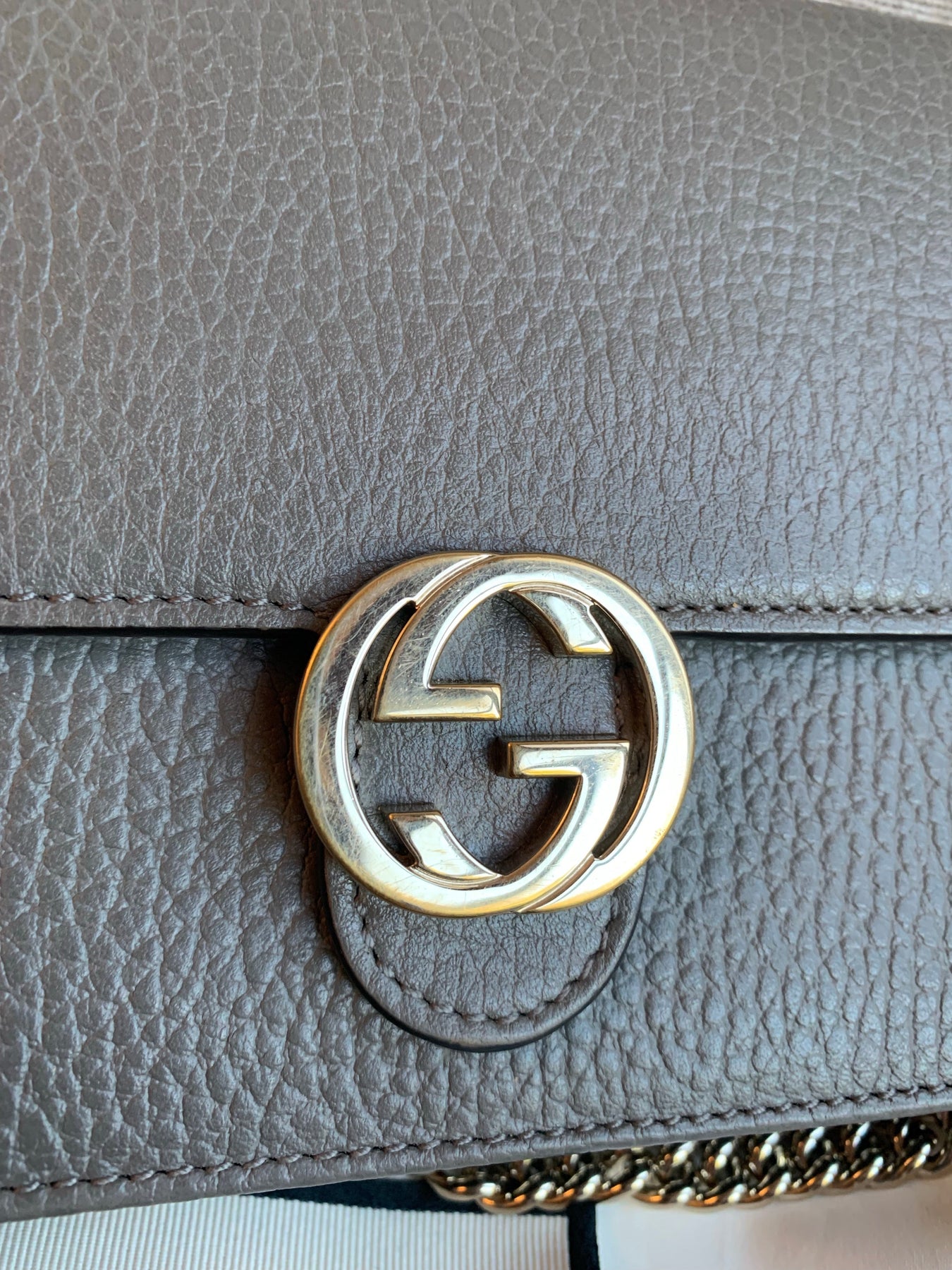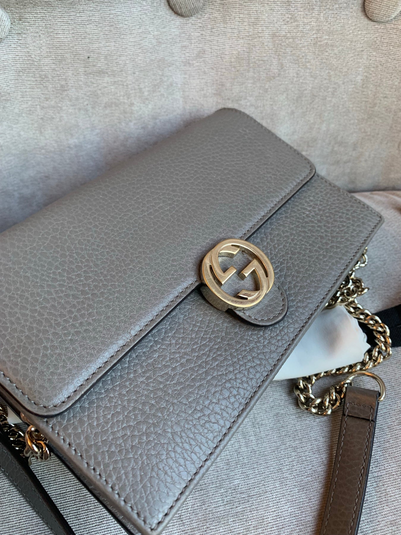 Gucci Interlocking Chain wallet in dollar grey grained leather and pale gold hardware. With the inverted interlocking GG hardware press stud closure, this chain wallet is perfect for evening wear or a night out to carry the essentials. In a stunning grey colour, can be worn cross body or over the shoulder. Please note second image is model shot of this item in black for size reference.