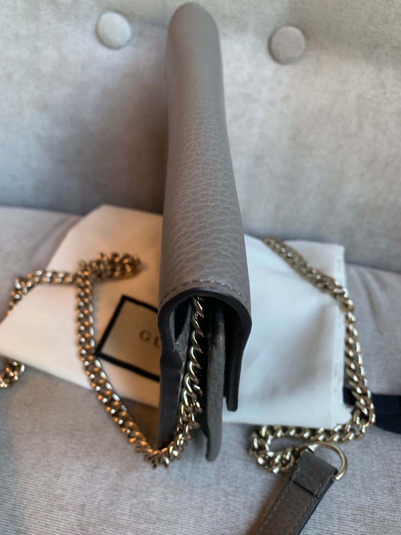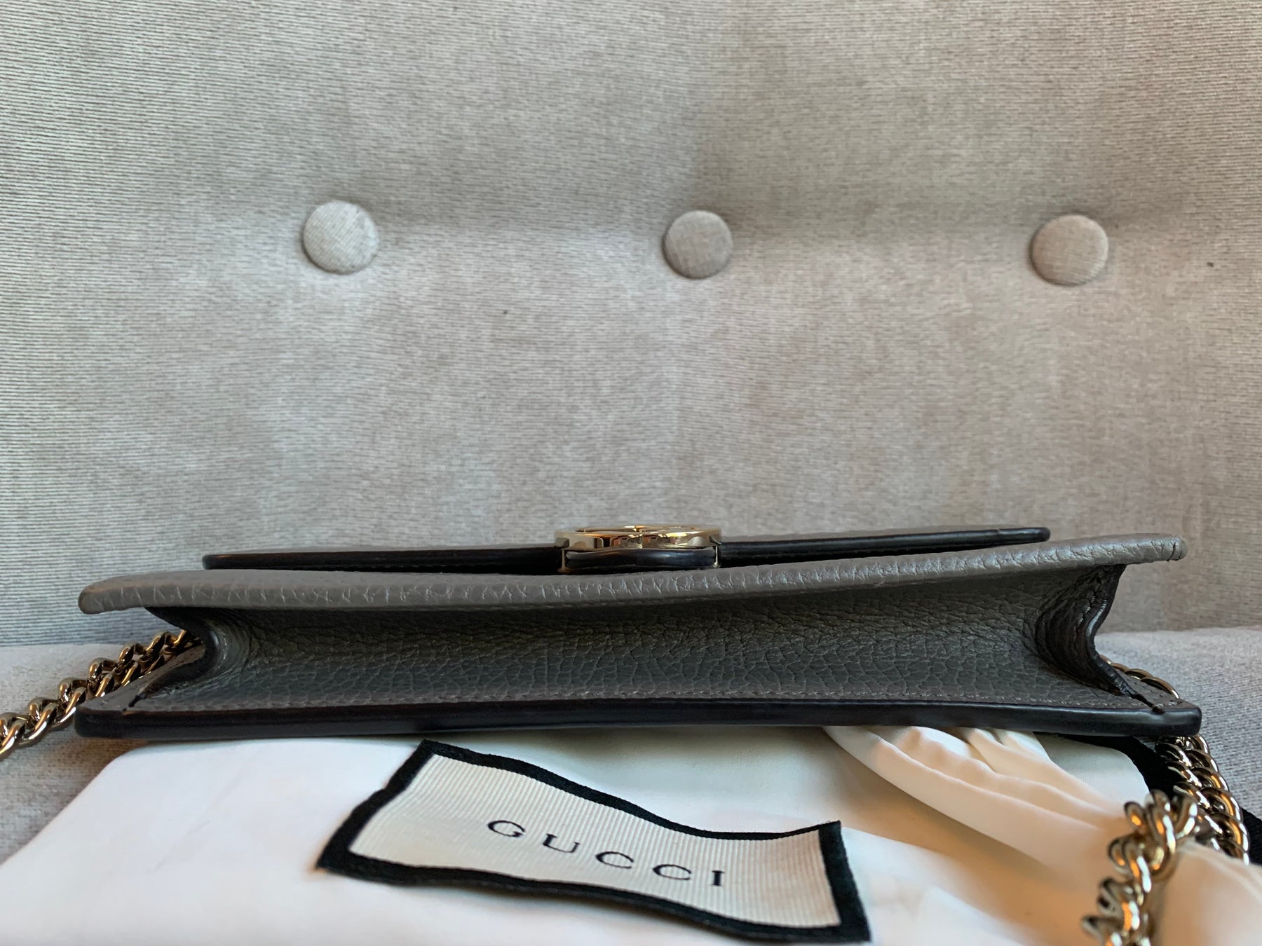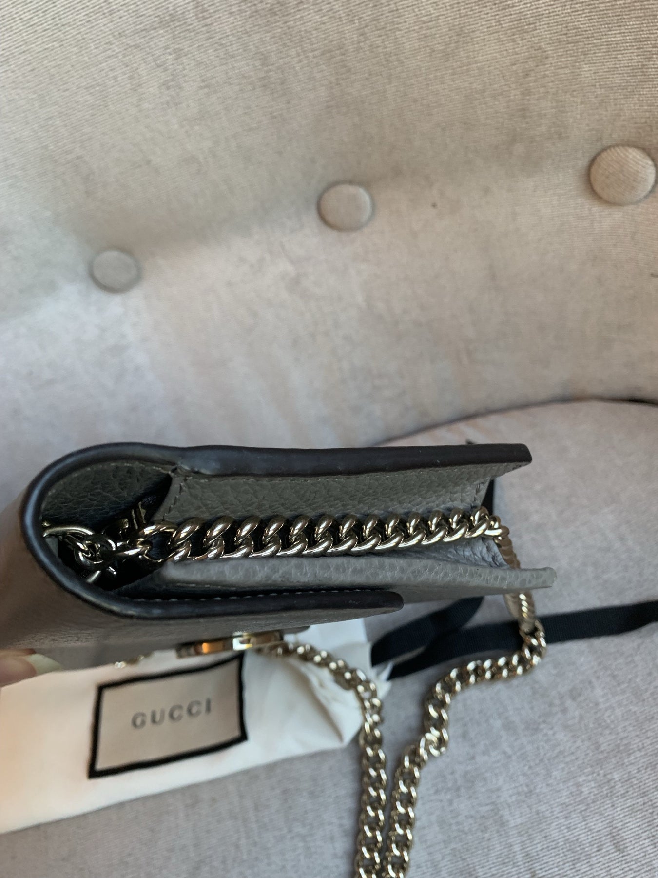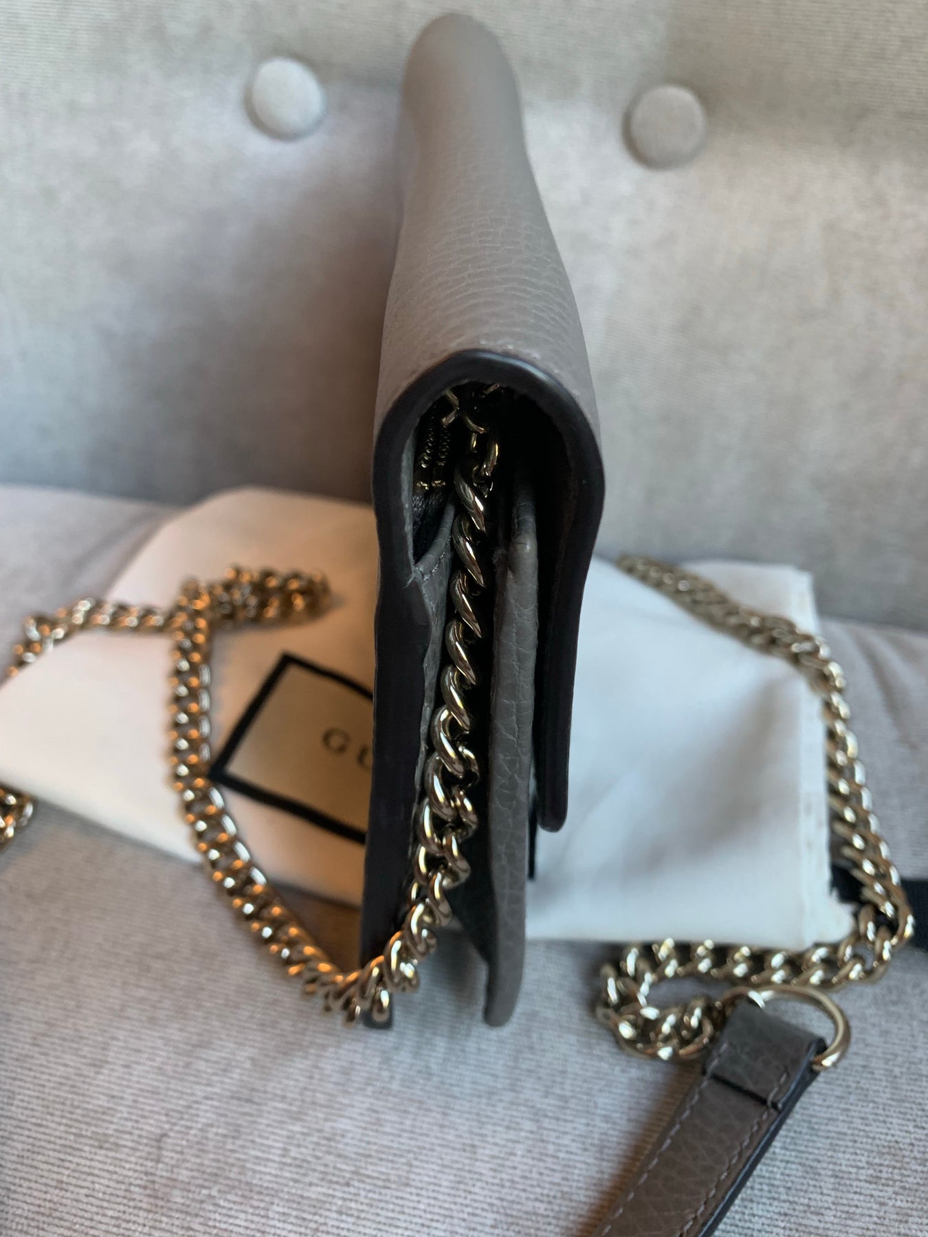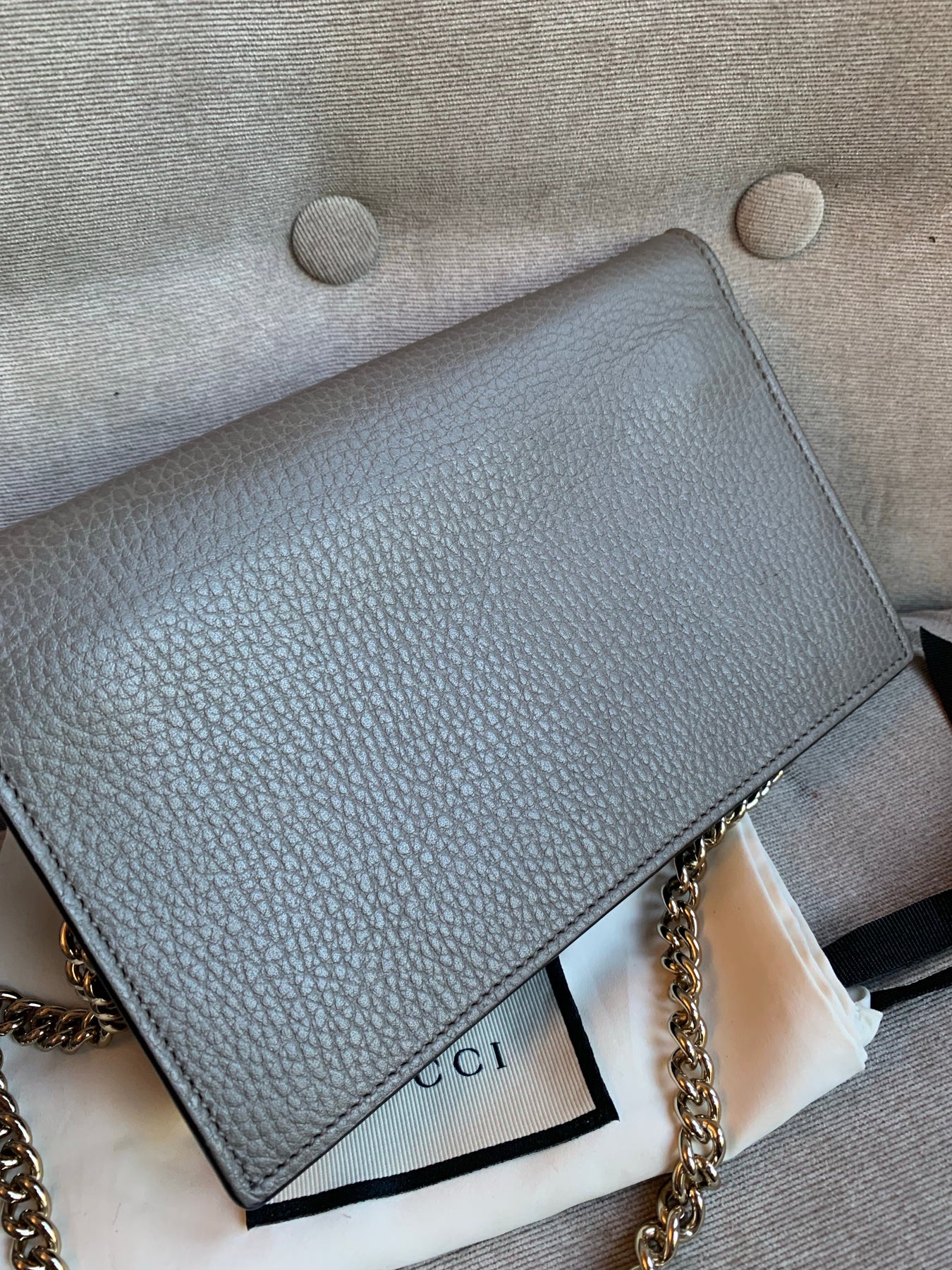 Gucci Interlocking Chain wallet in dollar grey grained leather and pale gold hardware. With the inverted interlocking GG hardware press stud closure, this chain wallet is perfect for evening wear or a night out to carry the essentials. In a stunning grey colour, can be worn cross body or over the shoulder. Please note second image is model shot of this item in black for size reference.