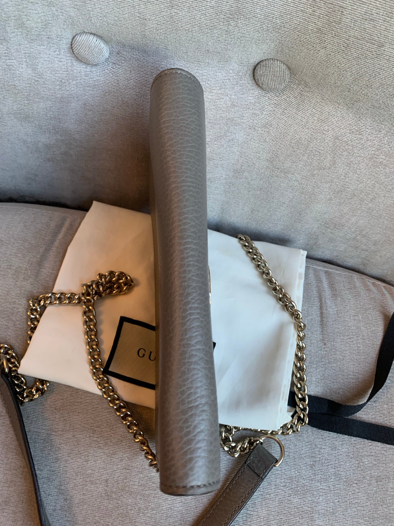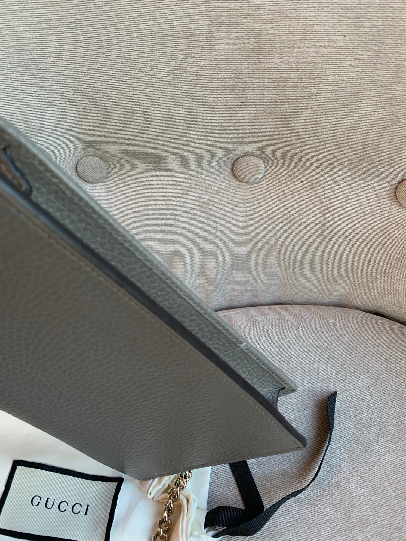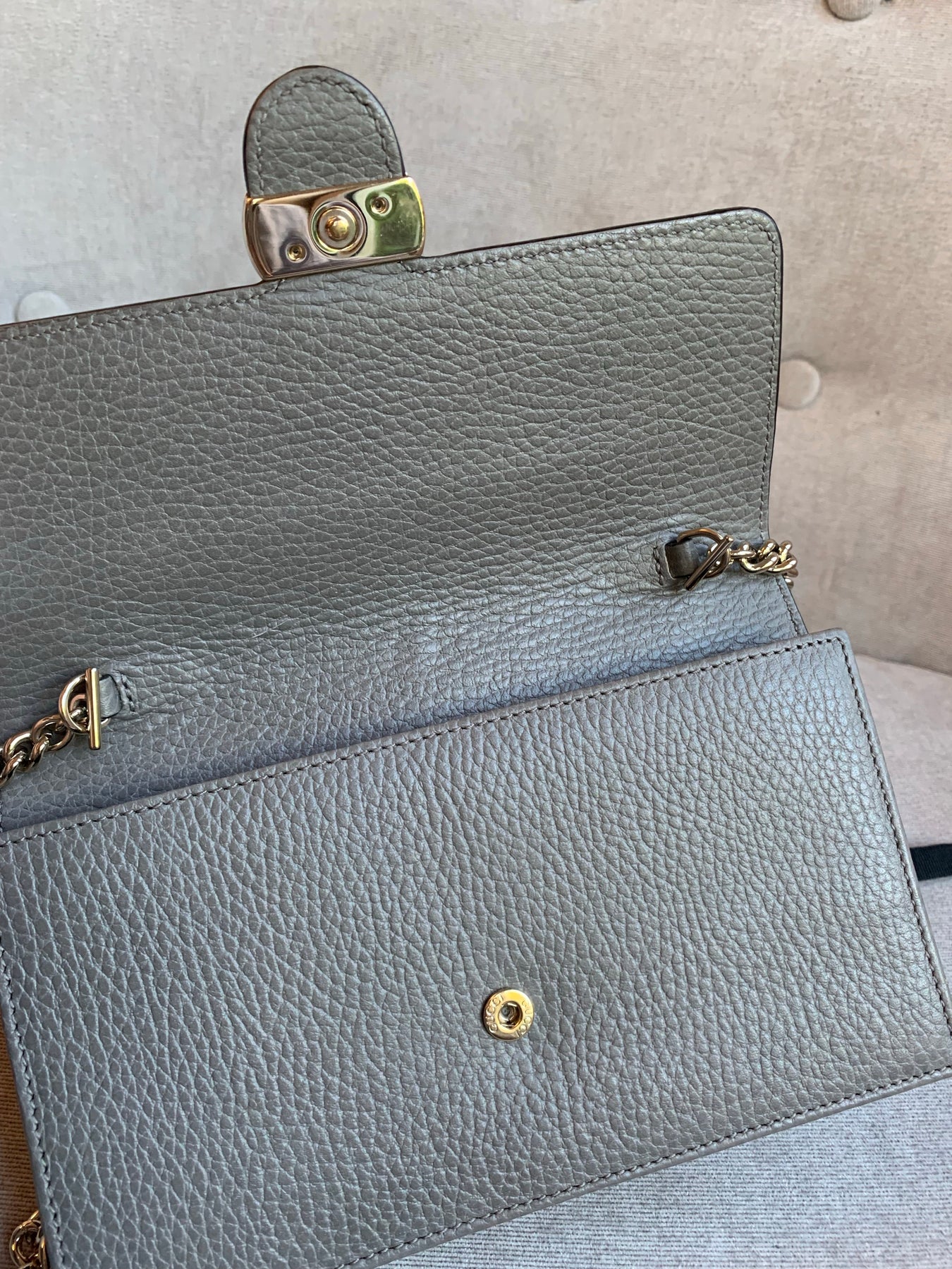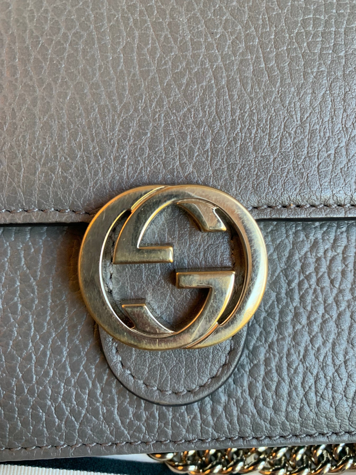 Gucci Interlocking Chain wallet in dollar grey grained leather and pale gold hardware. With the inverted interlocking GG hardware press stud closure, this chain wallet is perfect for evening wear or a night out to carry the essentials. In a stunning grey colour, can be worn cross body or over the shoulder. Please note second image is model shot of this item in black for size reference.