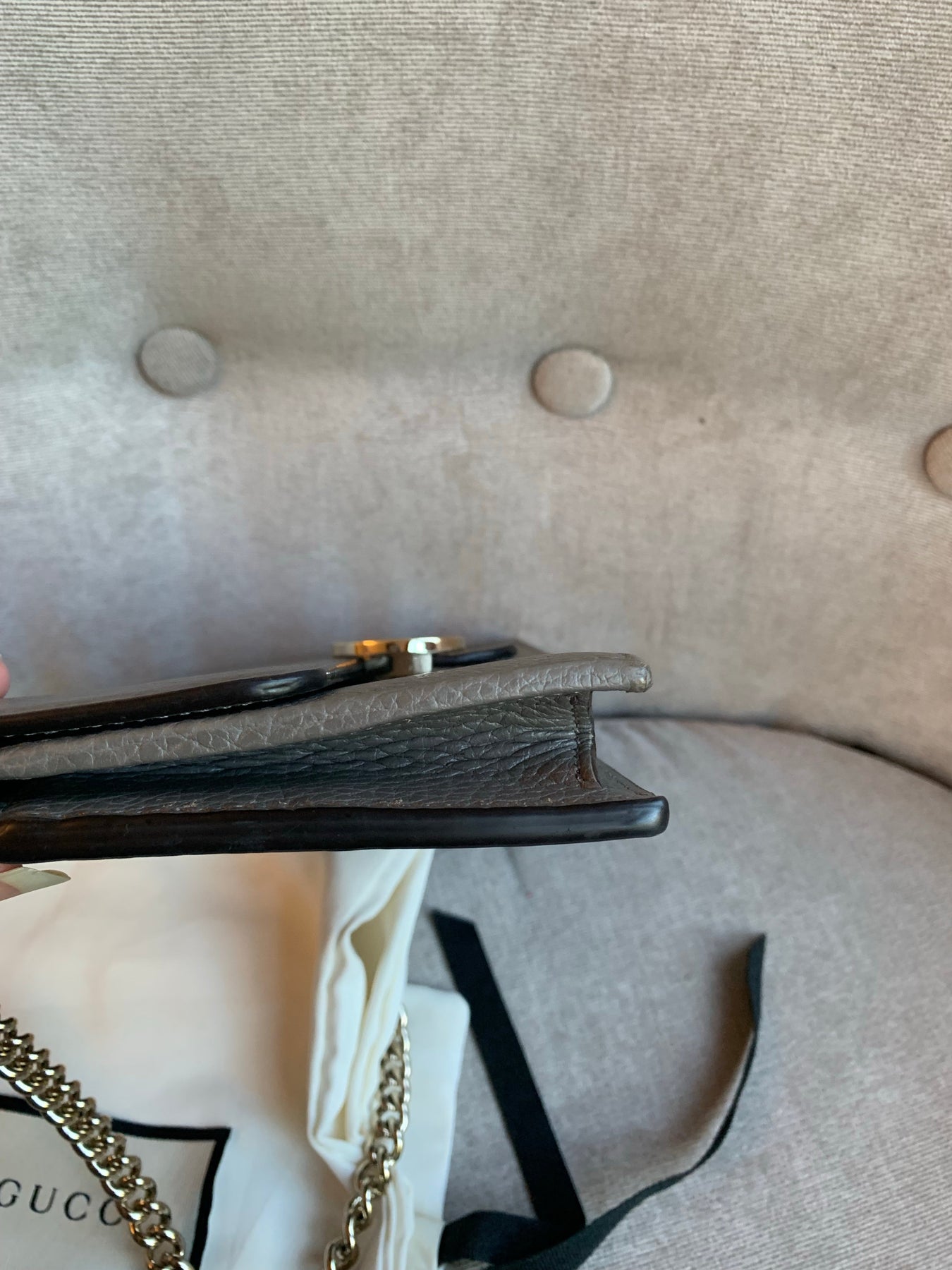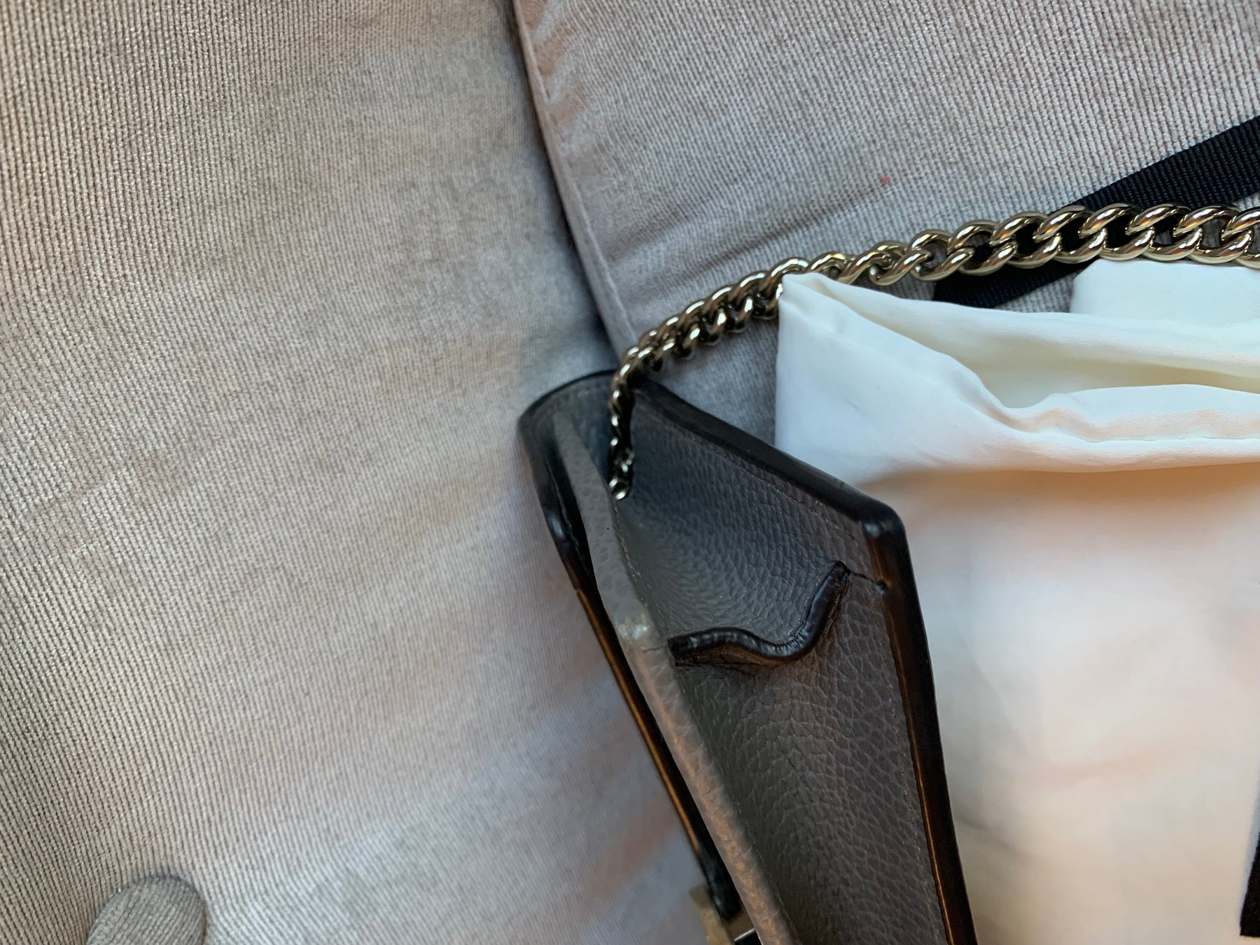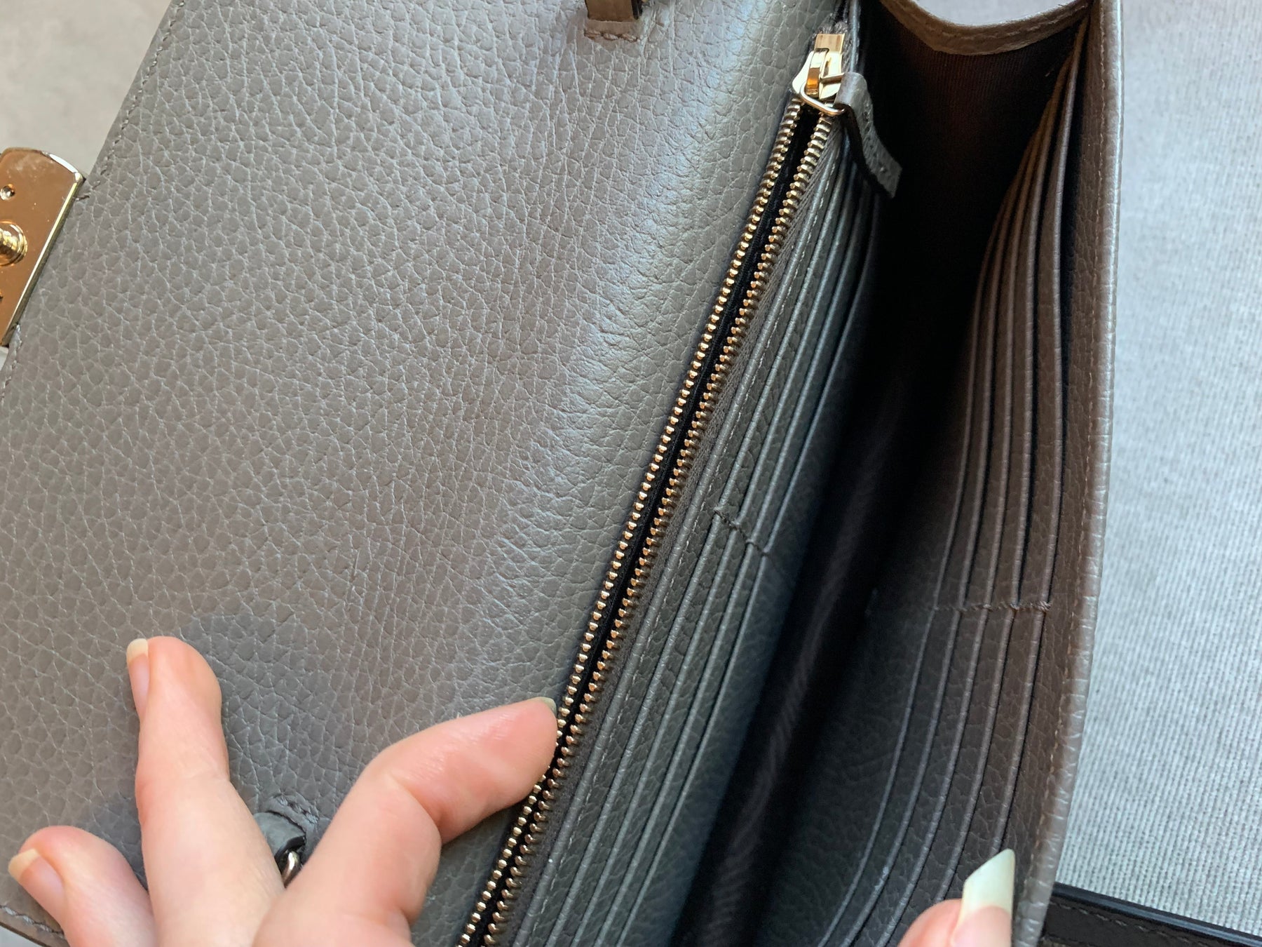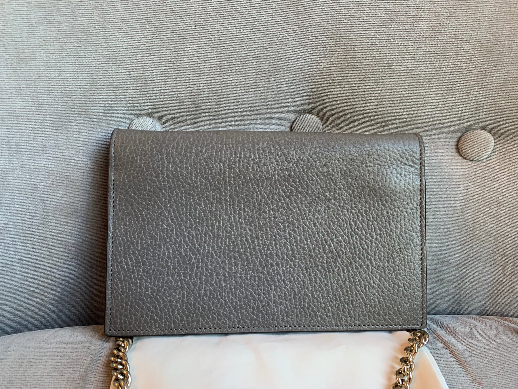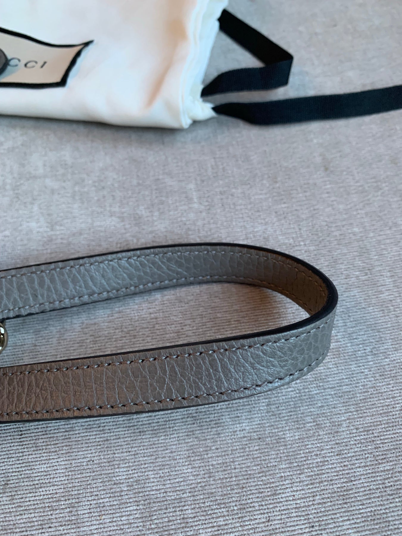 Gucci Interlocking Chain wallet in dollar grey grained leather and pale gold hardware. With the inverted interlocking GG hardware press stud closure, this chain wallet is perfect for evening wear or a night out to carry the essentials. In a stunning grey colour, can be worn cross body or over the shoulder. Please note second image is model shot of this item in black for size reference.