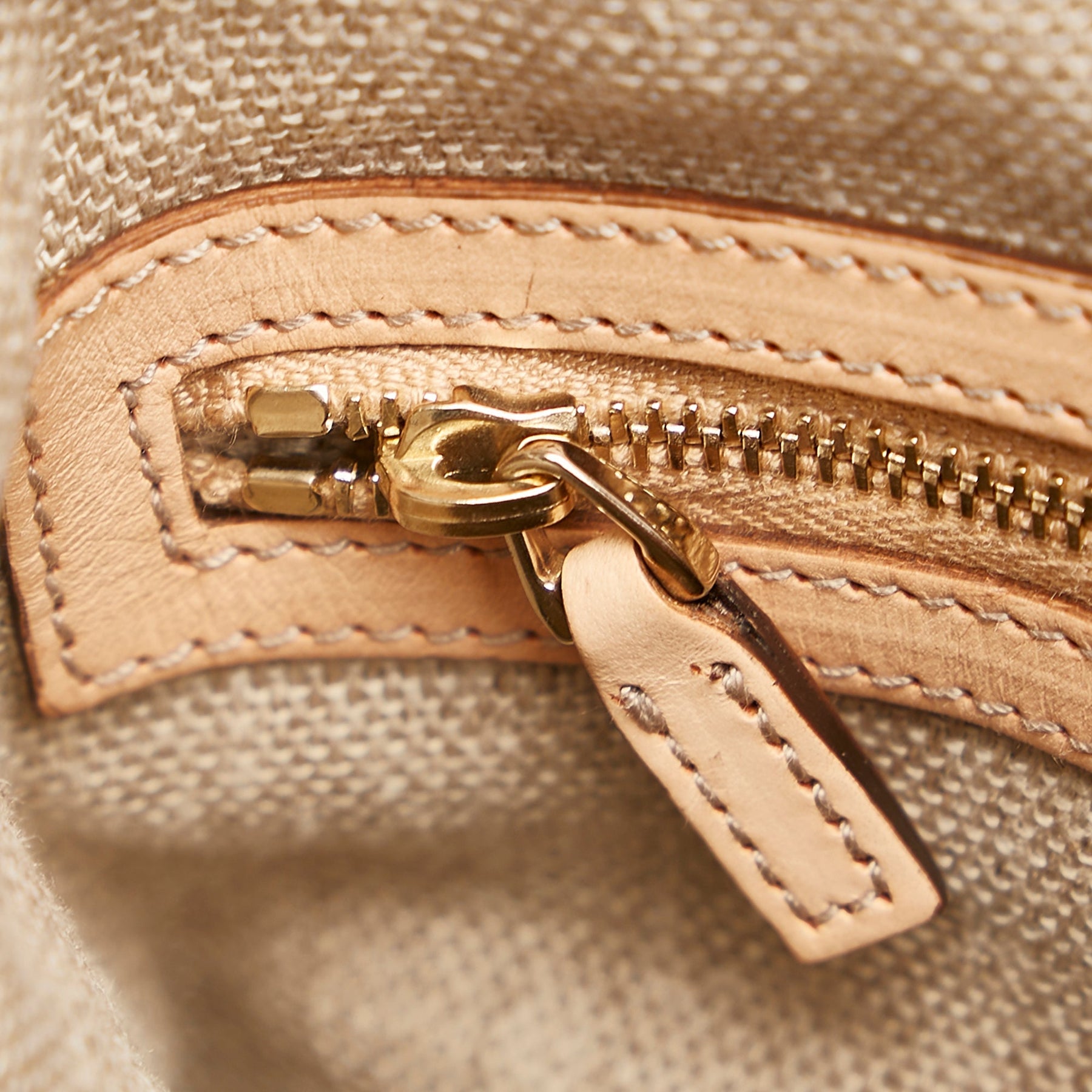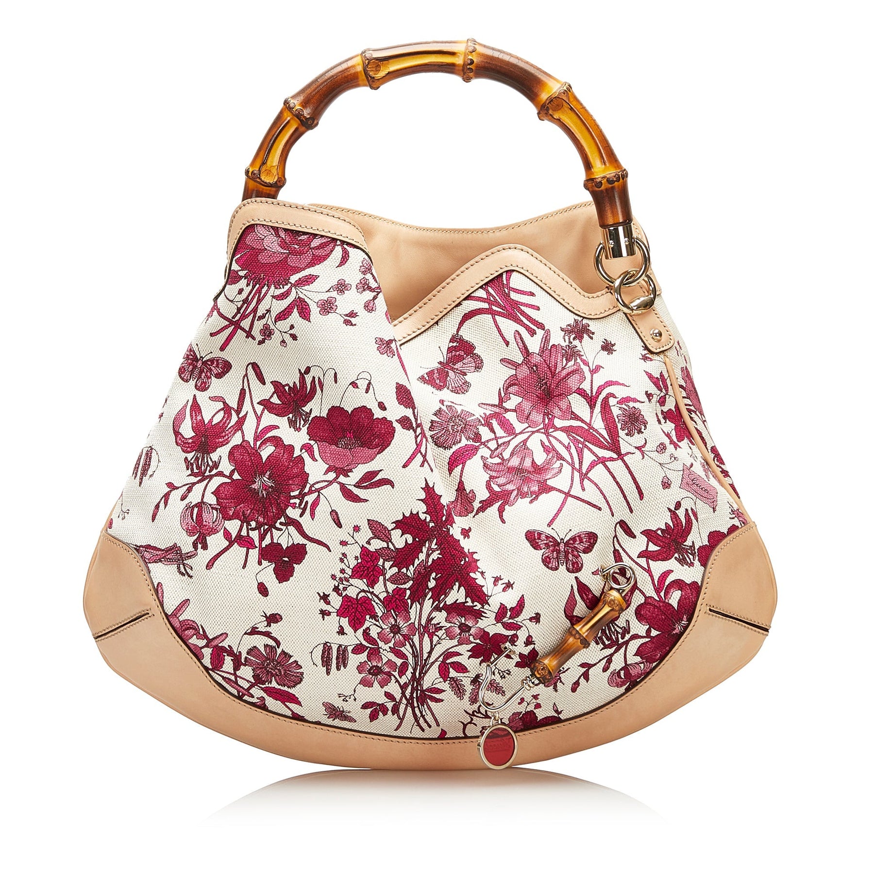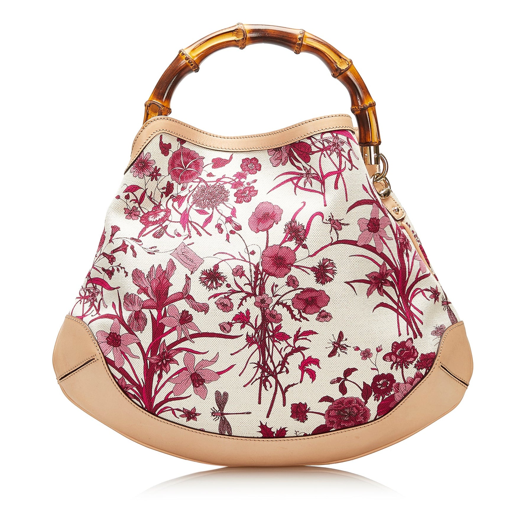 The Flora Peggy Bamboo Satchel features a floral print canvas with leather trim, an open top, a bamboo handle, a flat leather shoulder strap, and an interior zip pocket.
