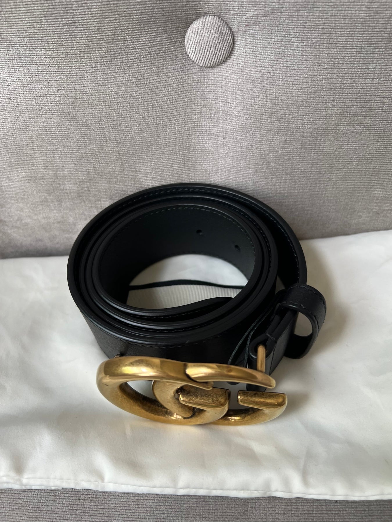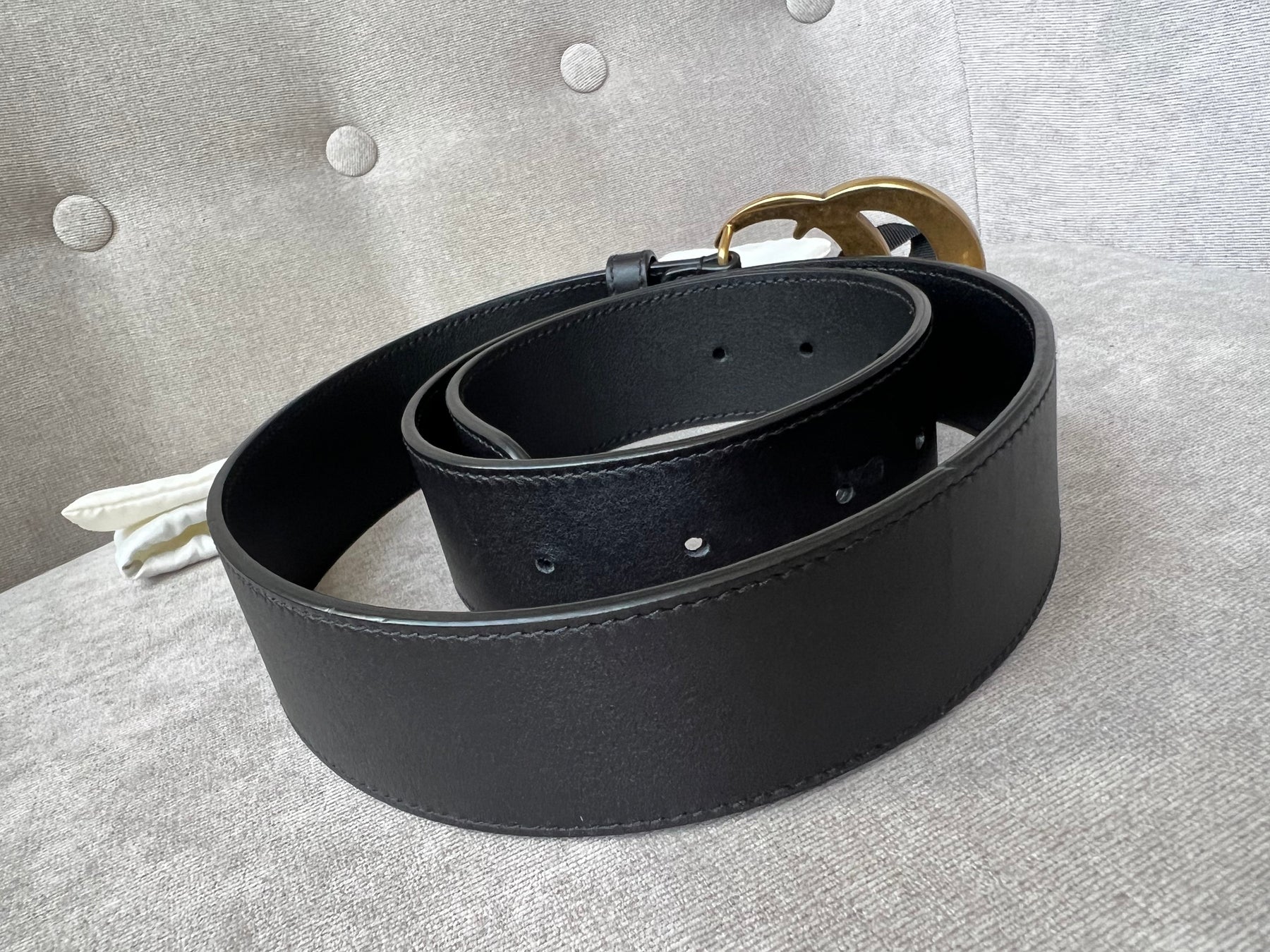 Gucci Black Marmont Re-edition Wide Leather Belt with Antique gold Buckle. Note an extra hole has been punched to enable it to be worn smaller.
