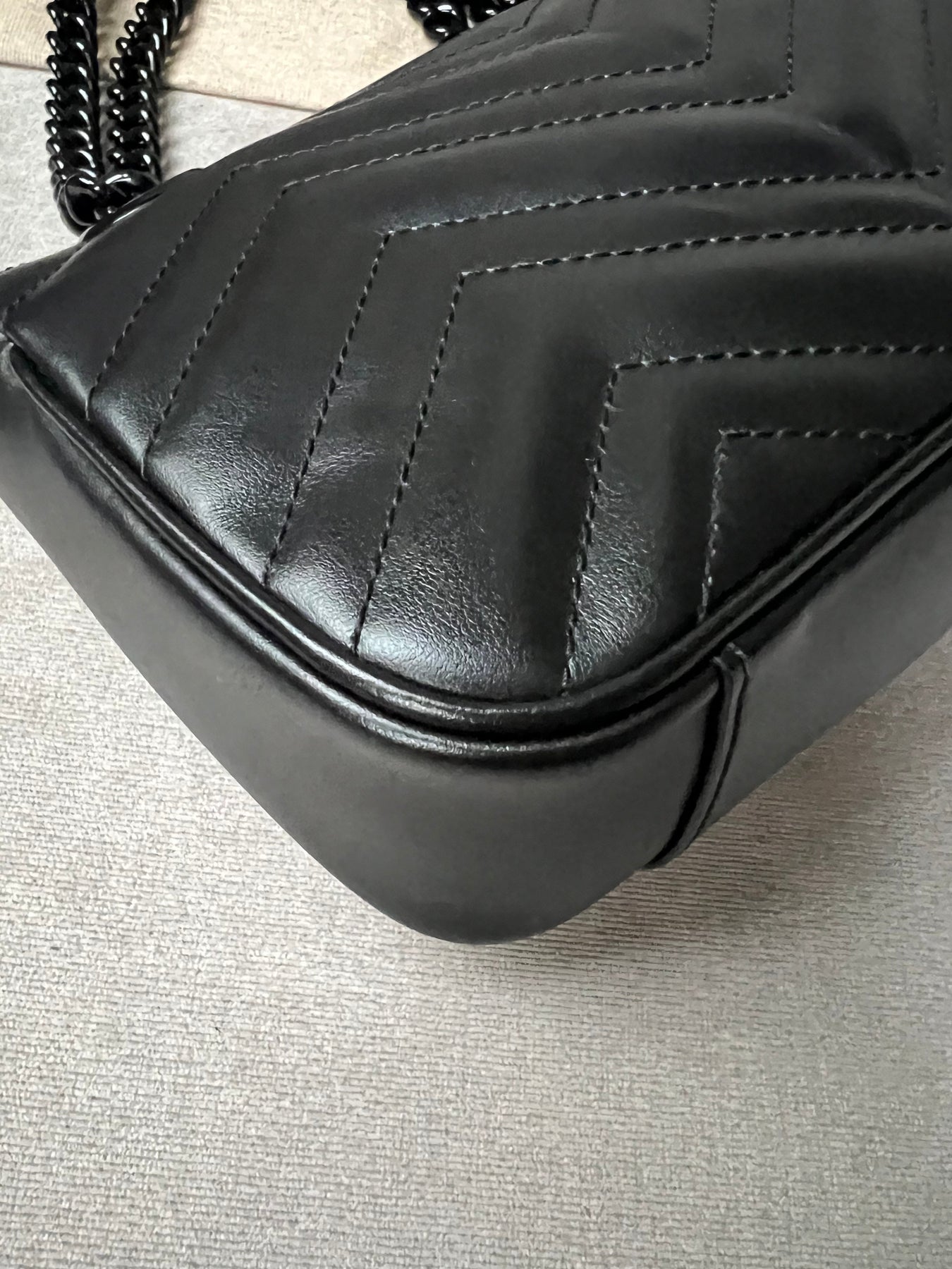 Gucci GG Marmont mini shoulder bag in black matelasse chevron leather with black coated hardware. This mini Marmont bag has a softly structured shape and an oversized flap with GG hardware and heart detail on the back.  The sliding chain can be worn multiple ways either doubled up or lengthened.  Effortlessly chic and sophisticated, this style can be worn both with a casual outfit or for evening wear.  Suitable for both day to day or occasion wear and ideal for those who prefer a cross body option.  The highly sought after “black on black” does not come up preloved often.