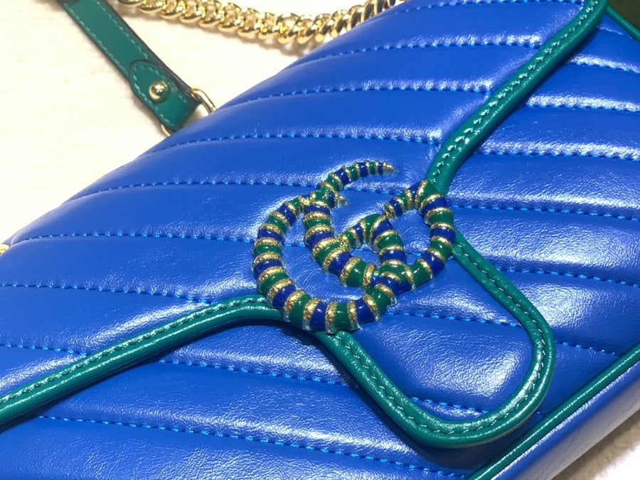 Signature styles from the Beloved lines are presented in vibrant colors that recall precious gems. Here the GG Marmont is introduced in sapphite toned blue leather with a diagonal matelassé finish. The shoulder bag is completed by its signature Double G hardware, enhanced by tonal enamel details.