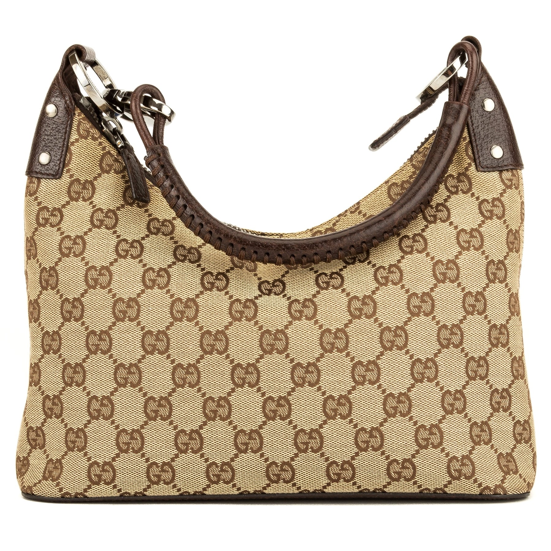This is an authentic, pre-owned GUCCI Classic Ring Tote Bag. It's a chic, medium-sized vintage Gucci handbag for any occasion. This hobo-style handbag features the GG Monogram canvas with a brown leather trim, a detachable rolled handle with stitch detail, and ruthenium hardware. The interior has a fine textile lining with a zip pocket and a zip closure. It's roomy enough to carry your essentials. Comes with original dust bag.